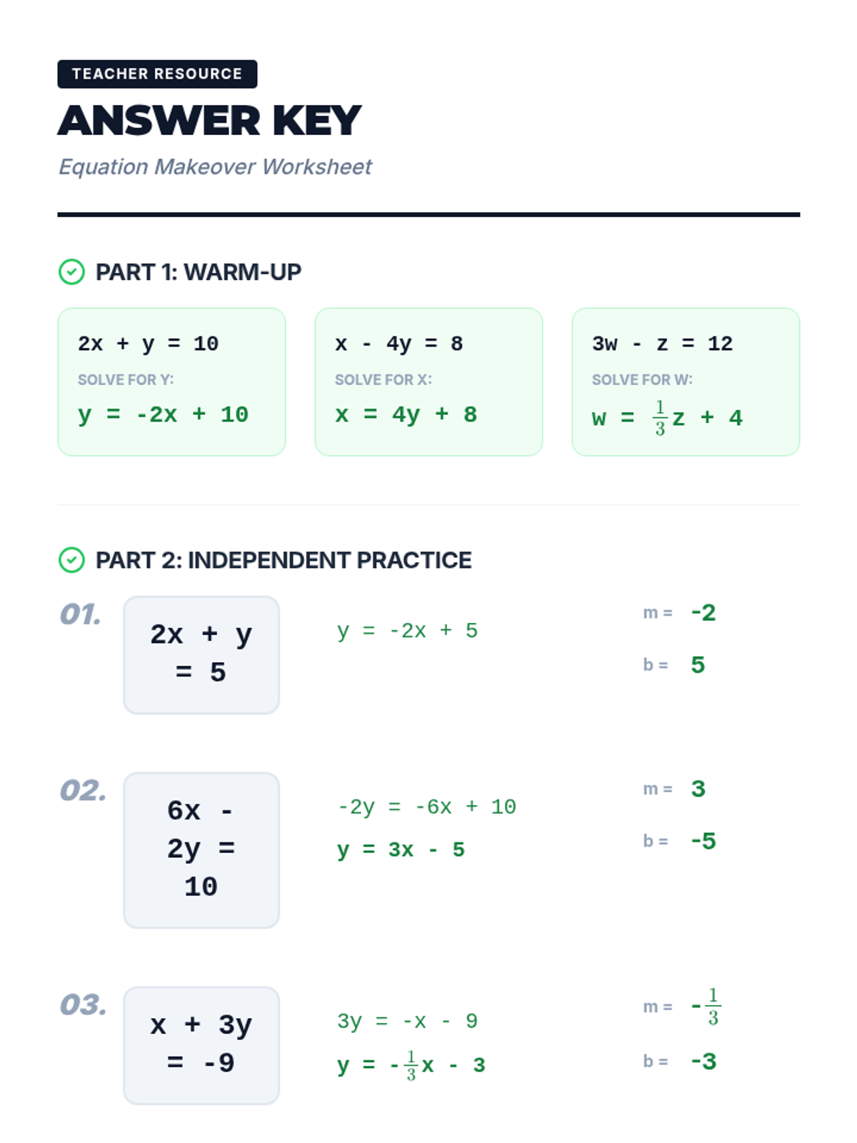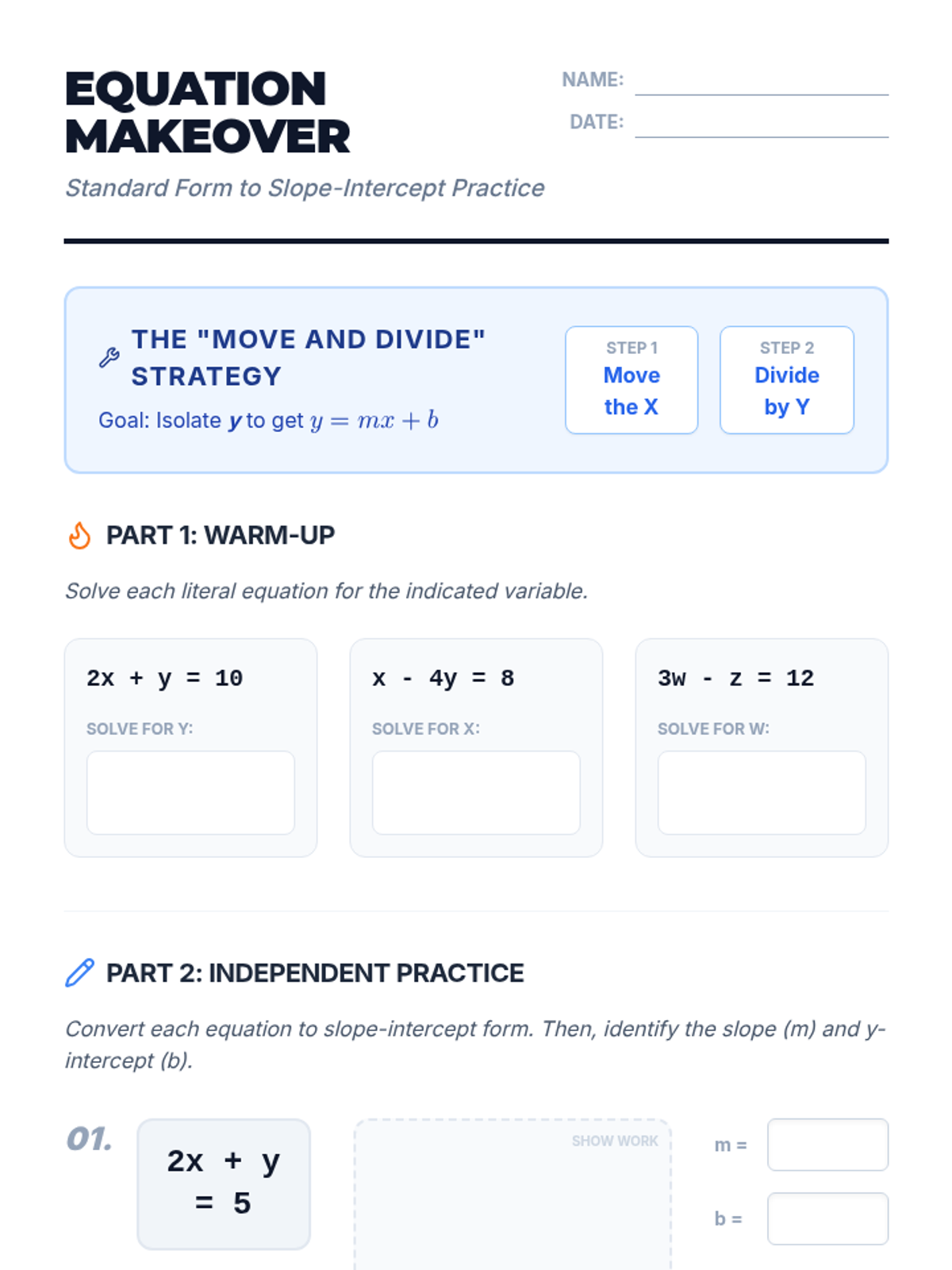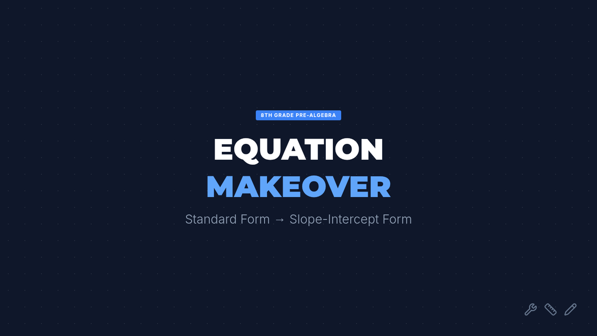 Students will learn and practice converting linear equations from Standard Form to Slope-Intercept Form using the 'Move and Divide' strategy, supported by instructional video content and guided practice.