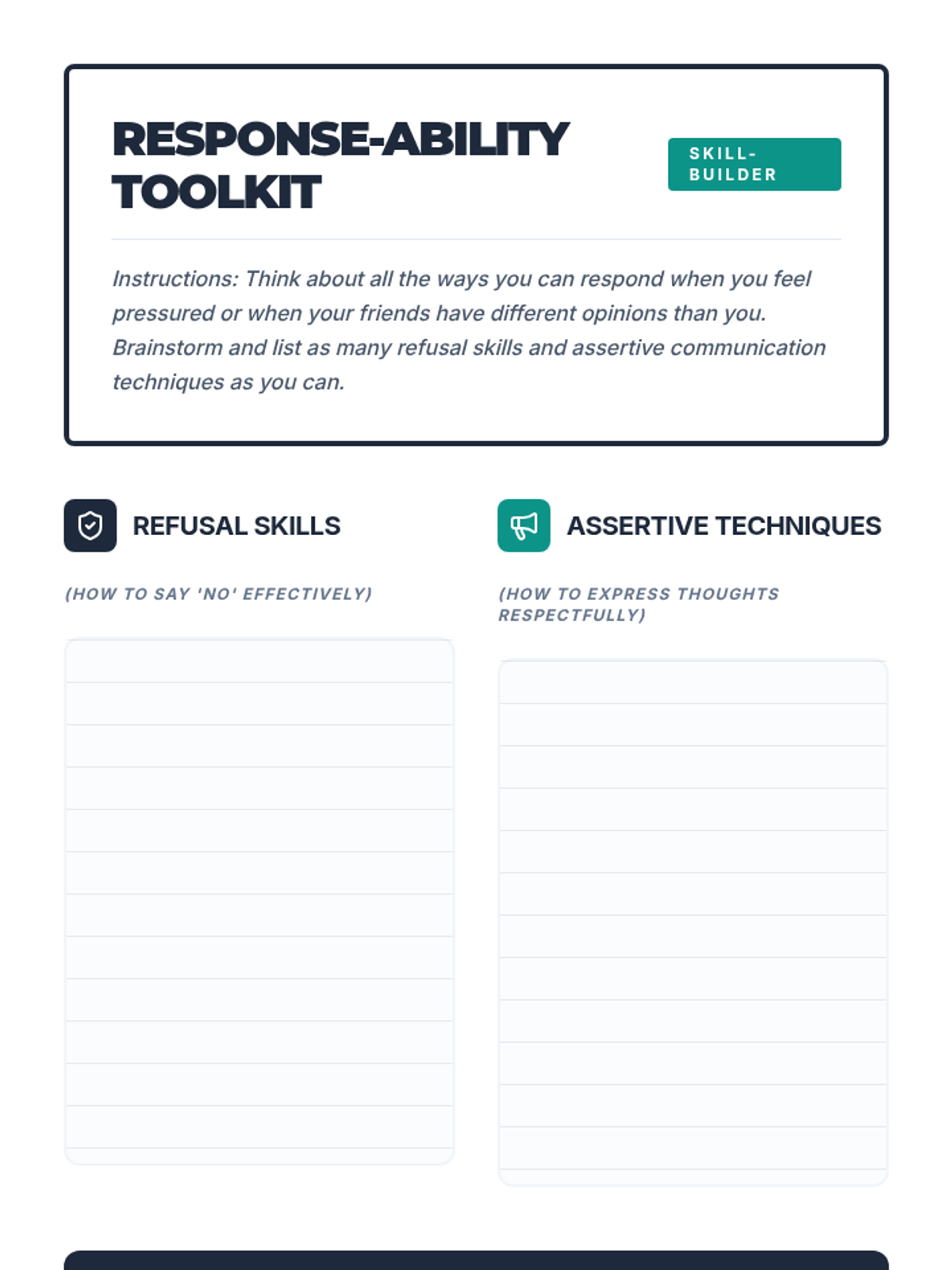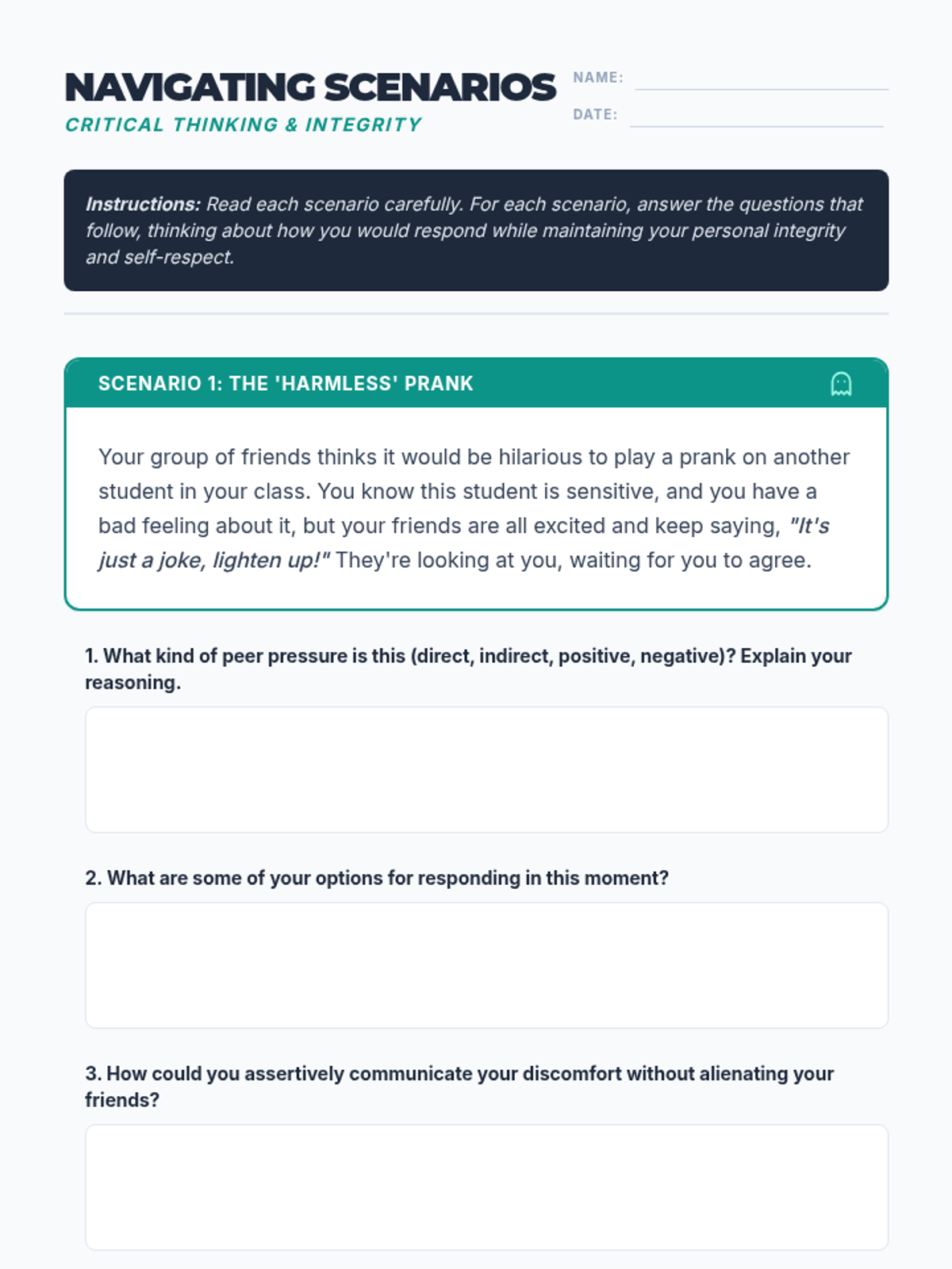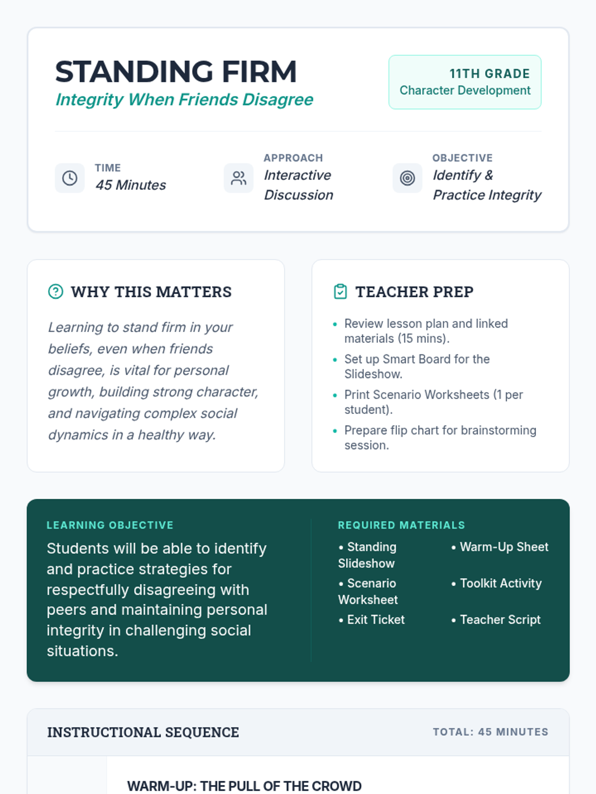 This lesson helps 11th-grade students develop and practice strategies for respectfully disagreeing with peers while maintaining their personal integrity. Students will analyze scenarios, practice refusal skills, and build a toolkit for assertive communication.