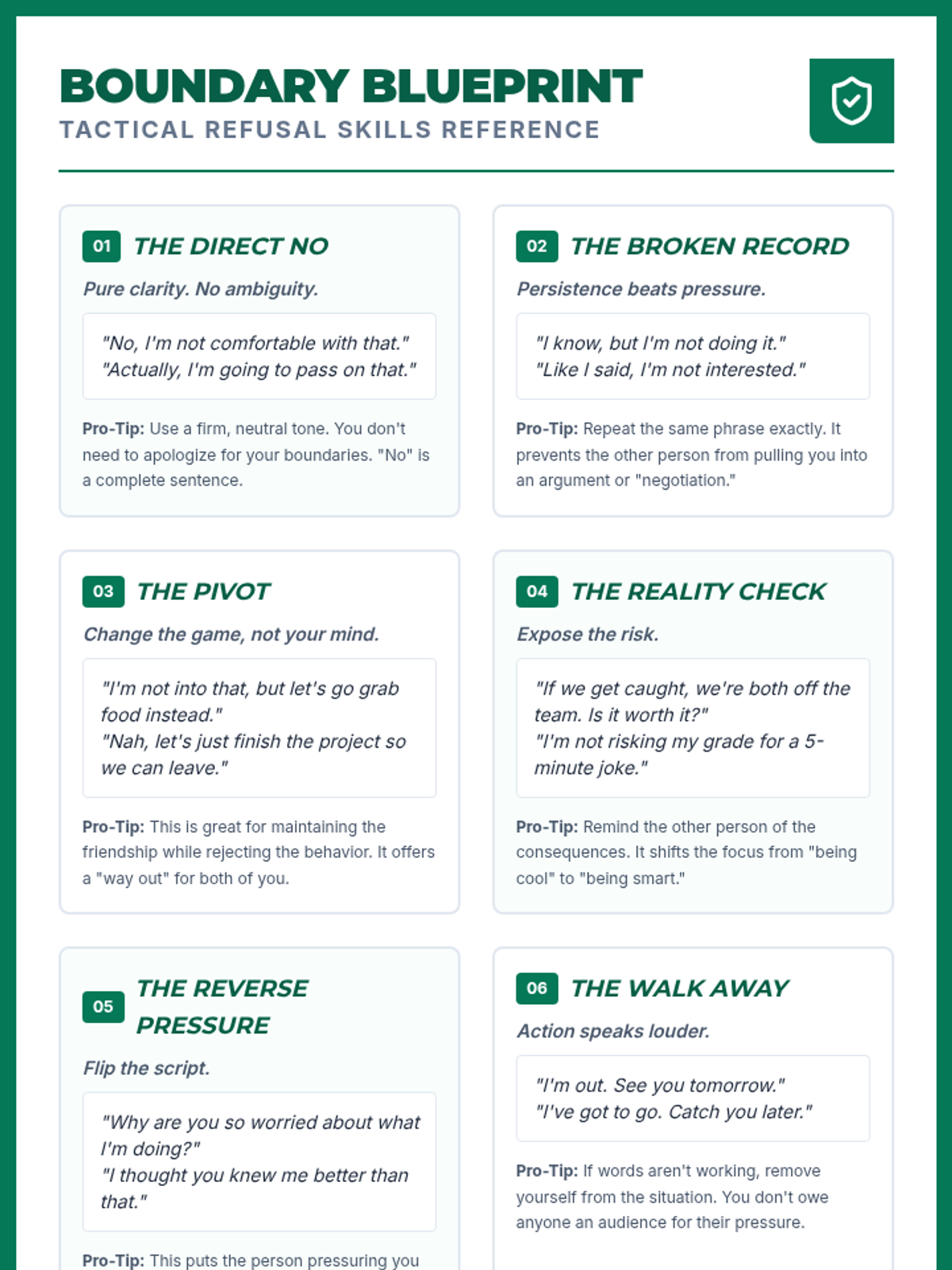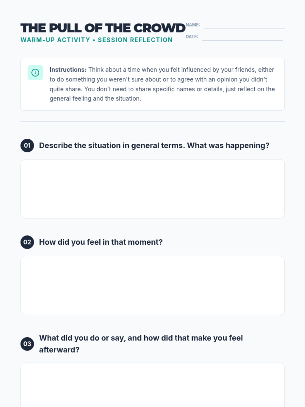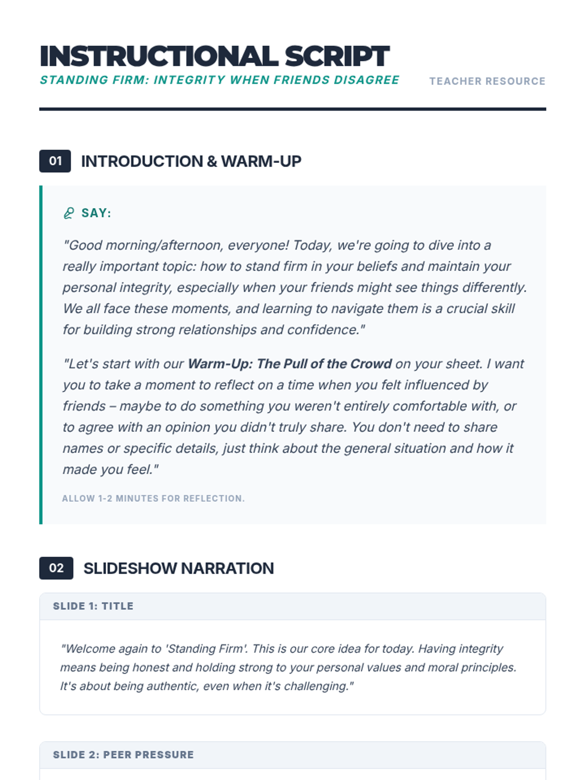 This lesson helps 11th-grade students develop and practice strategies for respectfully disagreeing with peers while maintaining their personal integrity. Students will analyze scenarios, practice refusal skills, and build a toolkit for assertive communication.