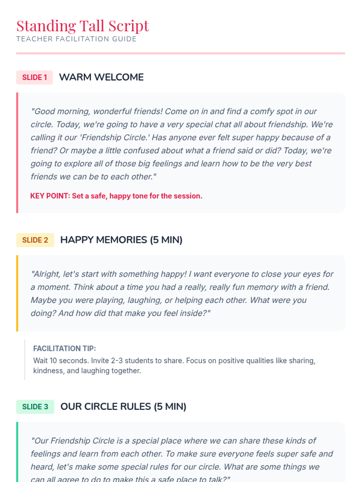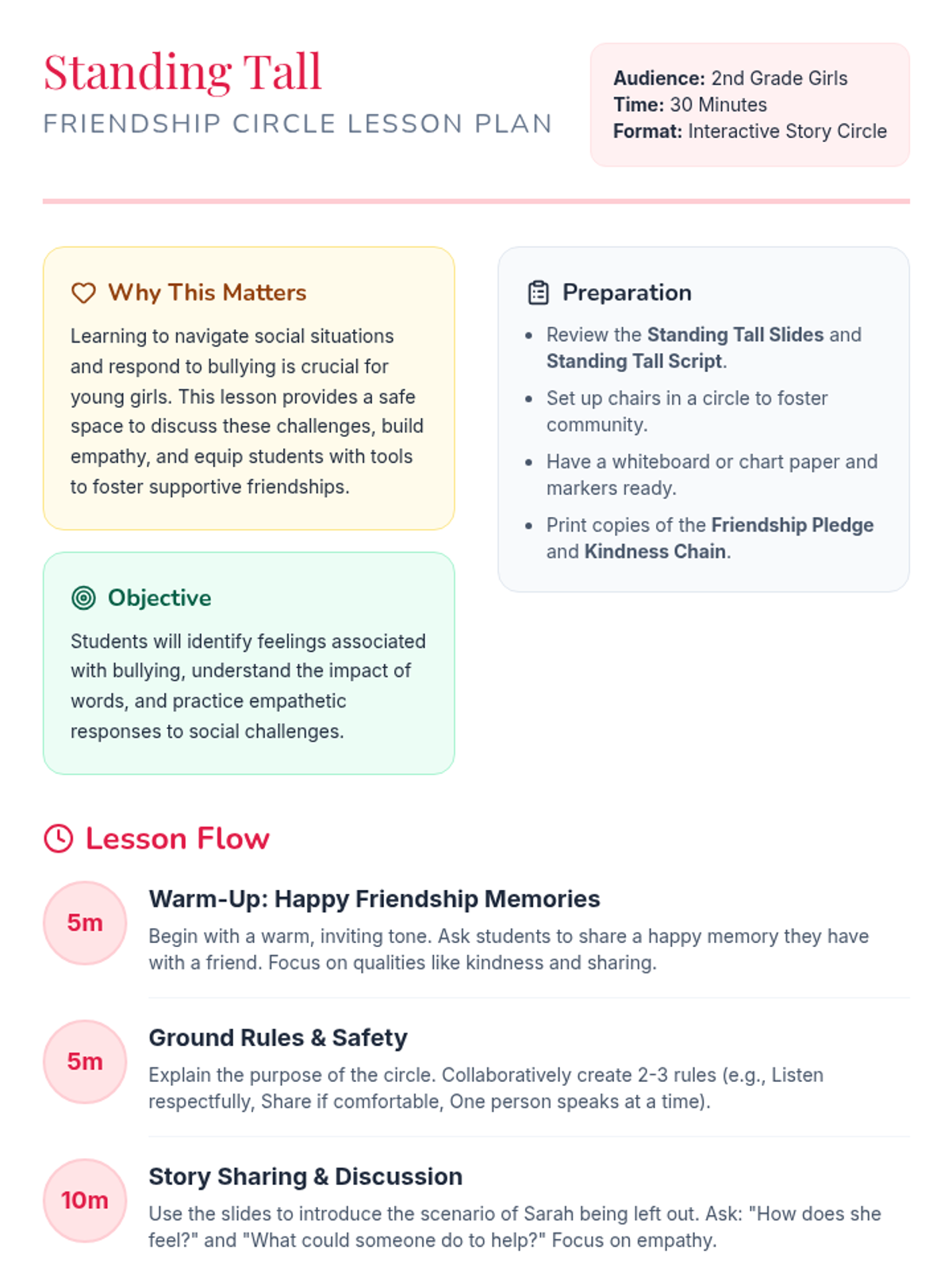 A 30-minute story circle lesson for 2nd-grade girls focused on empathy, bullying prevention, and building positive friendship skills through sharing and role-play.