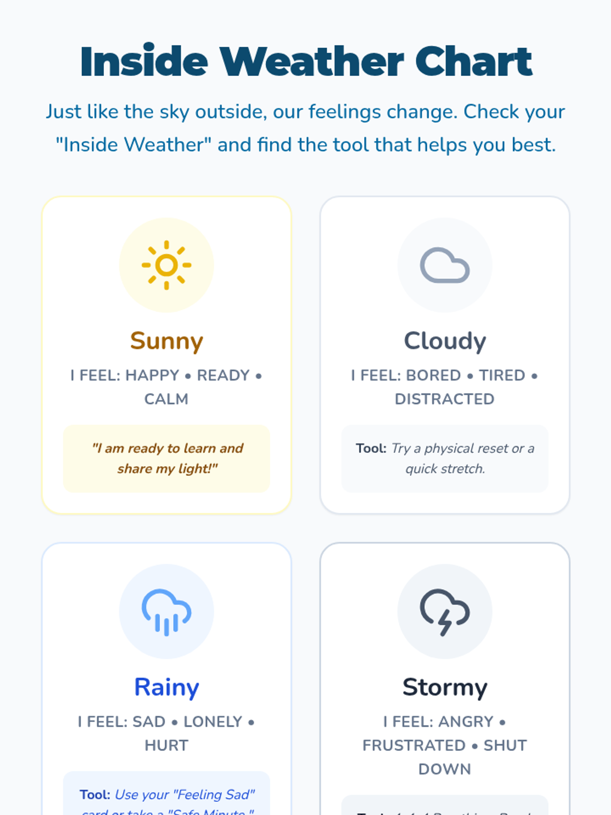 A Tier 2/3 social-emotional lesson for Grade 4 students using New England weather metaphors to identify emotional states, select regulation gear, and manage social impact.
