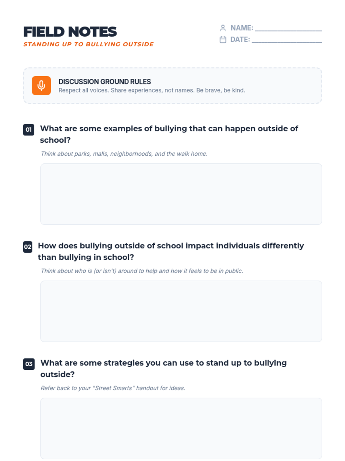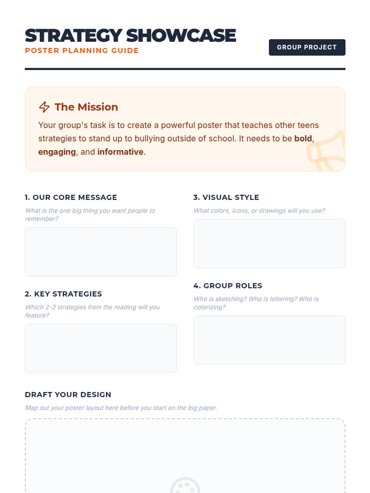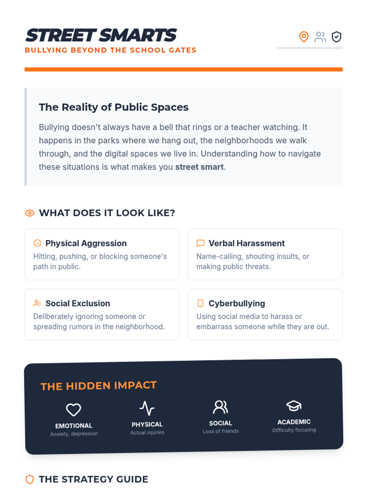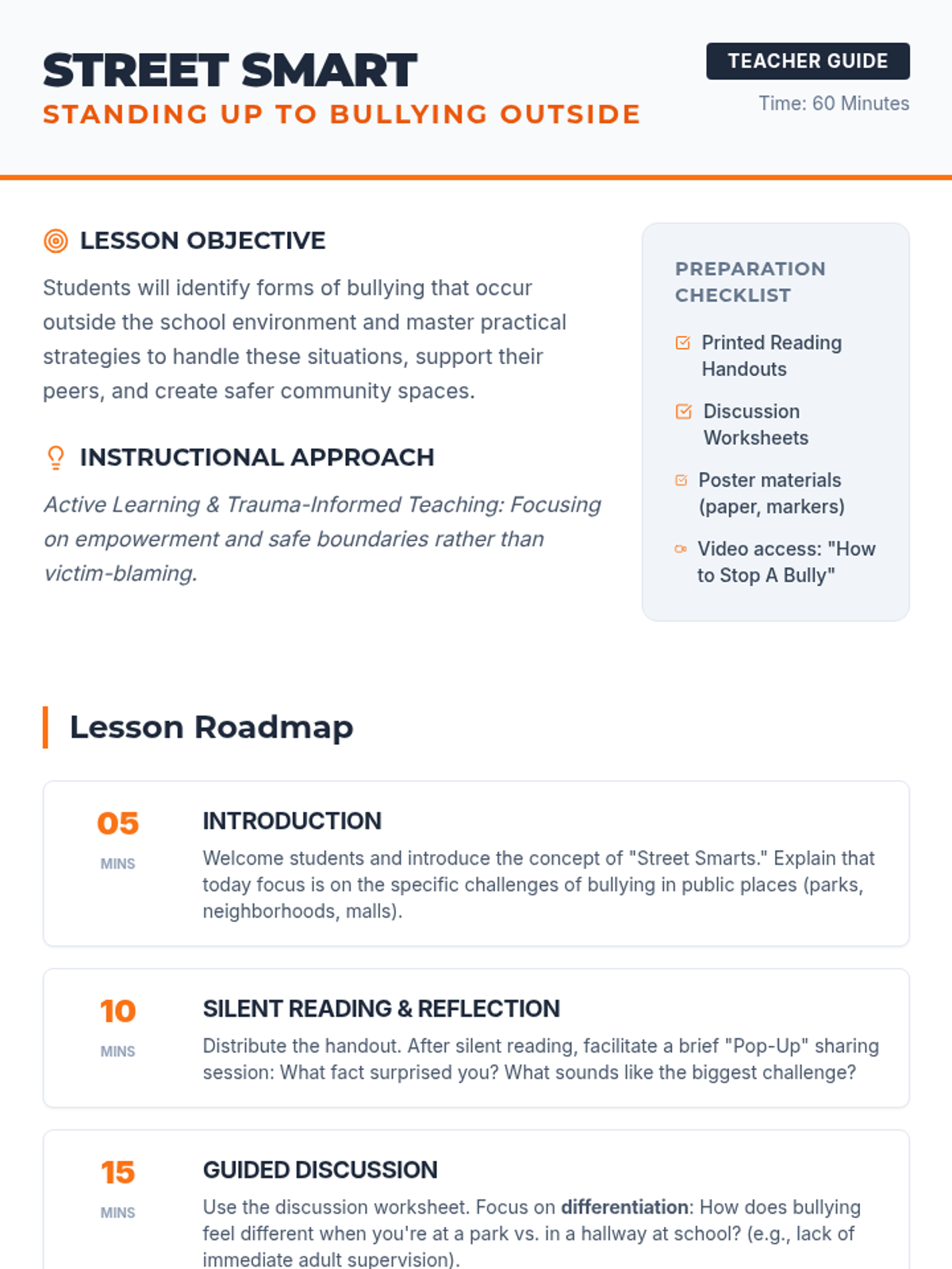 This lesson empowers teens to recognize and respond to bullying in public spaces, parks, and neighborhoods. Students will explore strategies for staying safe, supporting peers, and standing up to harassment through reading, discussion, and a creative poster project.