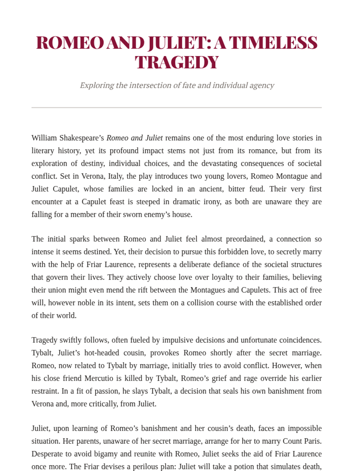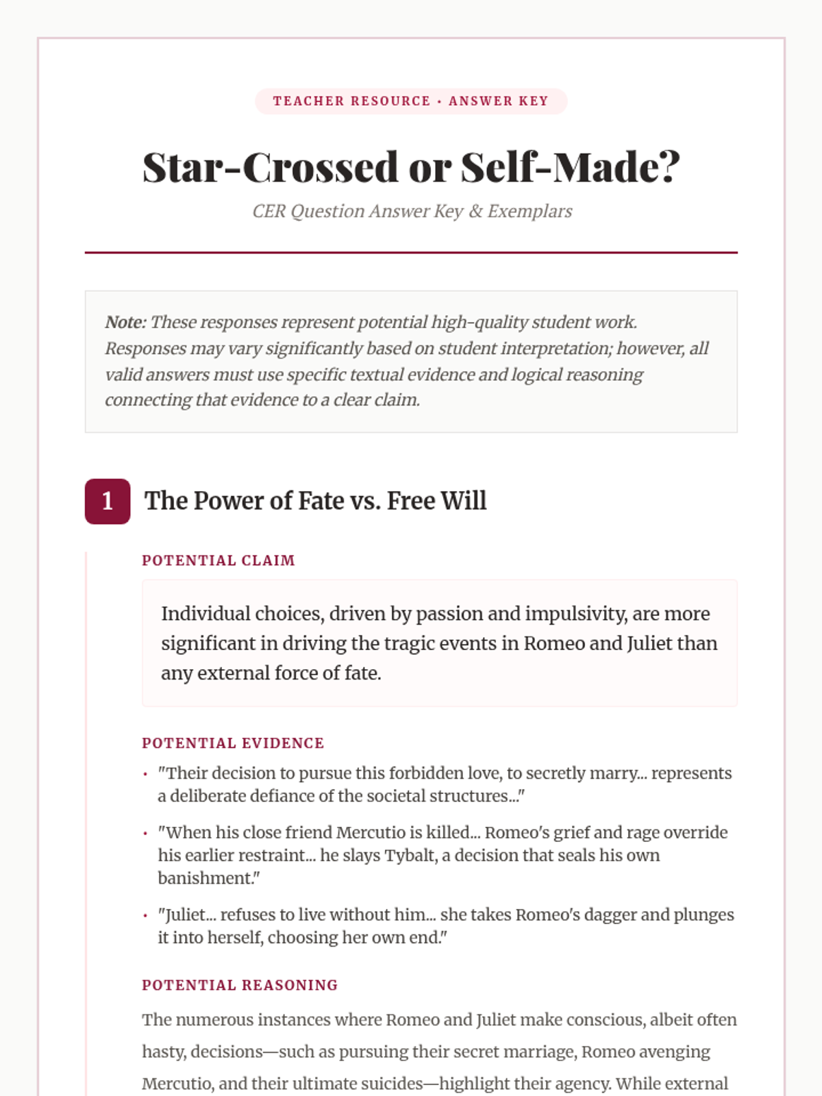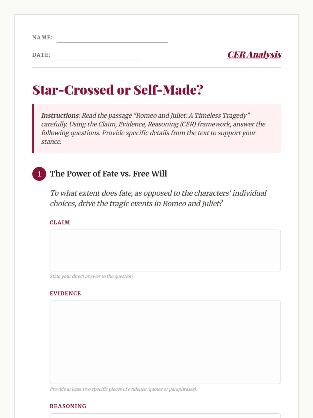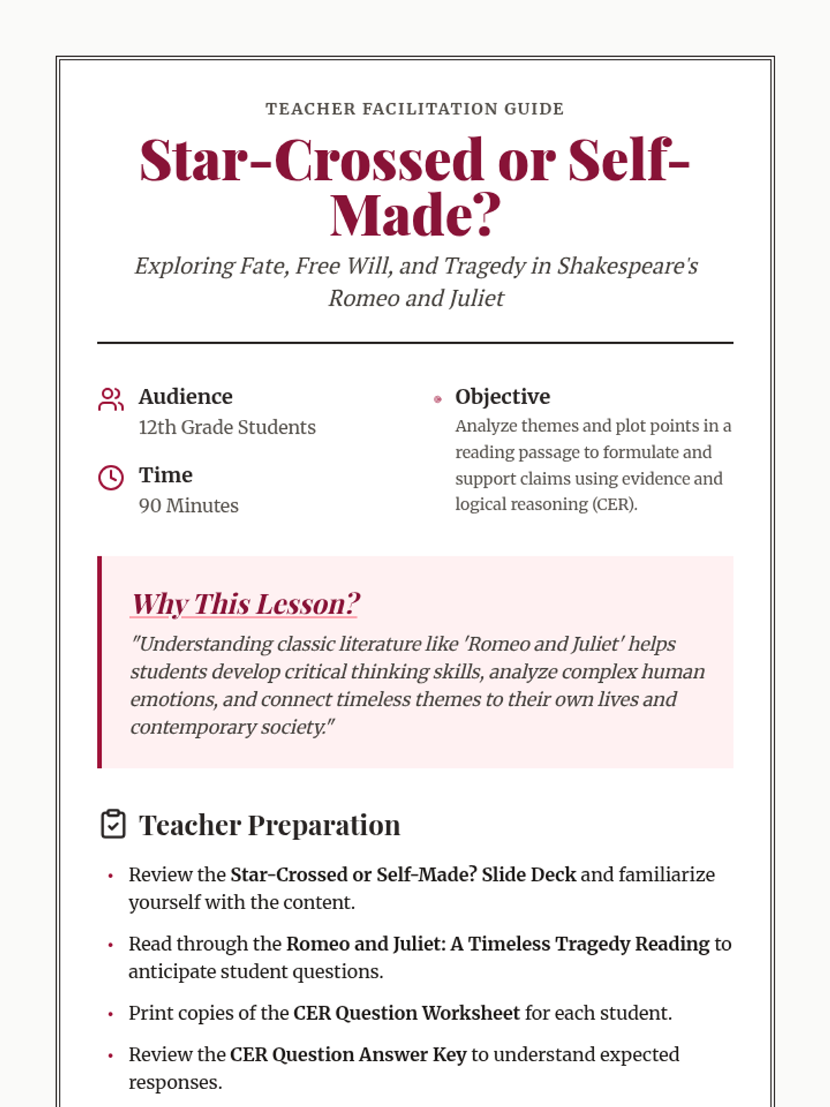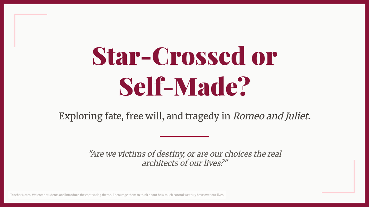 This 90-minute lesson for 12th-grade students explores the tension between fate and free will in Shakespeare's 'Romeo and Juliet' through a thematic reading and Claim-Evidence-Reasoning (CER) analysis. Students will evaluate whether the lovers were victims of destiny or their own impulsive choices.