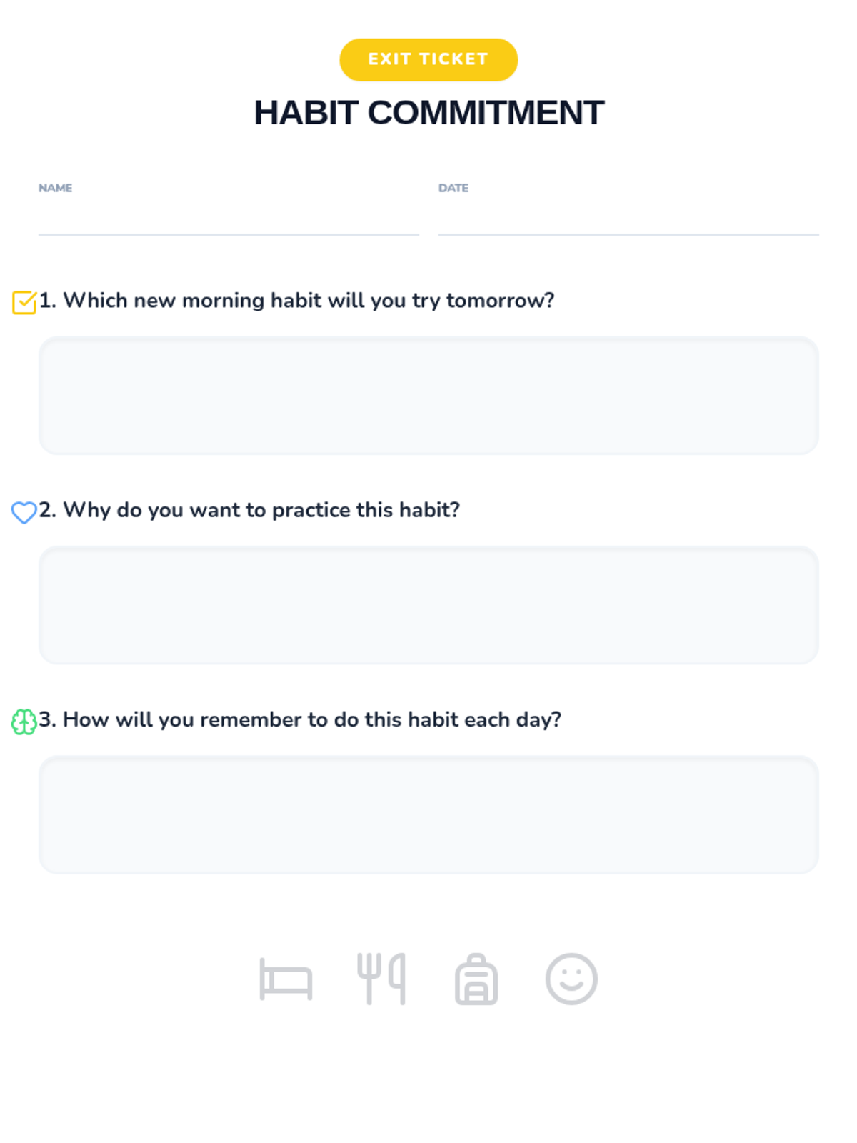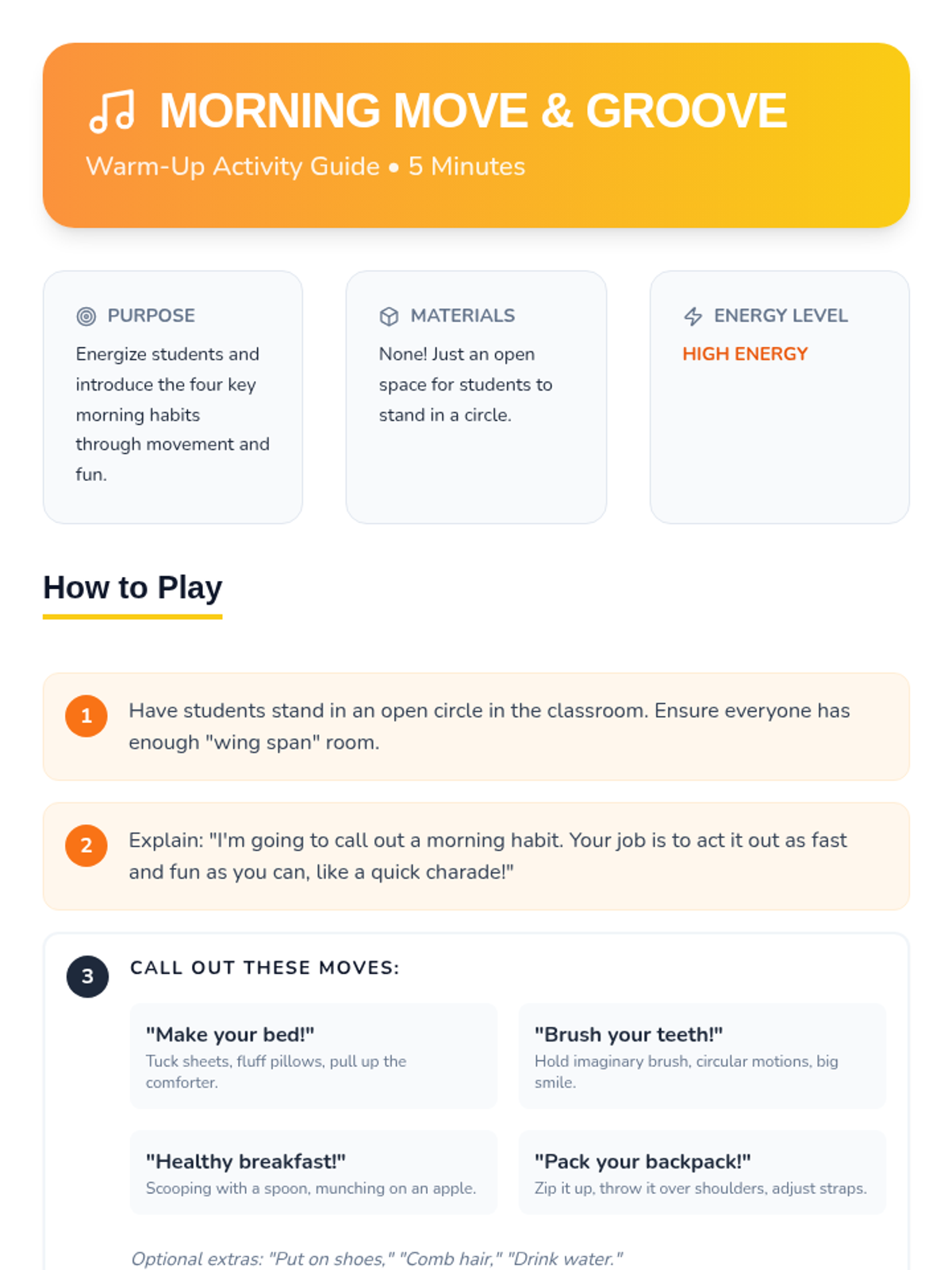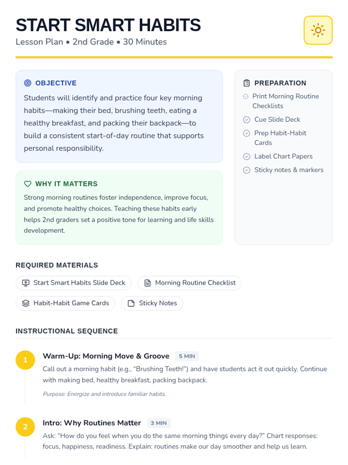 A 30-minute lesson for 2nd graders on essential morning habits to build independence and focus. Students learn four key habits through movement, discussion, and interactive sorting.