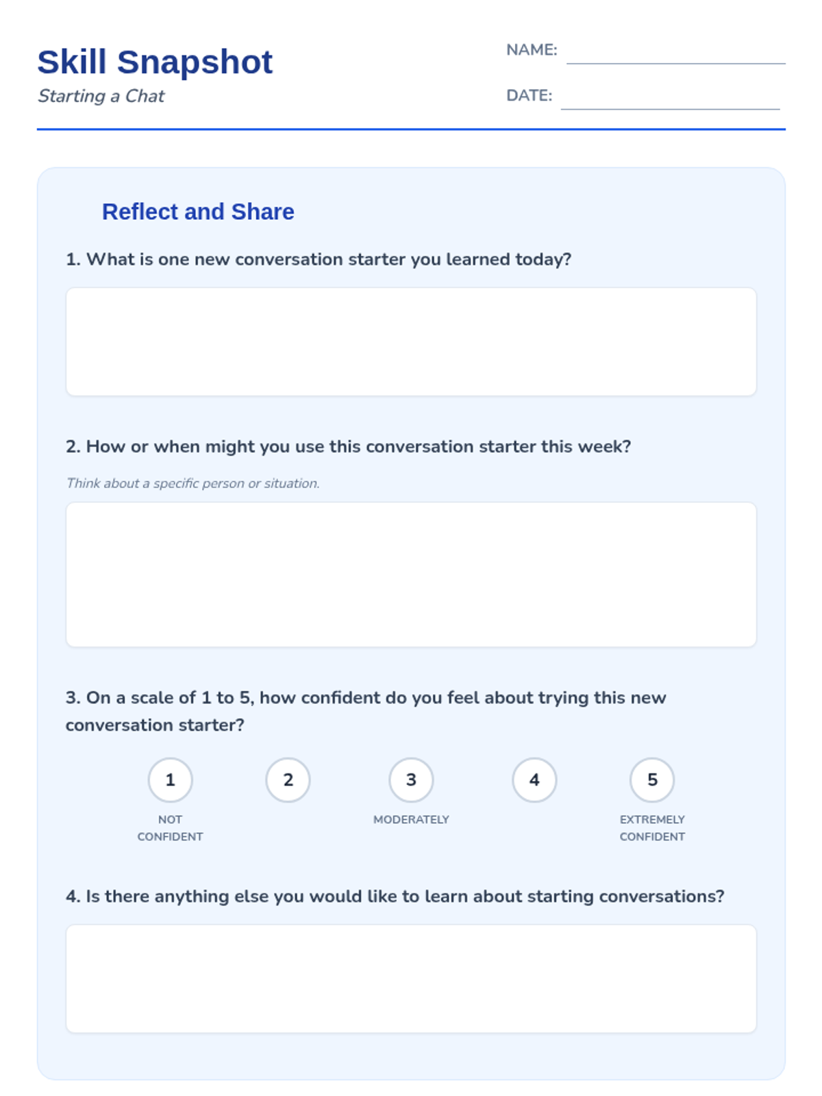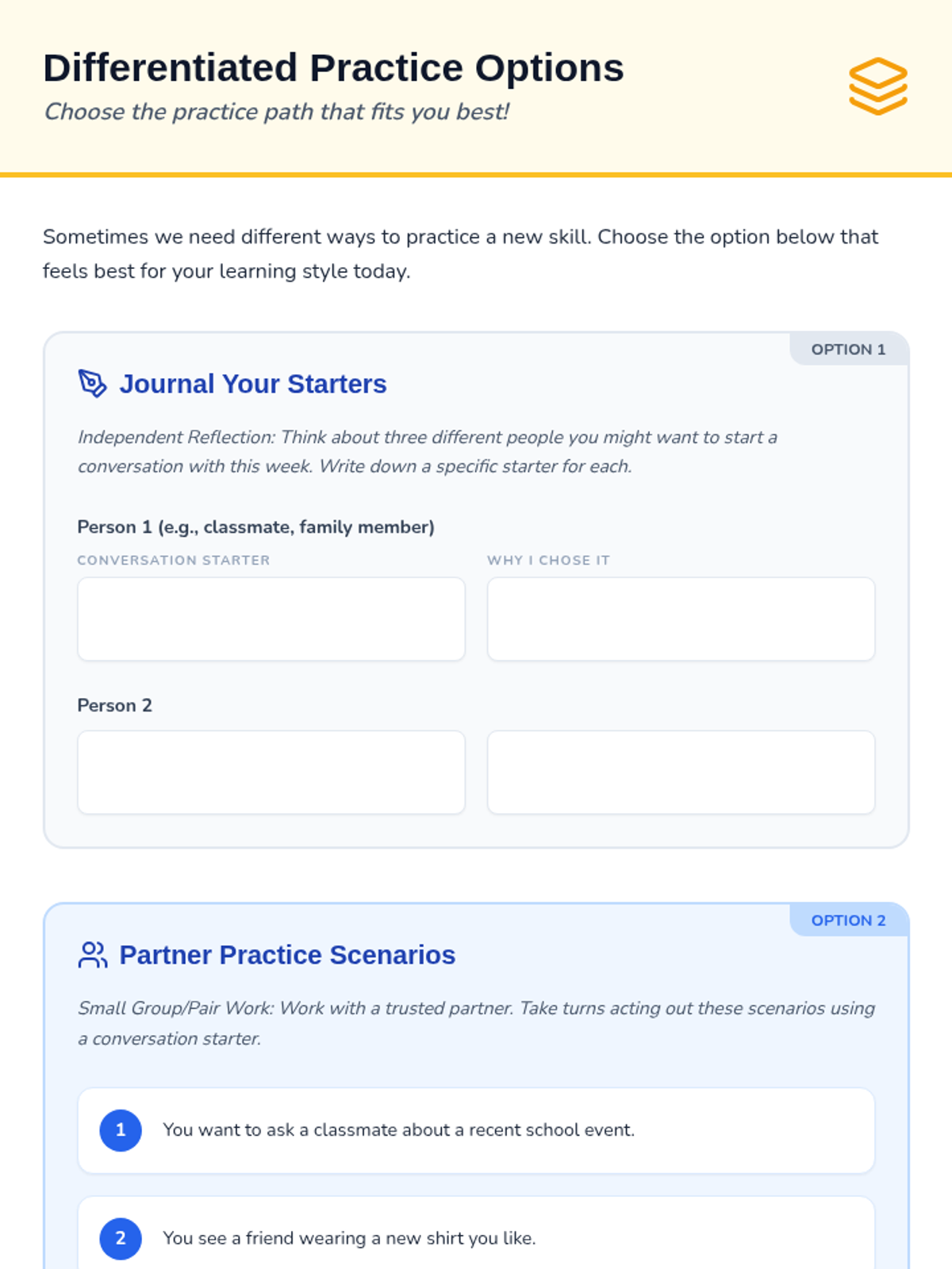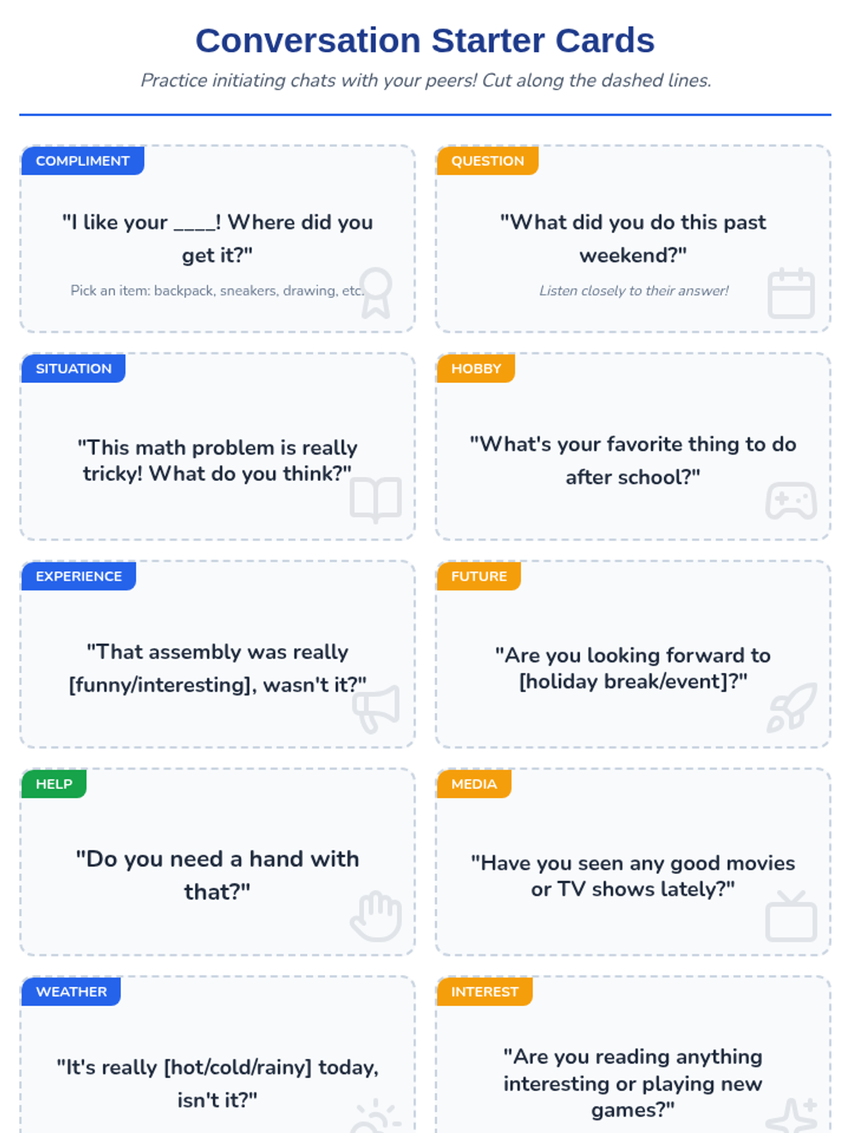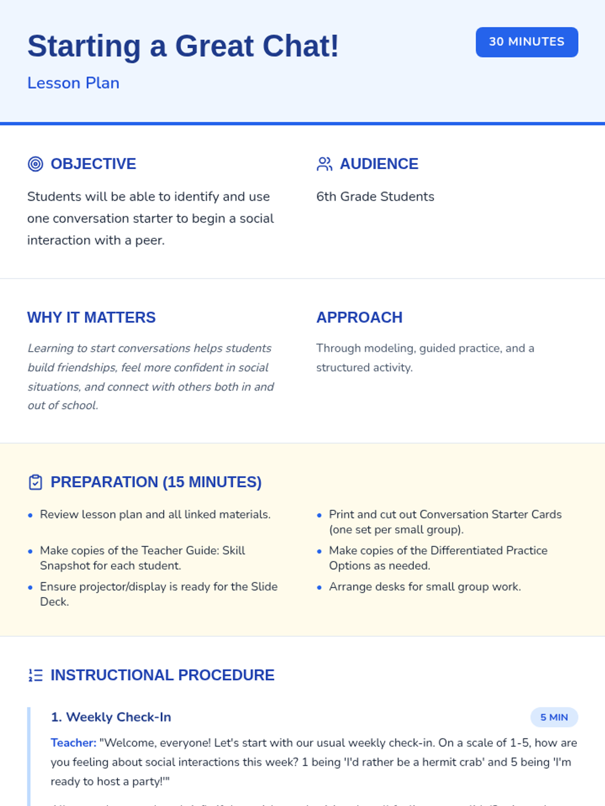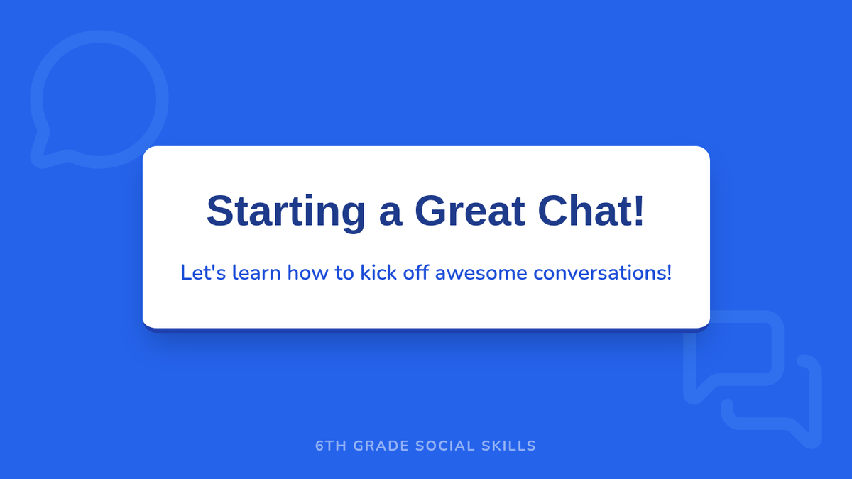 This lesson empowers 6th-grade students with essential social skills by teaching them how to initiate conversations confidently and effectively. Students will learn and practice various conversation starters to build positive social interactions.