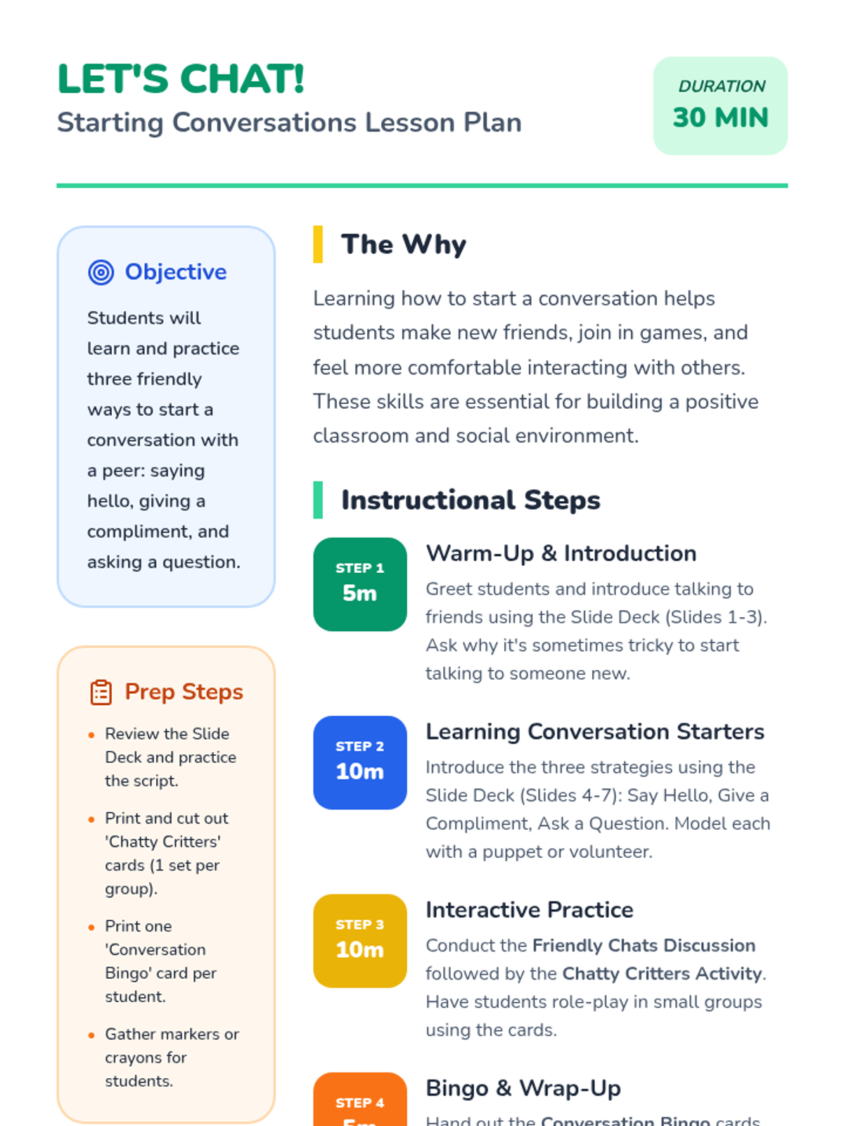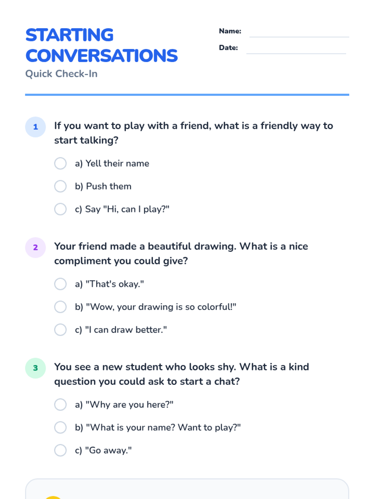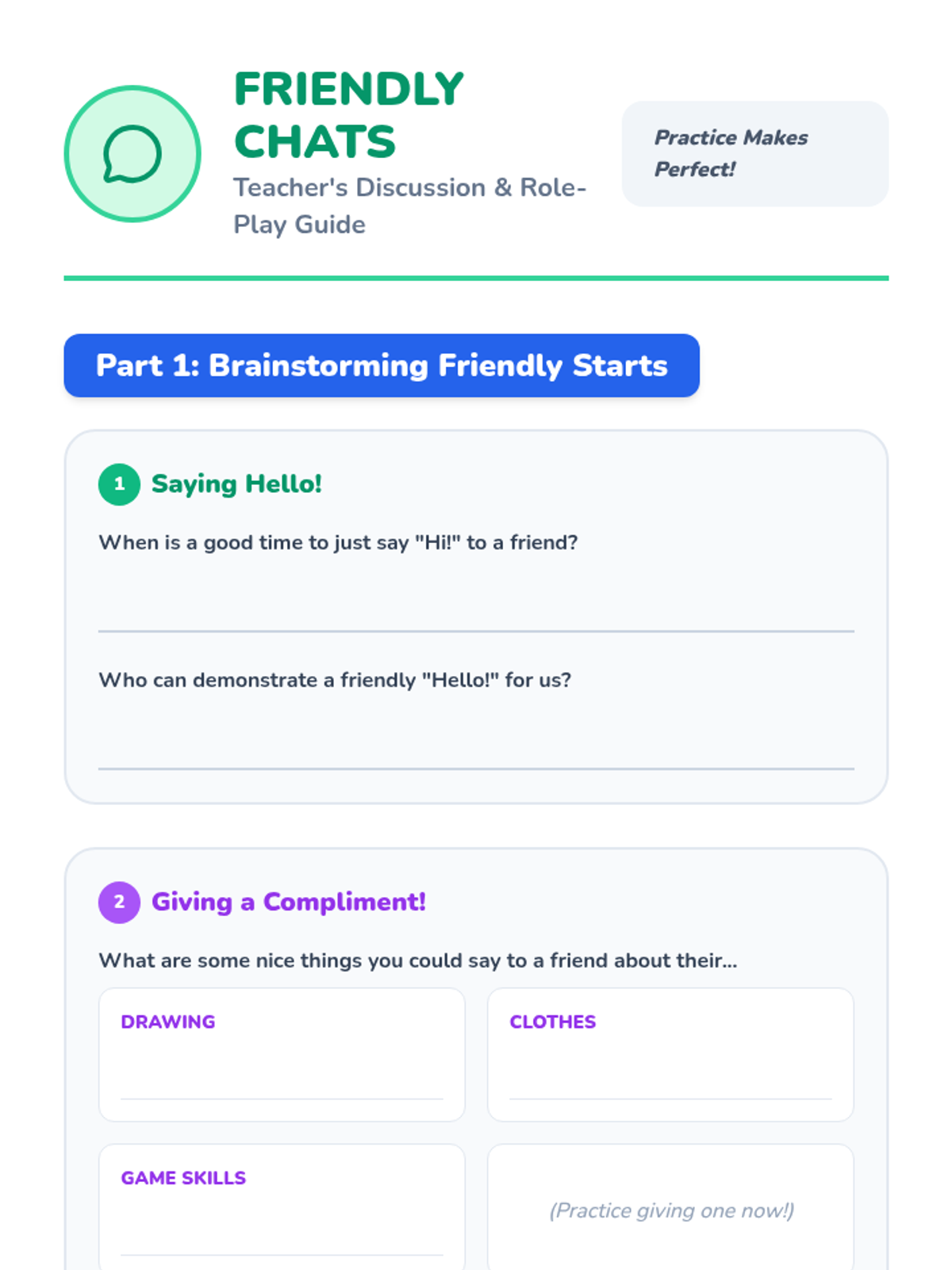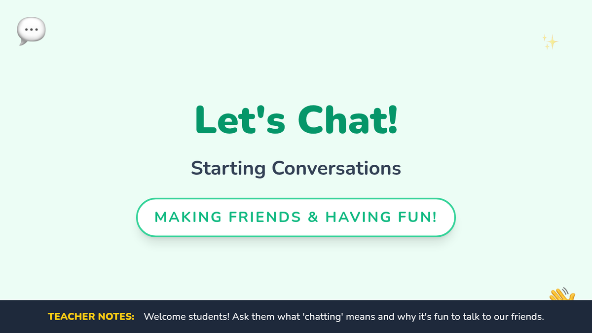 A 30-minute social-emotional learning lesson for K-1 students on how to initiate friendly conversations using three simple strategies: saying hello, giving a compliment, and asking a question.
