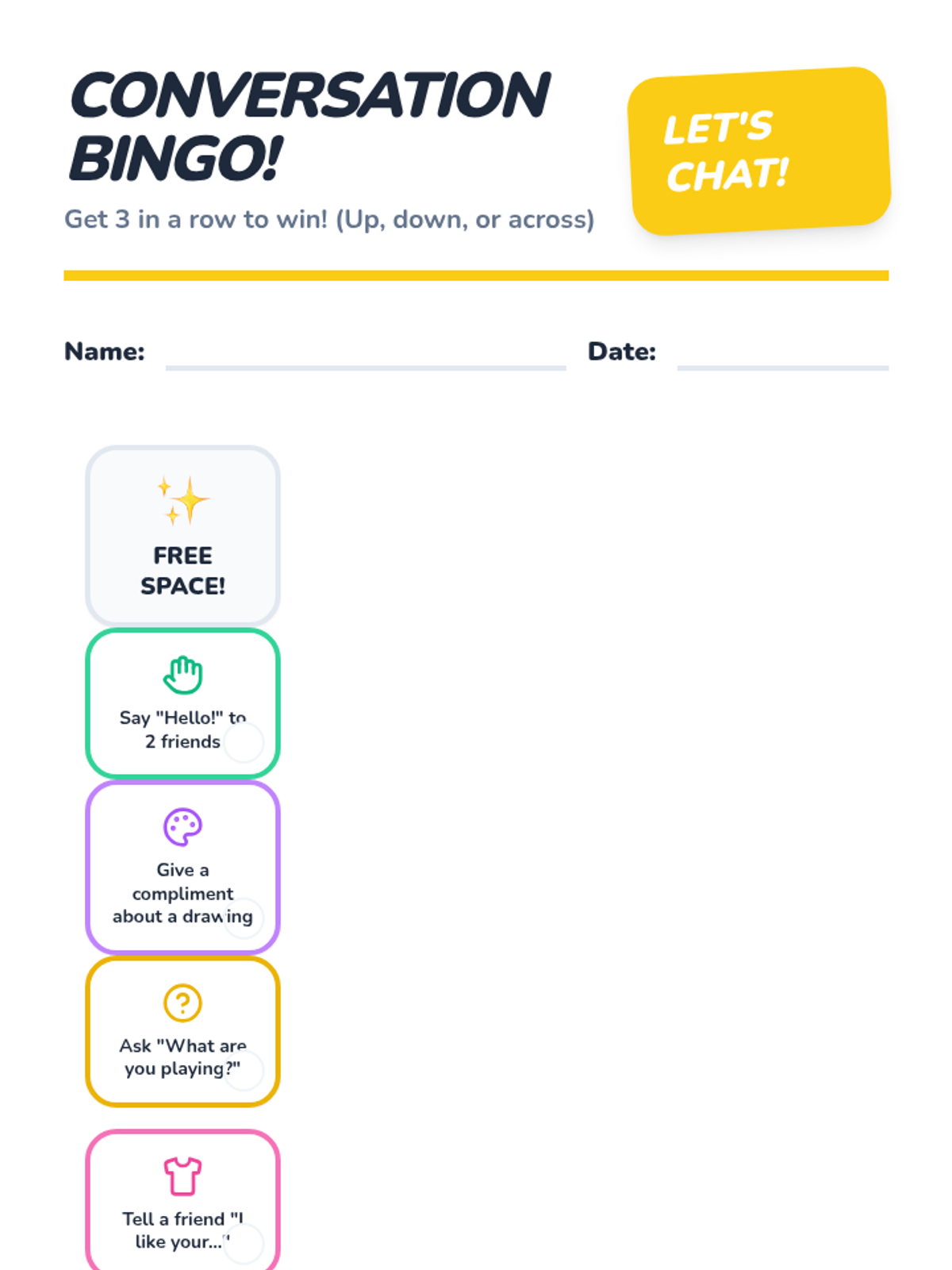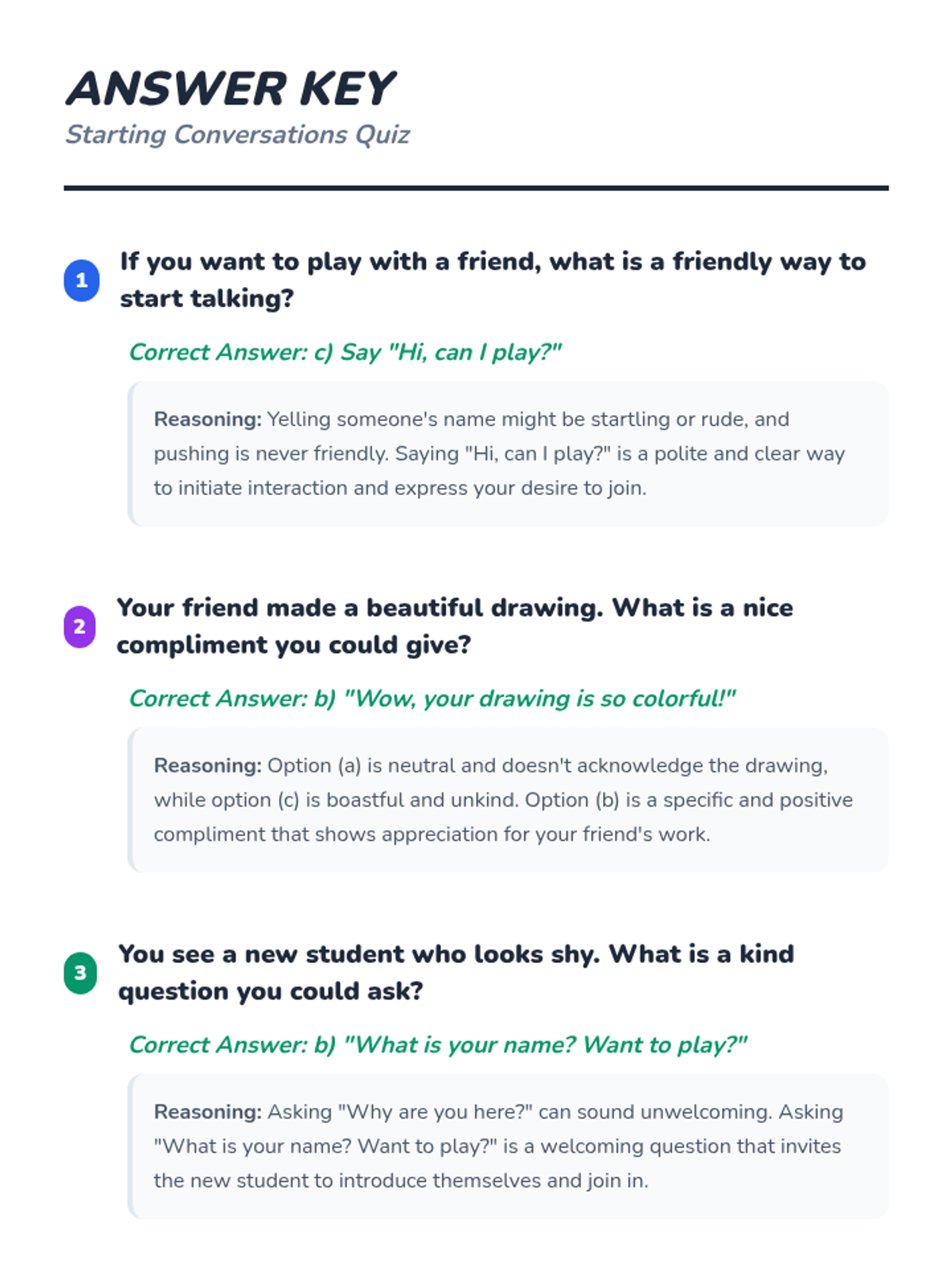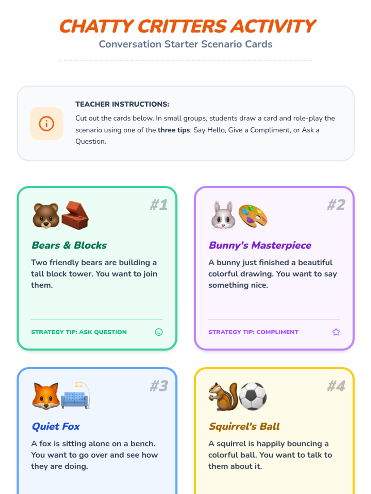 A 30-minute social-emotional learning lesson for K-1 students on how to initiate friendly conversations using three simple strategies: saying hello, giving a compliment, and asking a question.