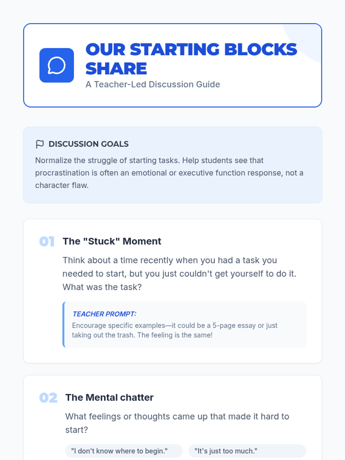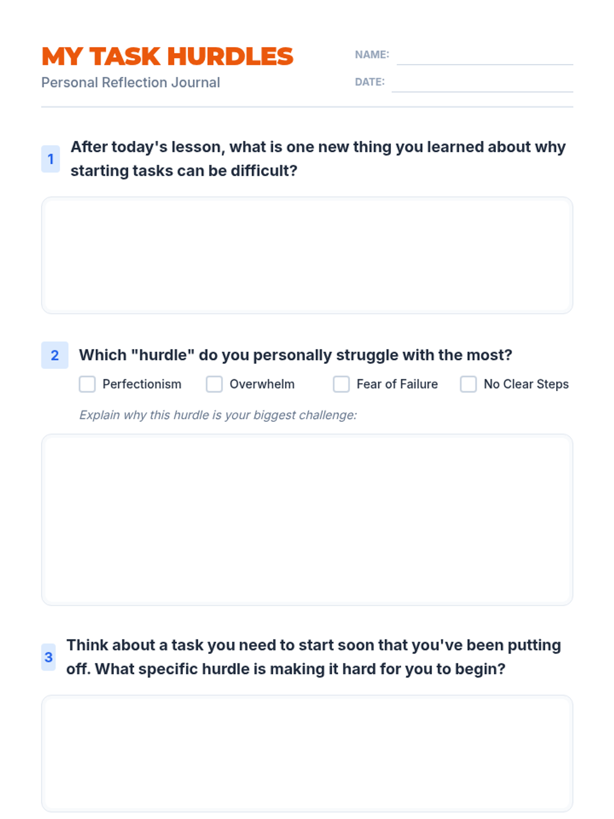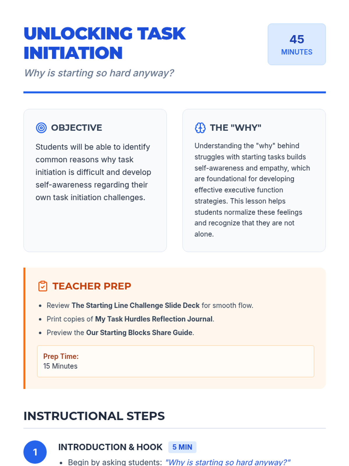 This lesson helps 7th grade students understand the psychology behind task initiation struggles, helping them identify personal hurdles like perfectionism and overwhelm. By normalizing these challenges, students build self-awareness and empathy for their own executive function journeys.