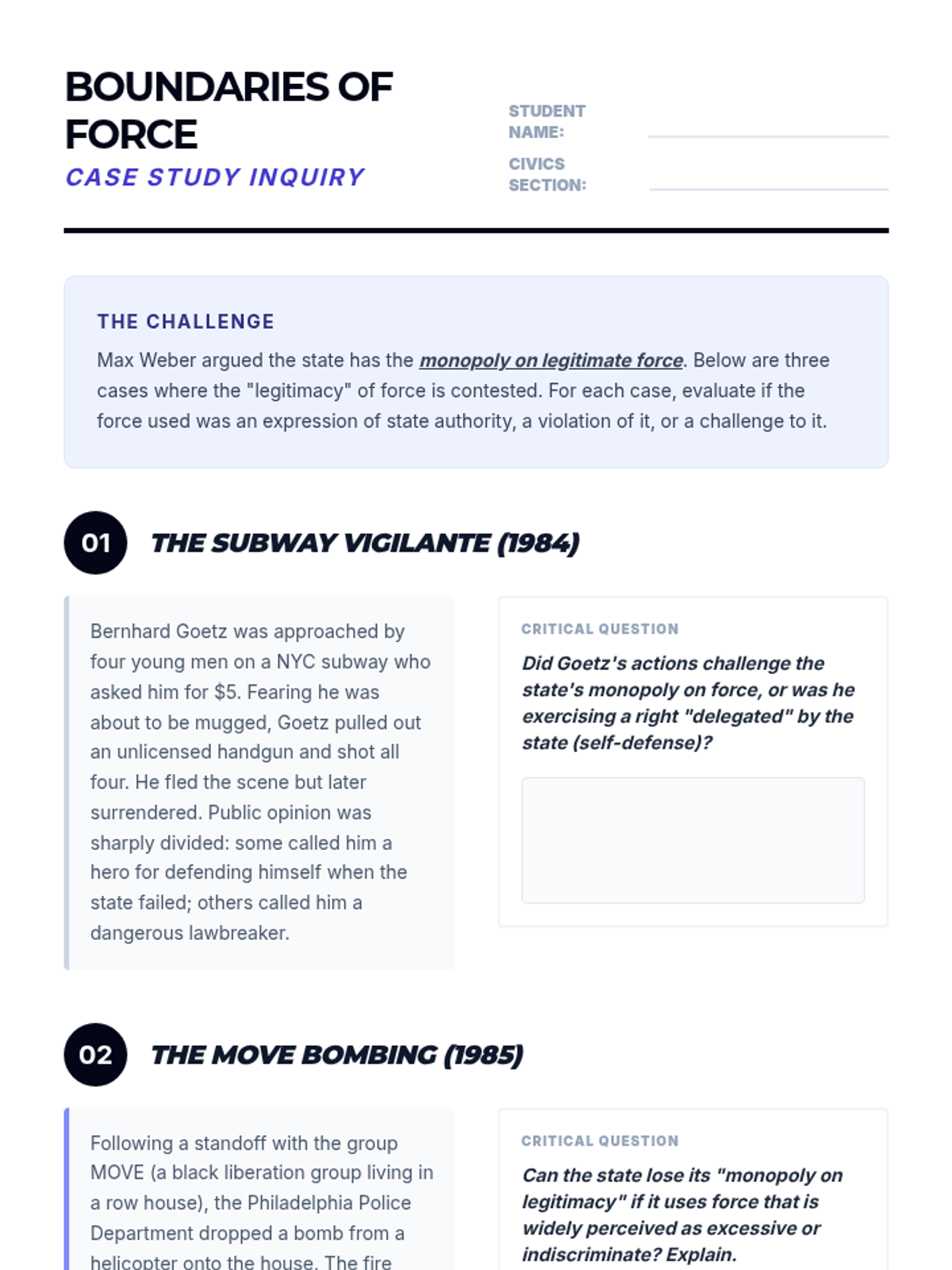 An investigation into Max Weber's concept of the state's monopoly on the legitimate use of physical force and the legal boundaries of state power.