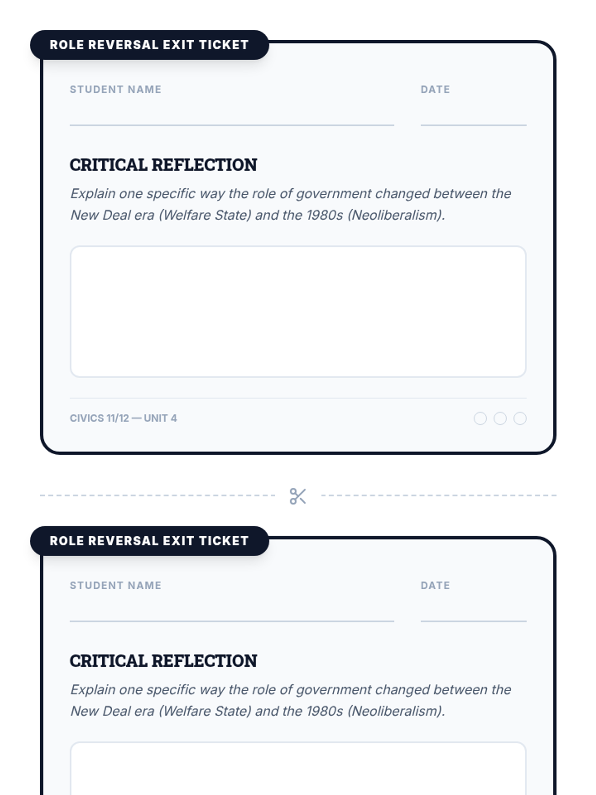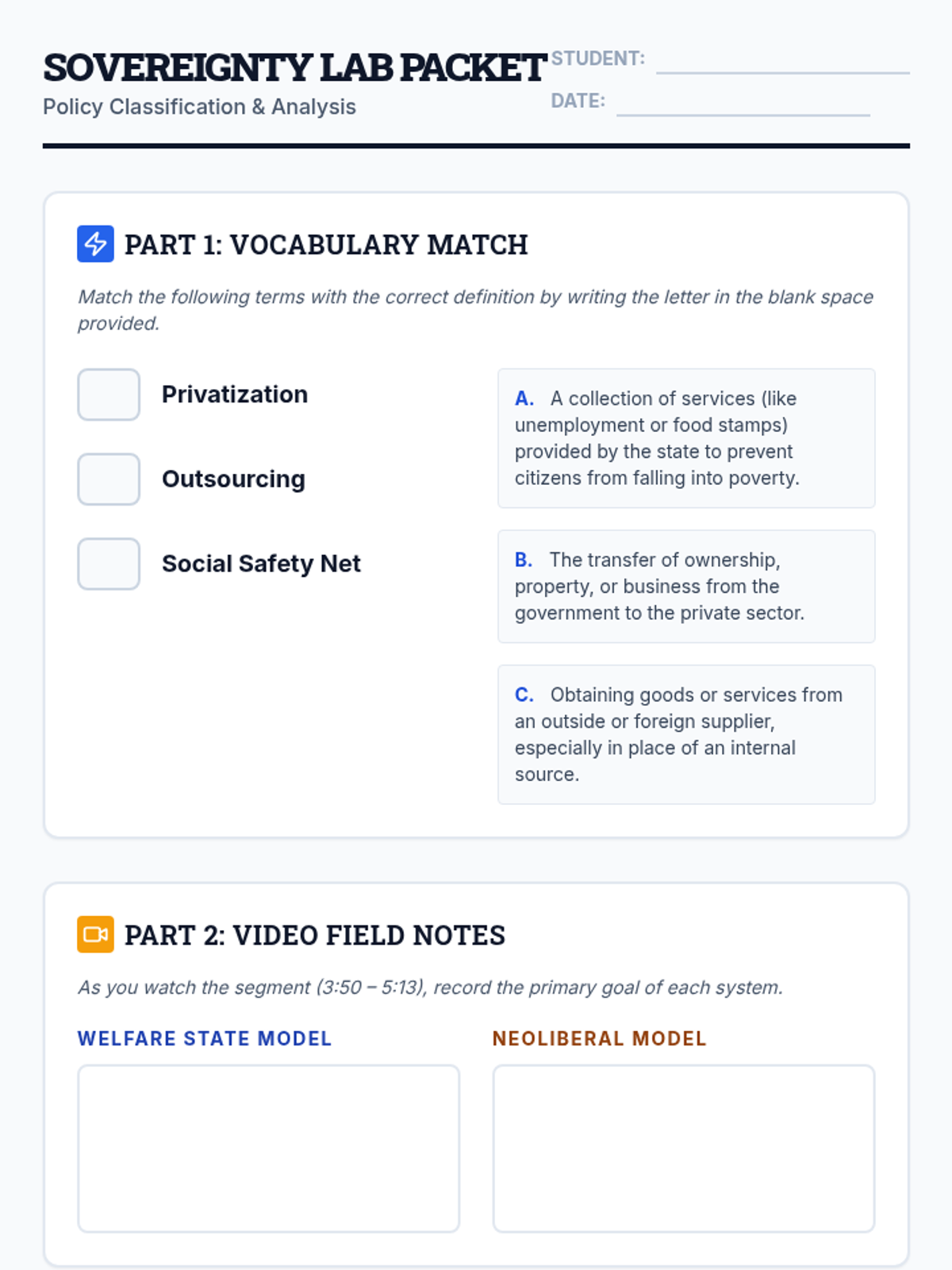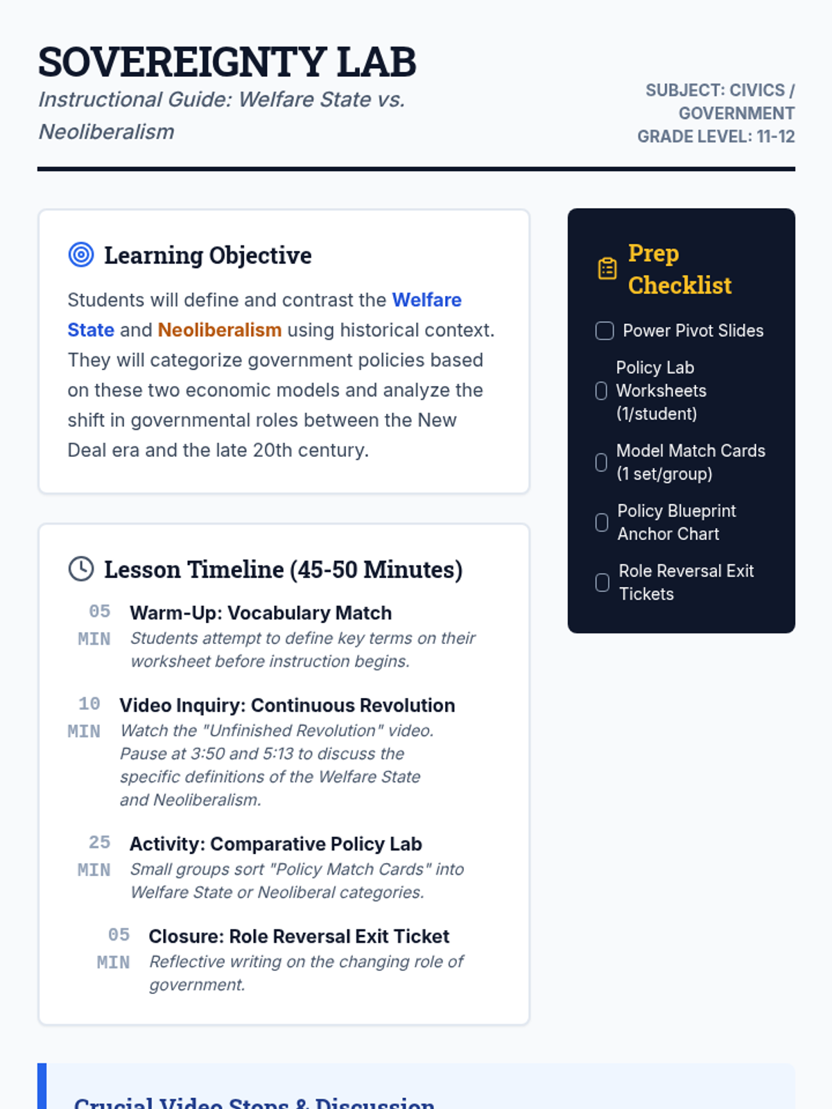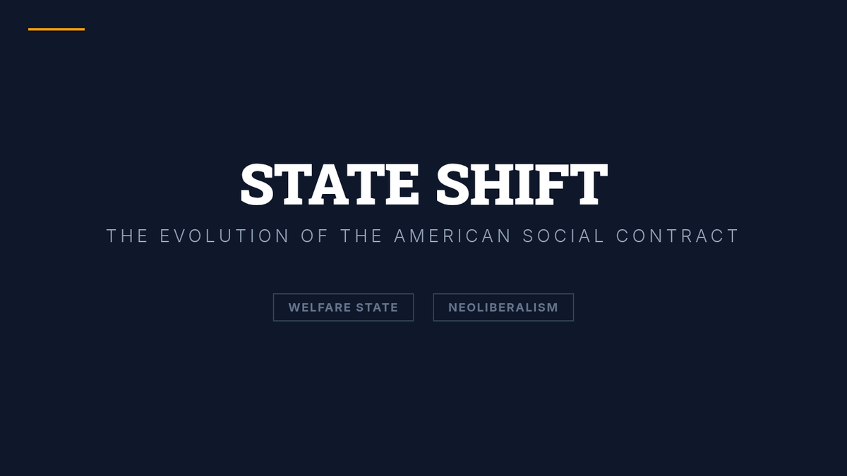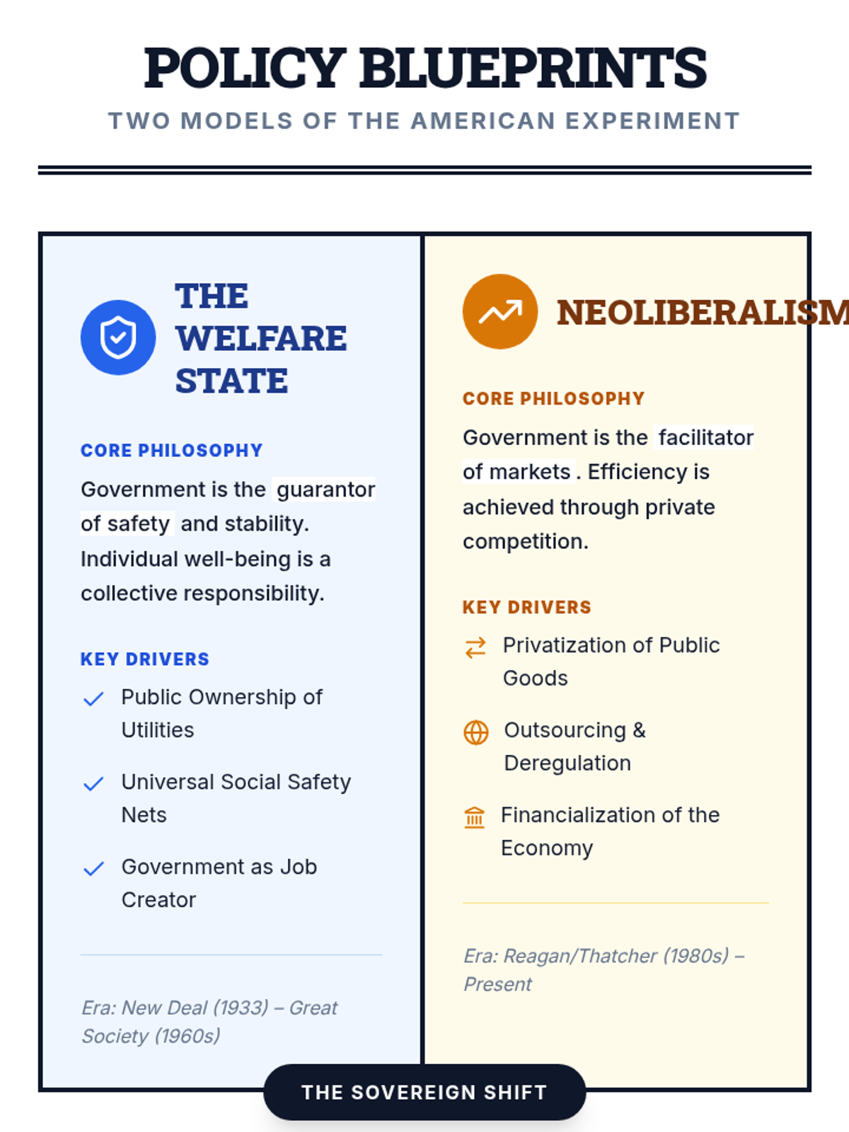 This lesson explores the historical shift from the Welfare State (post-New Deal) to Neoliberalism (1980s-present). Students analyze how the role of government changed from a protector of social well-being to a facilitator of market-driven privatization and financialization.