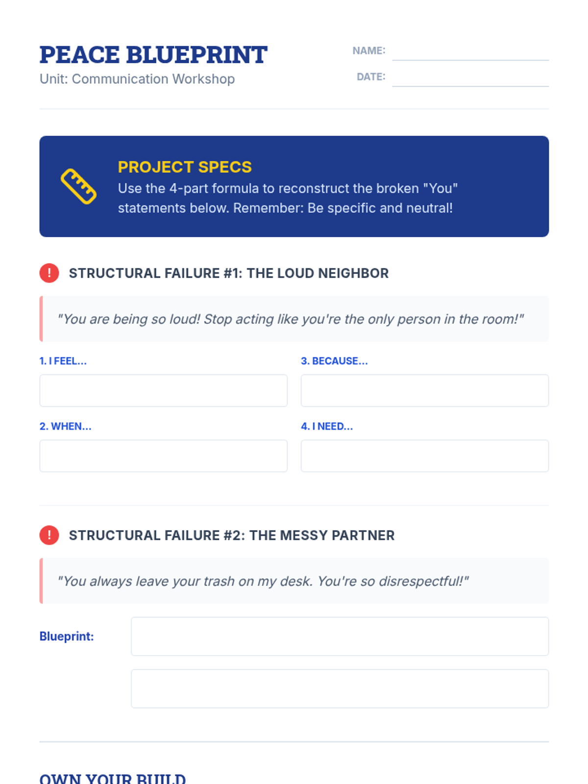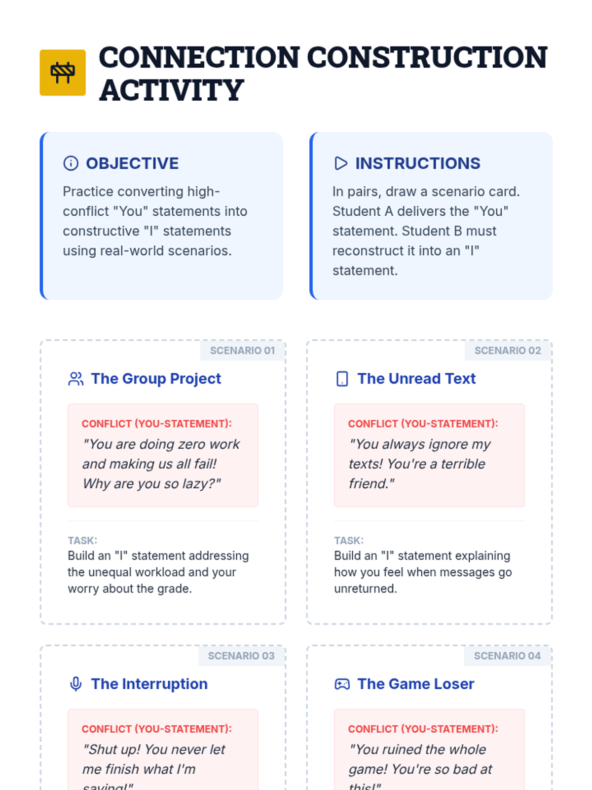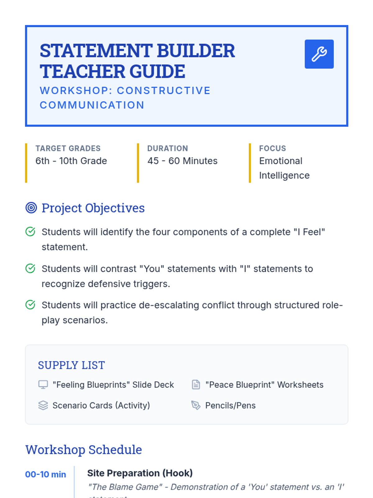 A workshop-style lesson teaching students how to construct and use 'I Feel' statements to communicate emotions and needs respectfully, reducing conflict and building empathy.