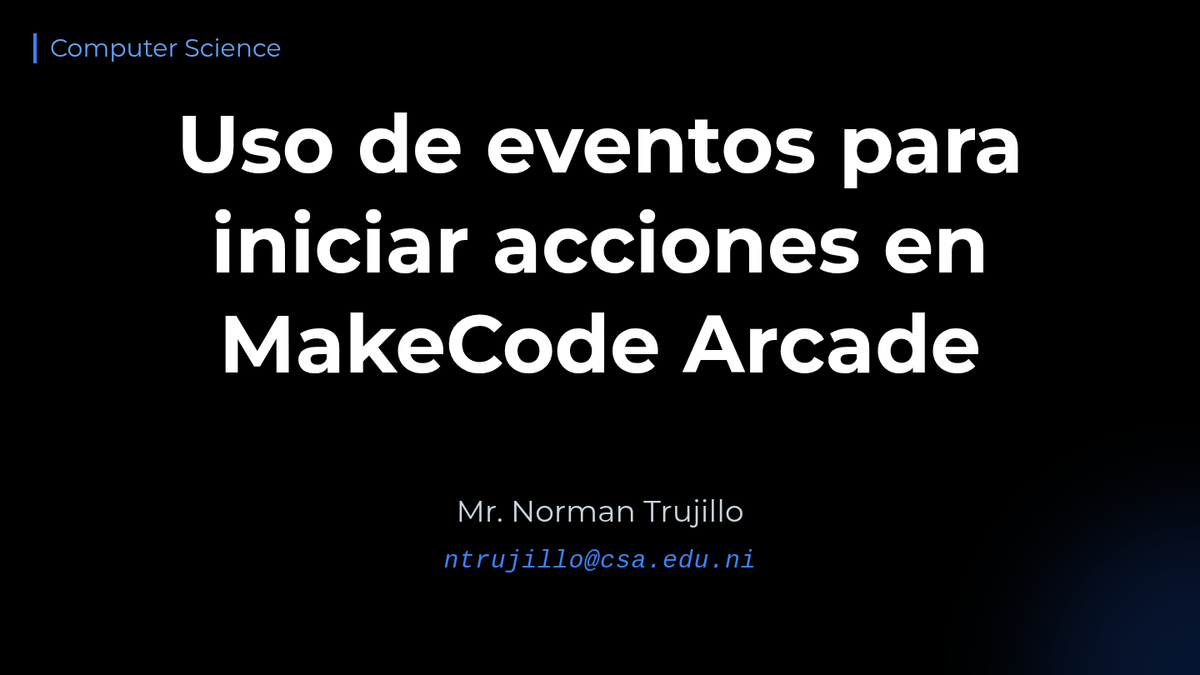 Una presentación multimedia de 40 diapositivas sobre el uso de eventos en MakeCode Arcade para estudiantes de sexto grado, con un diseño profesional de fondo negro.