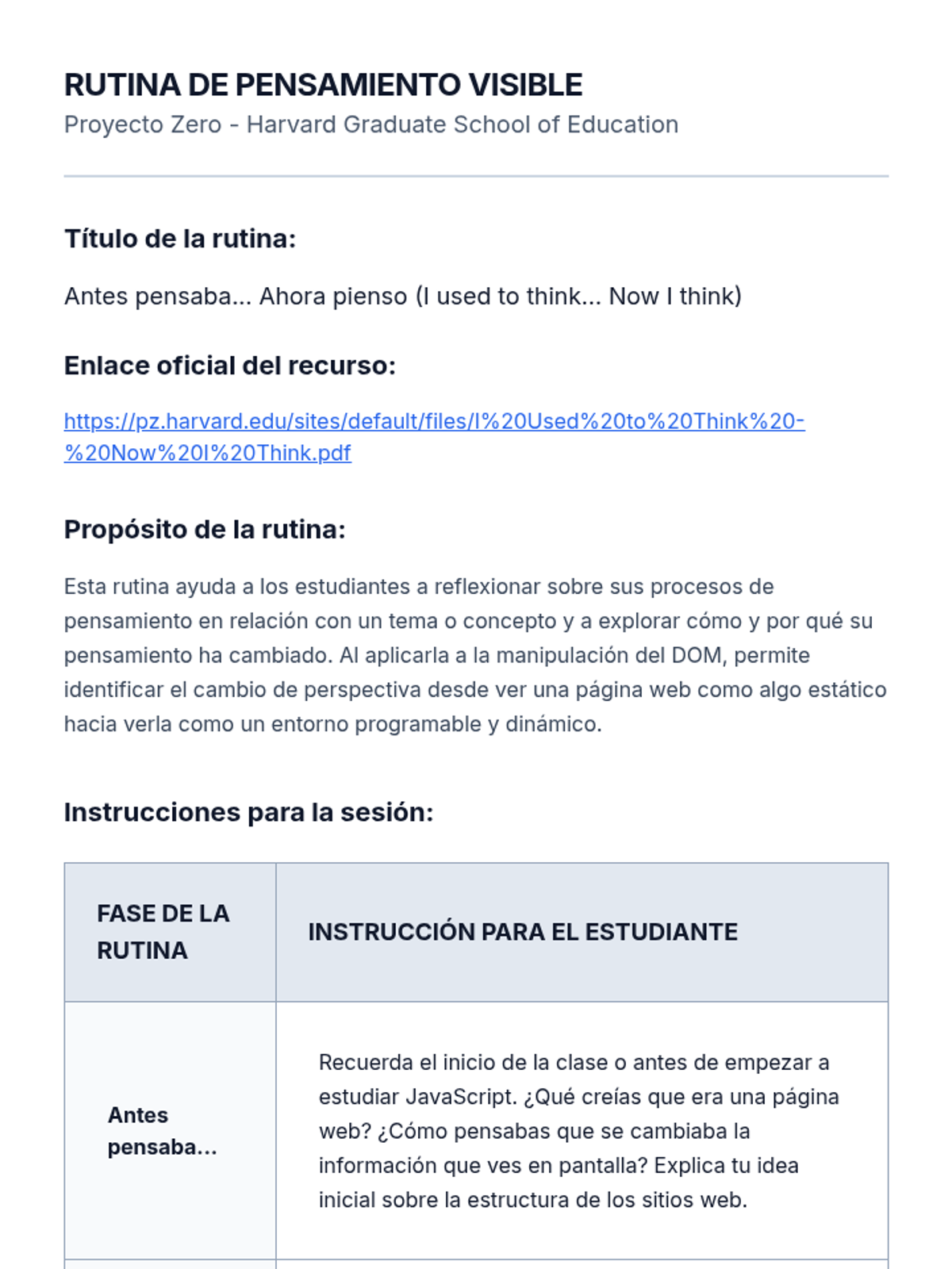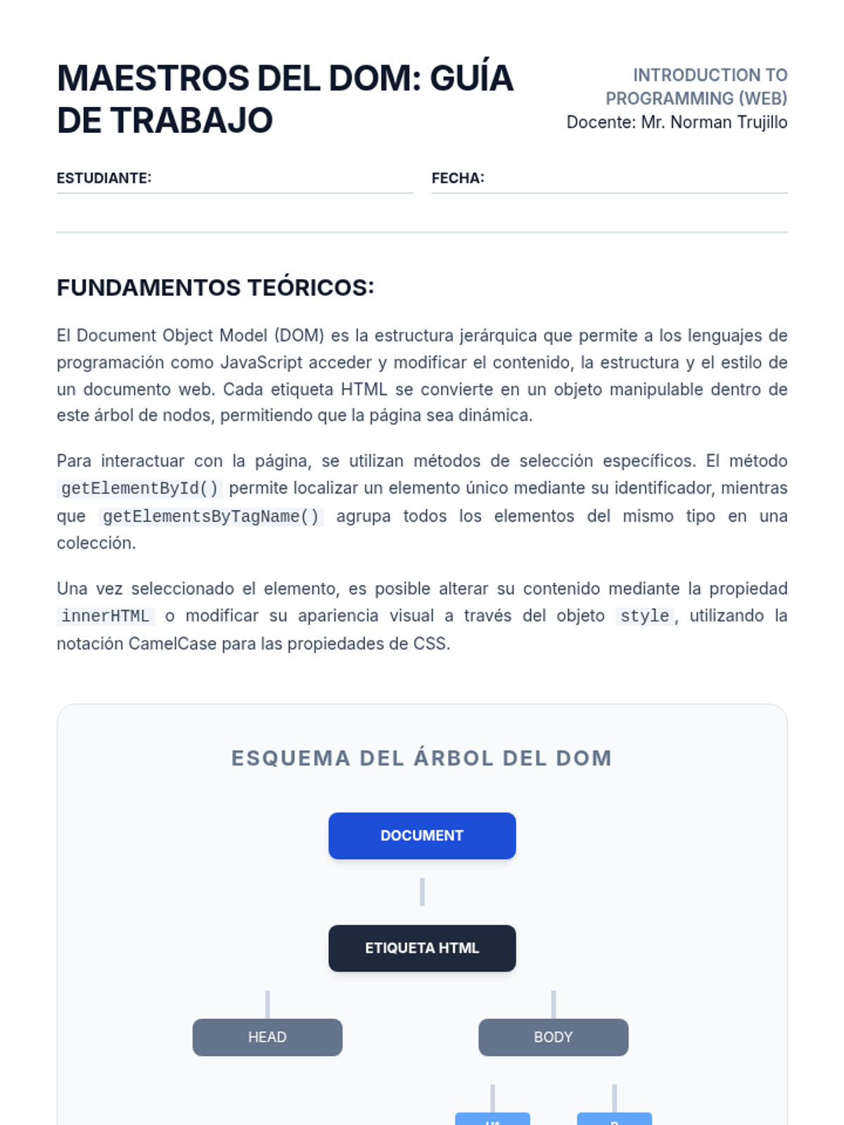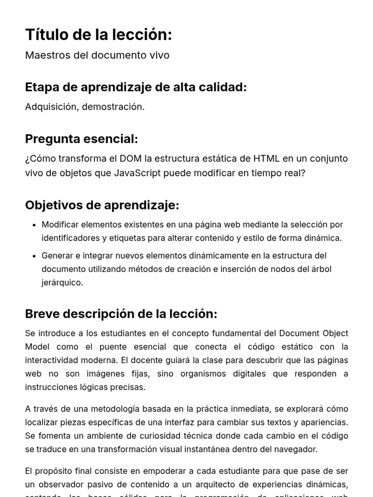 Plan de lección completo sobre la manipulación del Document Object Model (DOM) utilizando JavaScript para estudiantes de nivel inicial en programación web. Incluye teoría, ejercicios prácticos integrados y rutinas de pensamiento.