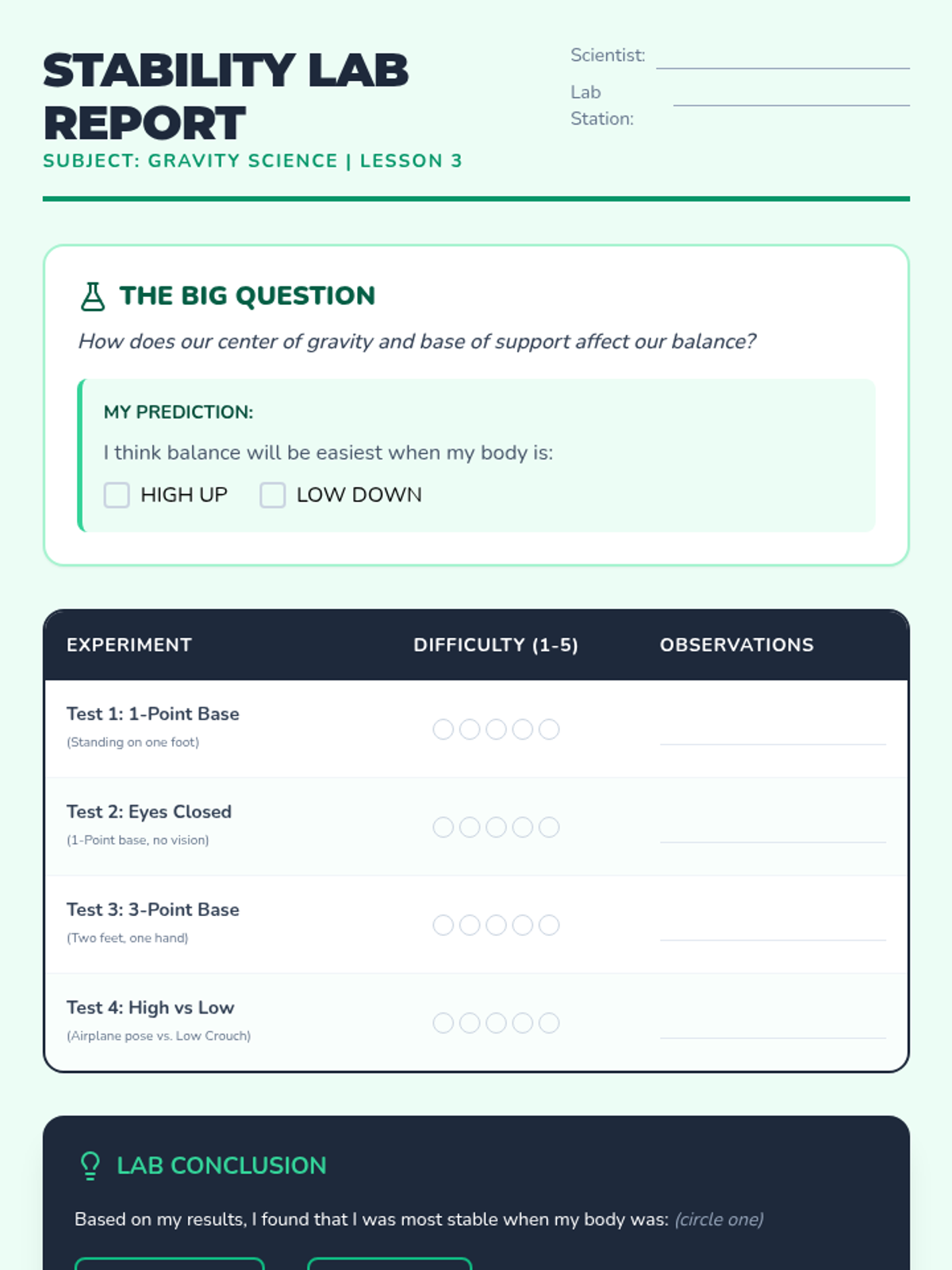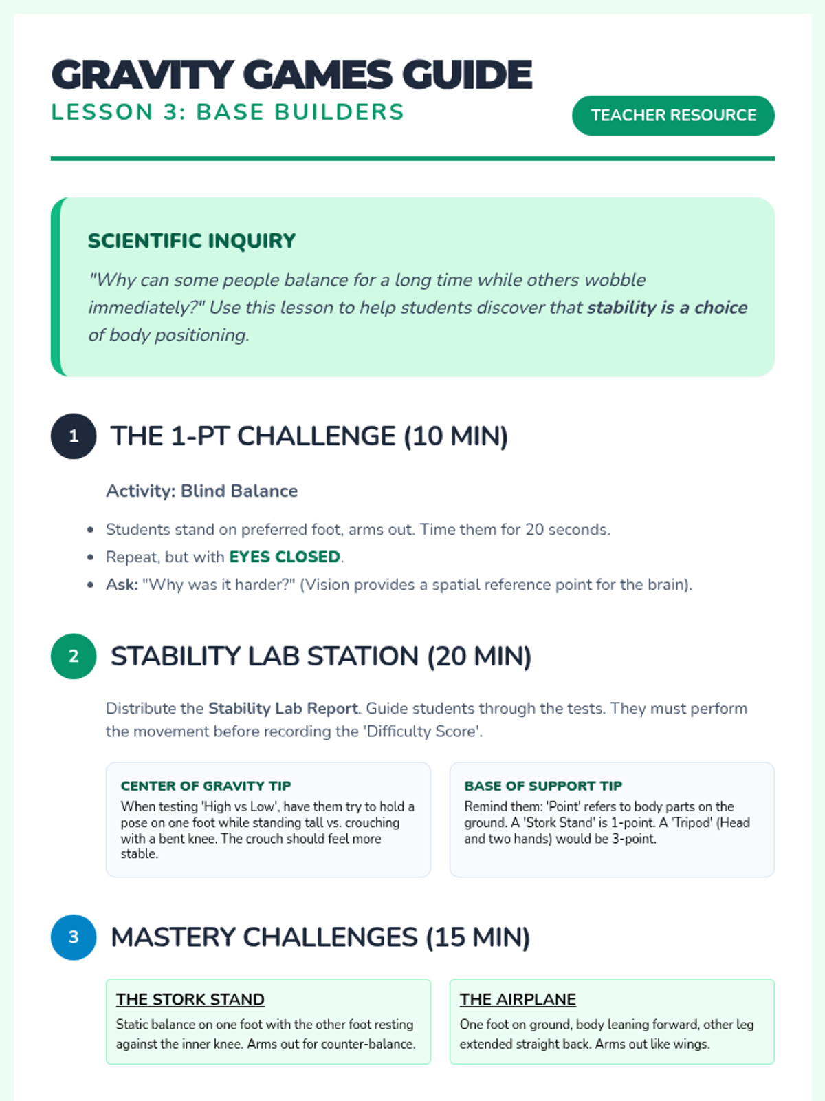 Students experiment with center of gravity and bases of support to maintain stability in various static poses.