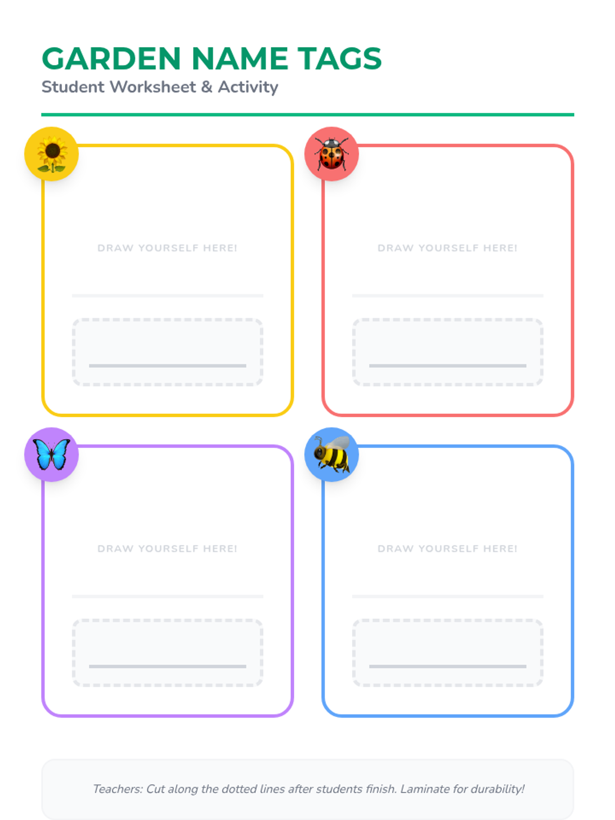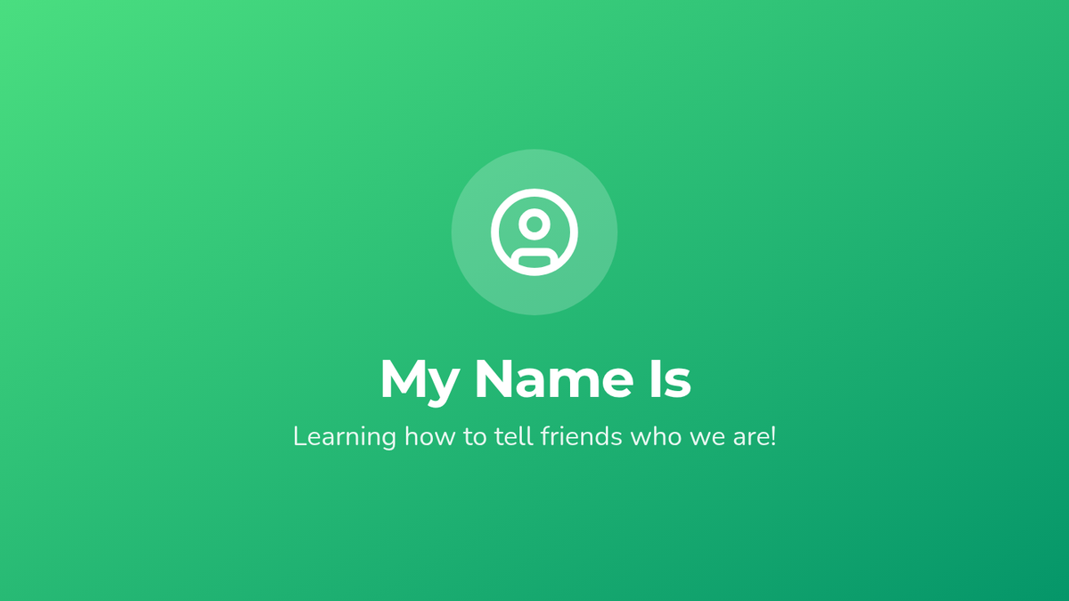 Learners practice the phrase 'My name is...' using a ball-toss circle activity and creating personalized name tags.