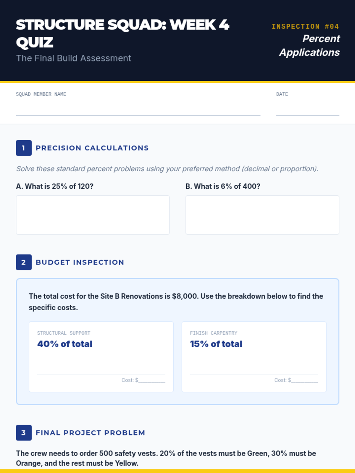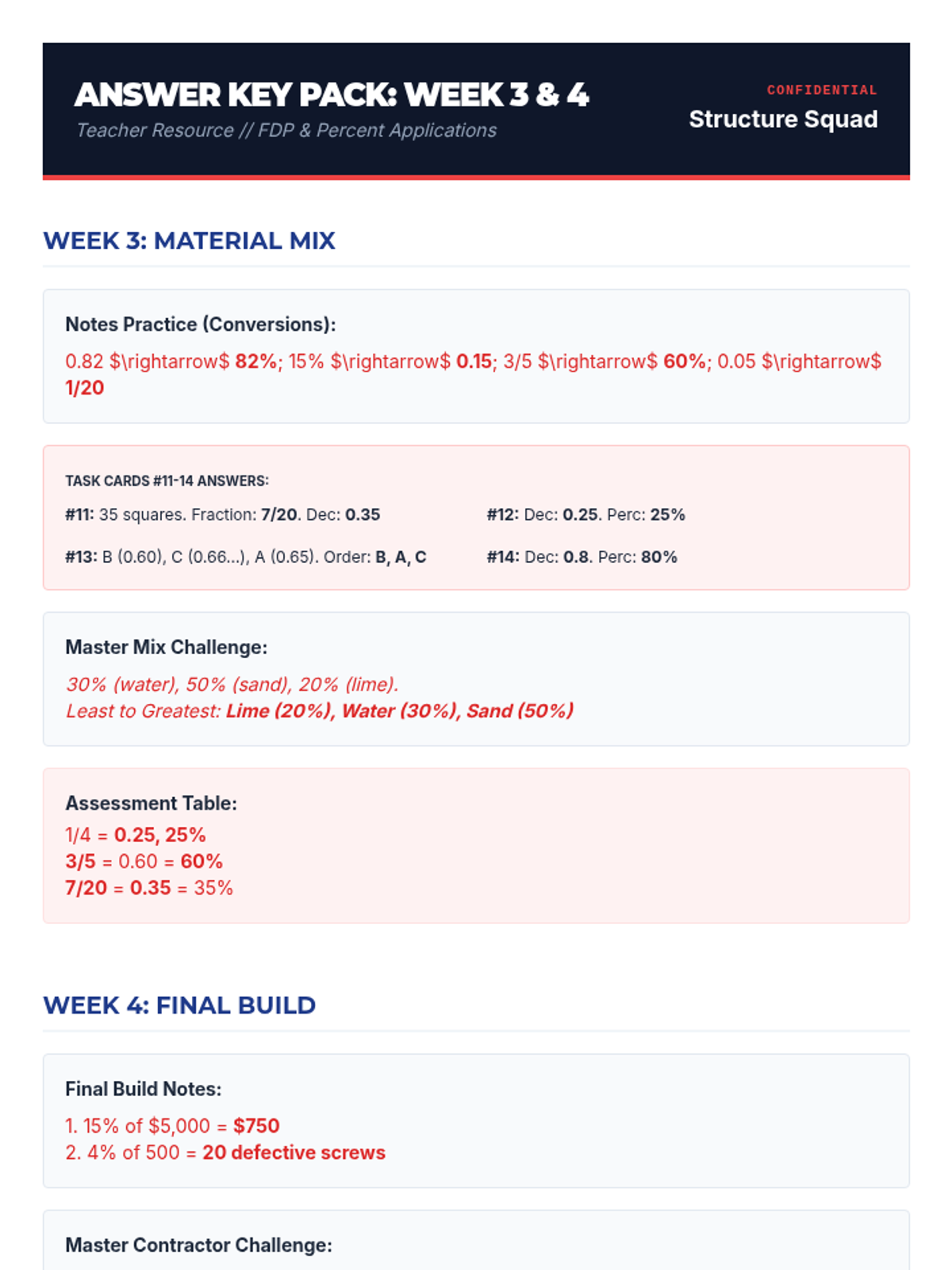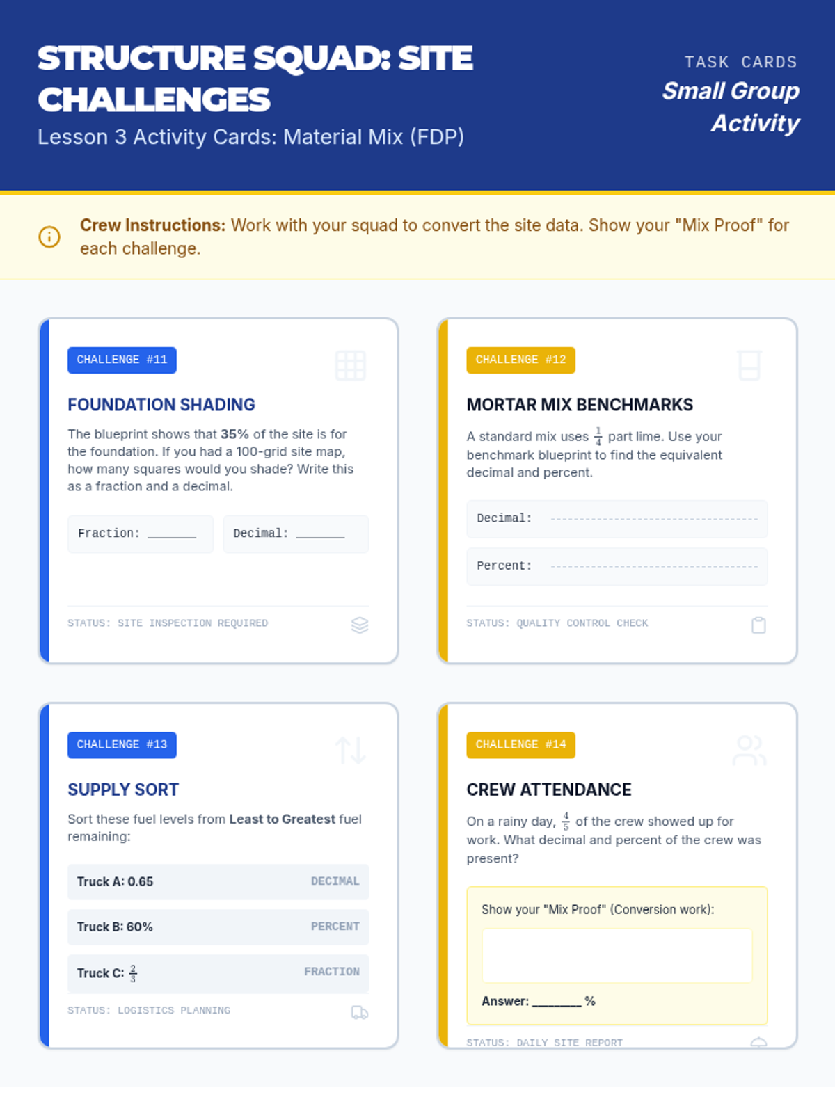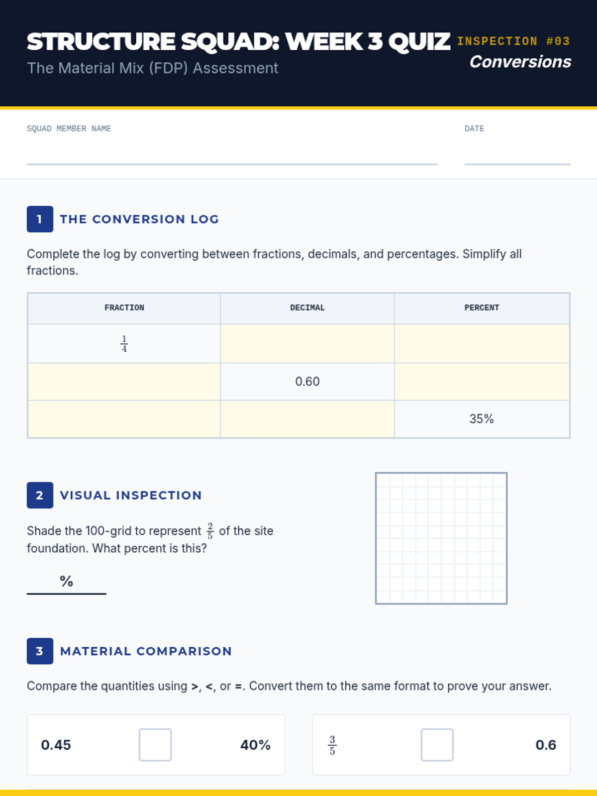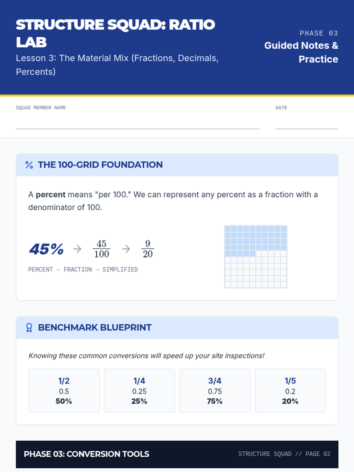 Students will master the "Material Mix" by converting between fractions, decimals, and percentages using visual models and benchmark values.