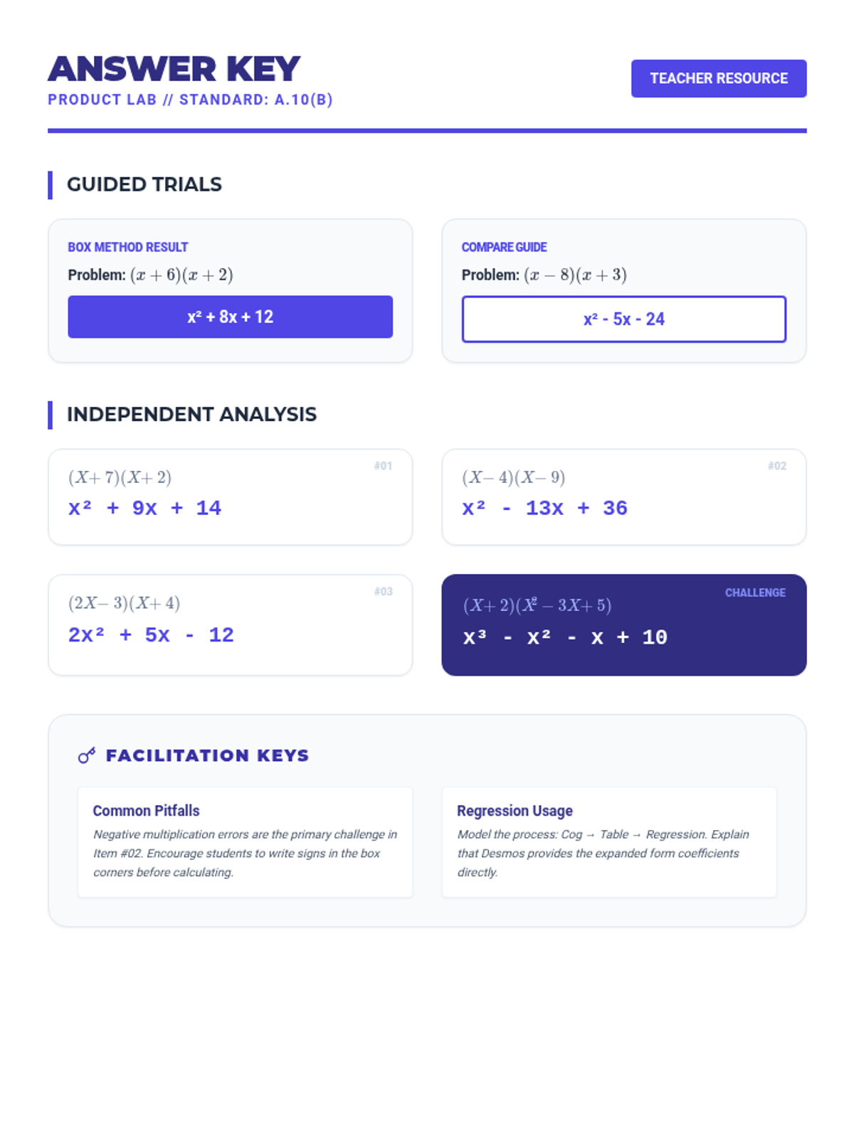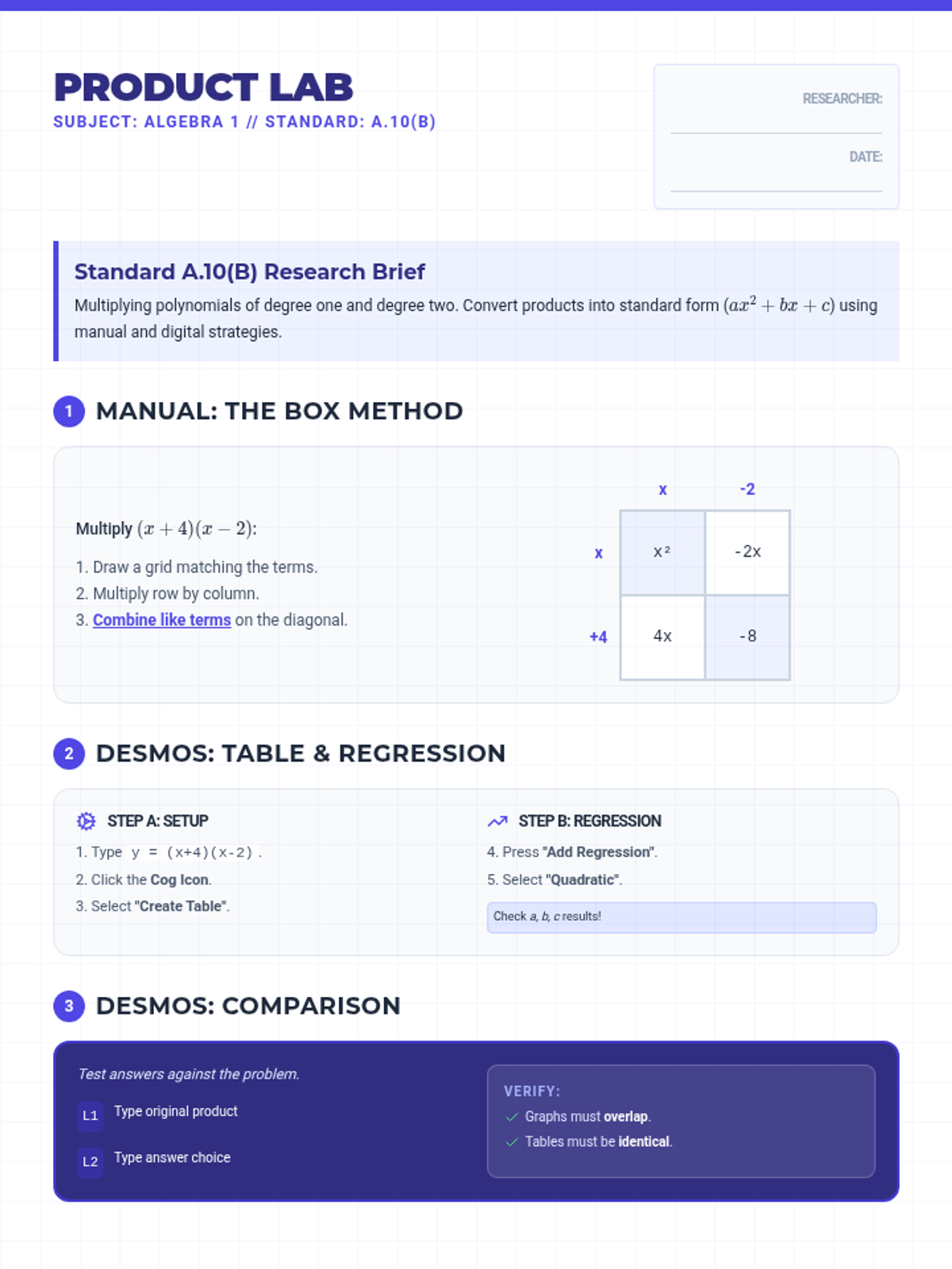 A comprehensive guide and practice set for mastering Algebra 1 standard 10.B (Factoring Quadratics), focusing on manual calculation and Desmos-based strategies.