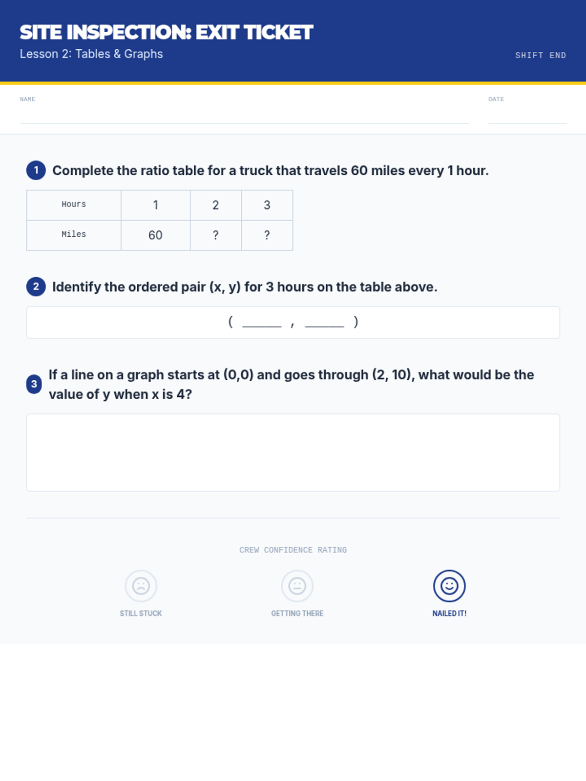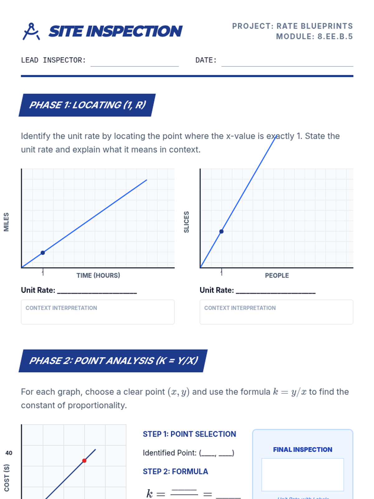 In this lesson, students will master the art of finding and interpreting the unit rate from proportional graphs. They will learn to identify the point (1, r) and use the ratio y/x to build mathematical models of real-world relationships.