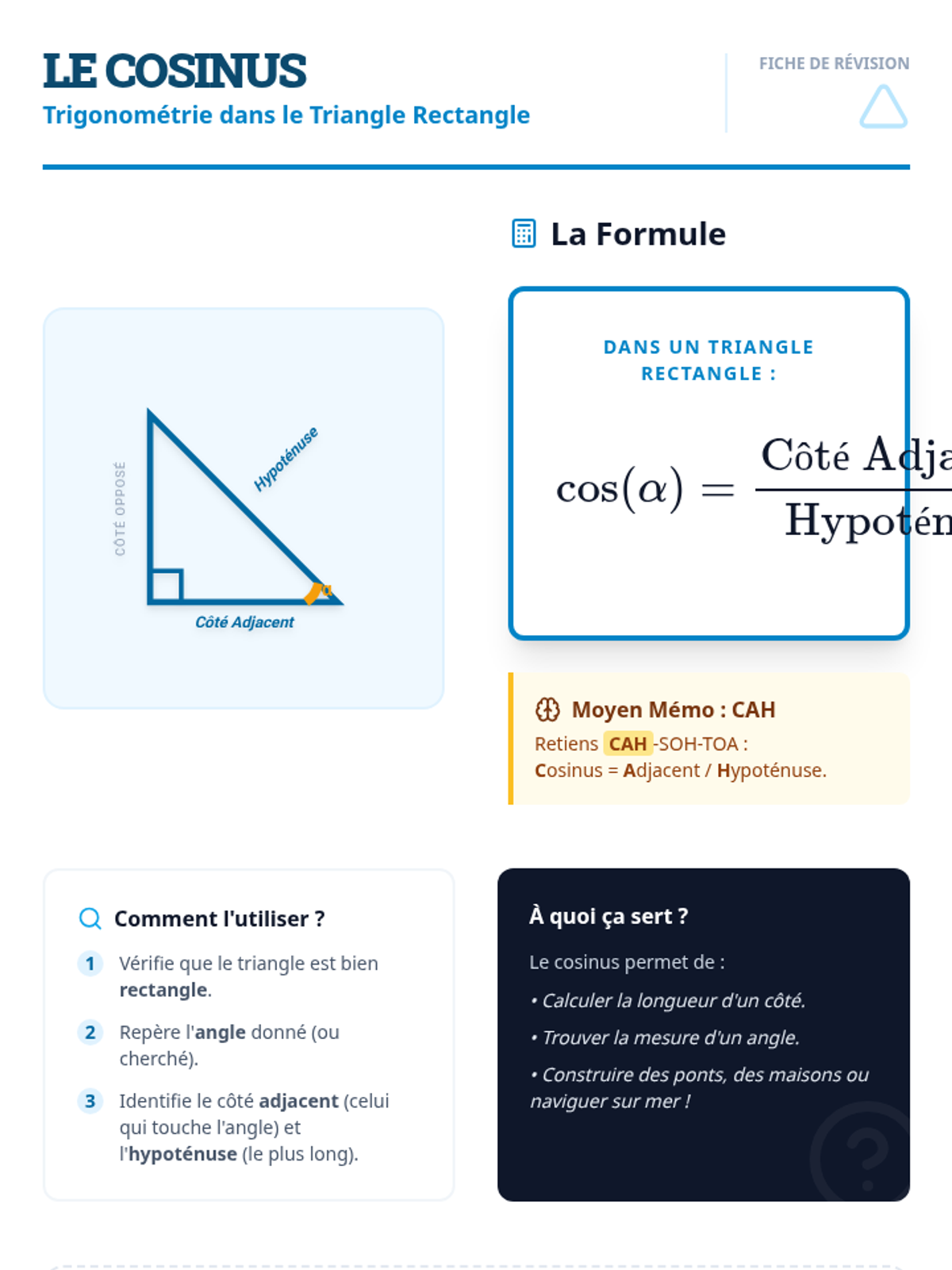 Une introduction au cosinus dans le triangle rectangle, incluant la formule et le moyen mnémotechnique CAH.