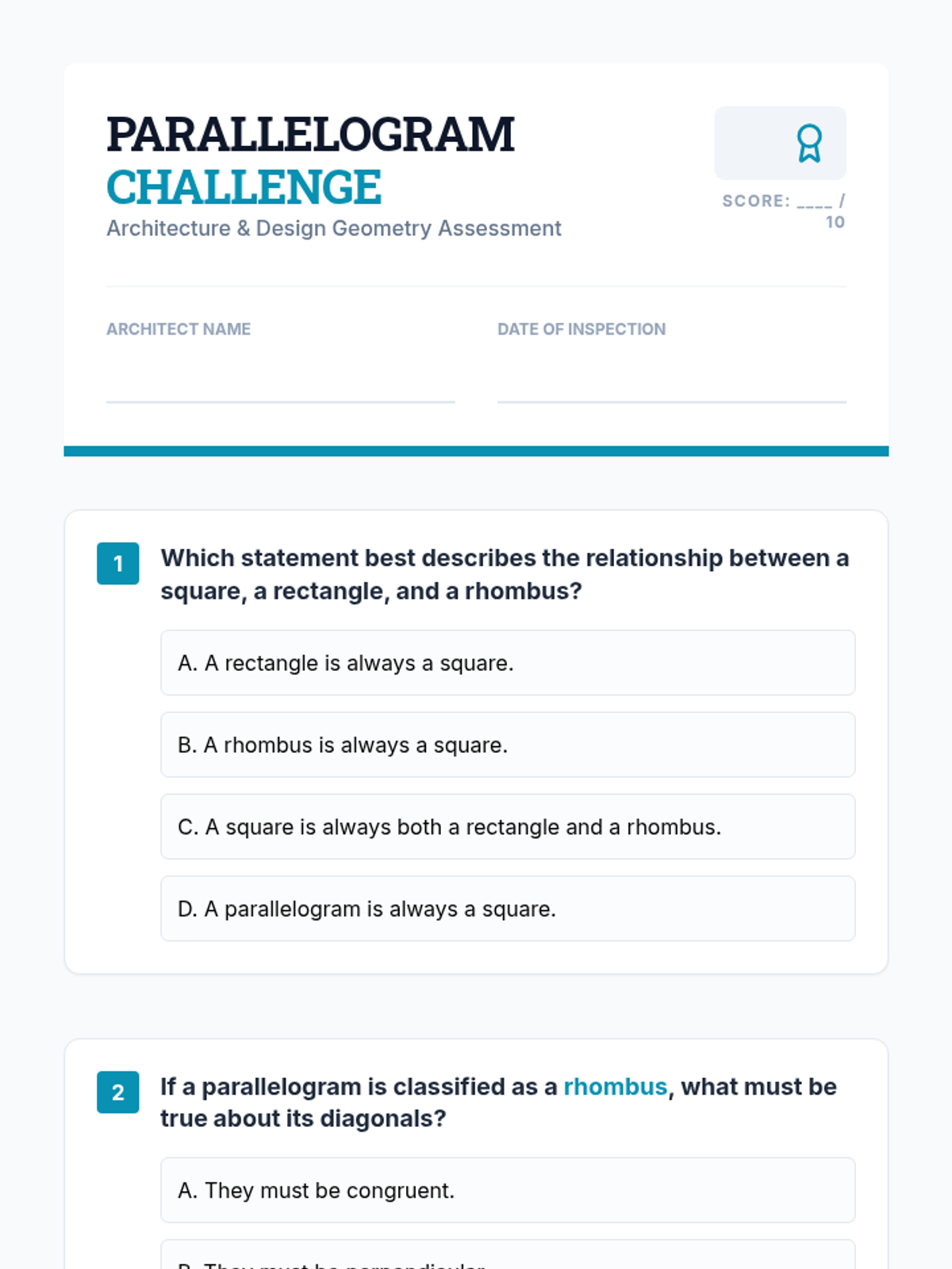 A comprehensive lesson on special parallelograms (rectangles, rhombuses, and squares), focusing on their unique properties, hierarchy, and real-world applications in architecture and design.