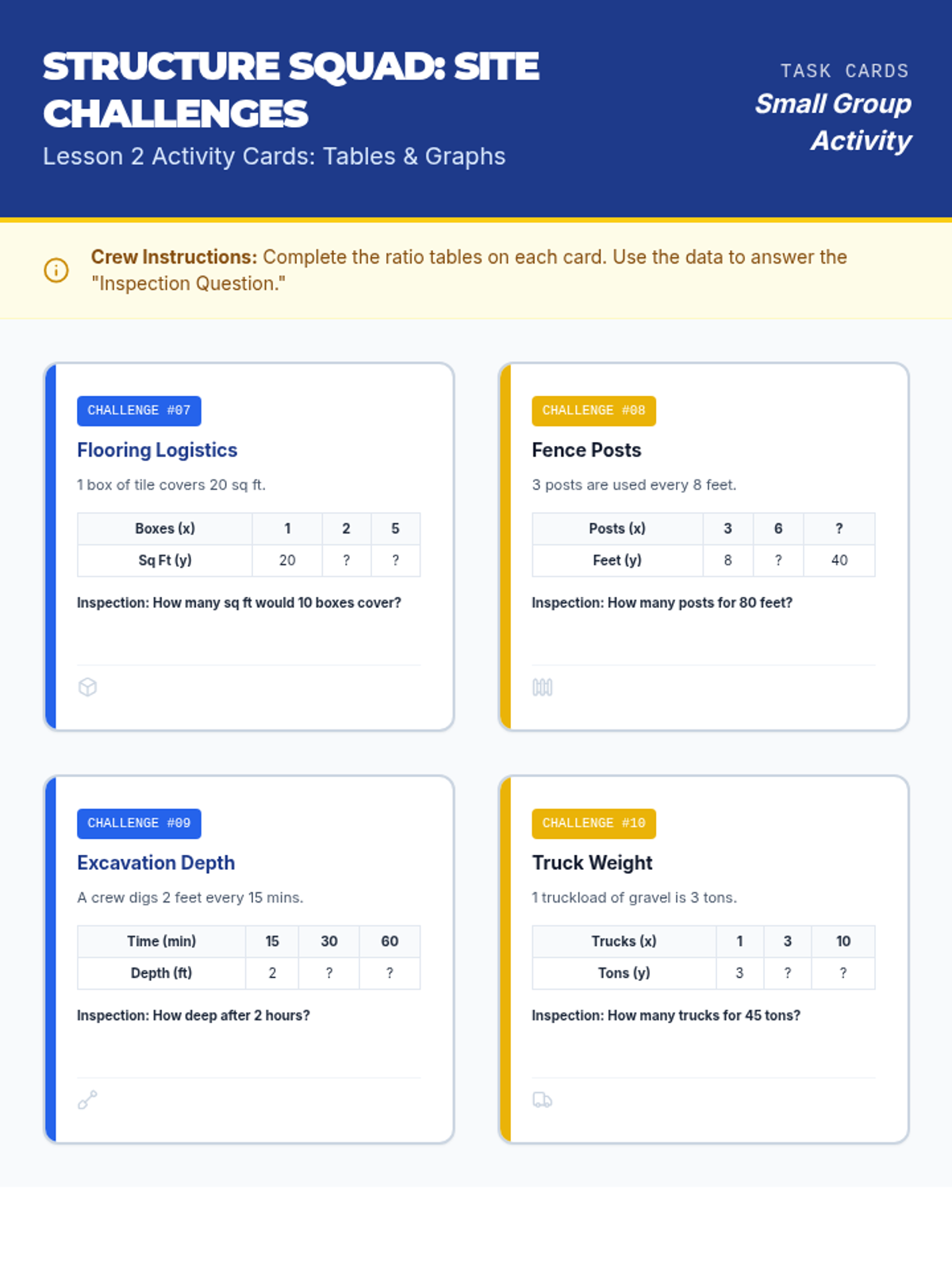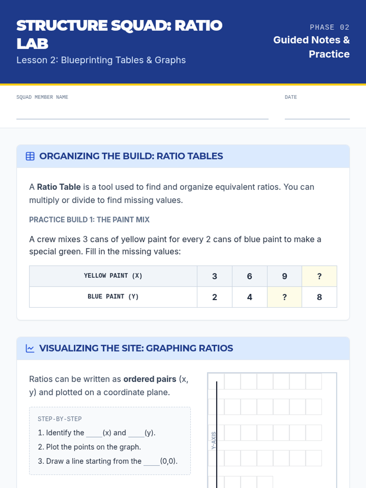 Focuses on using ratio tables to organize data and plotting those ratios as coordinates on a graph to visualize relationships.