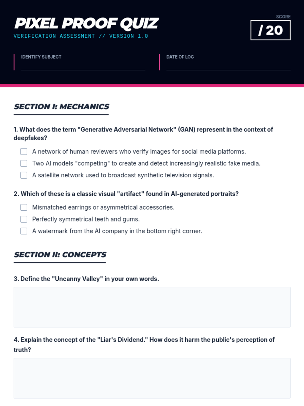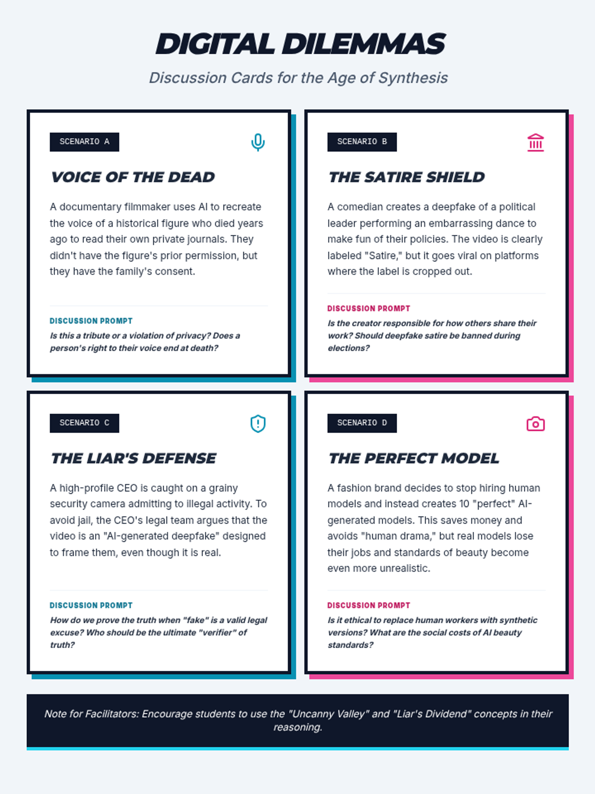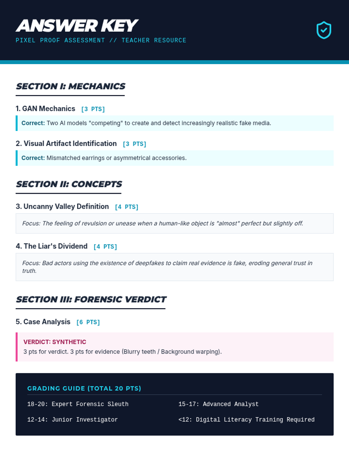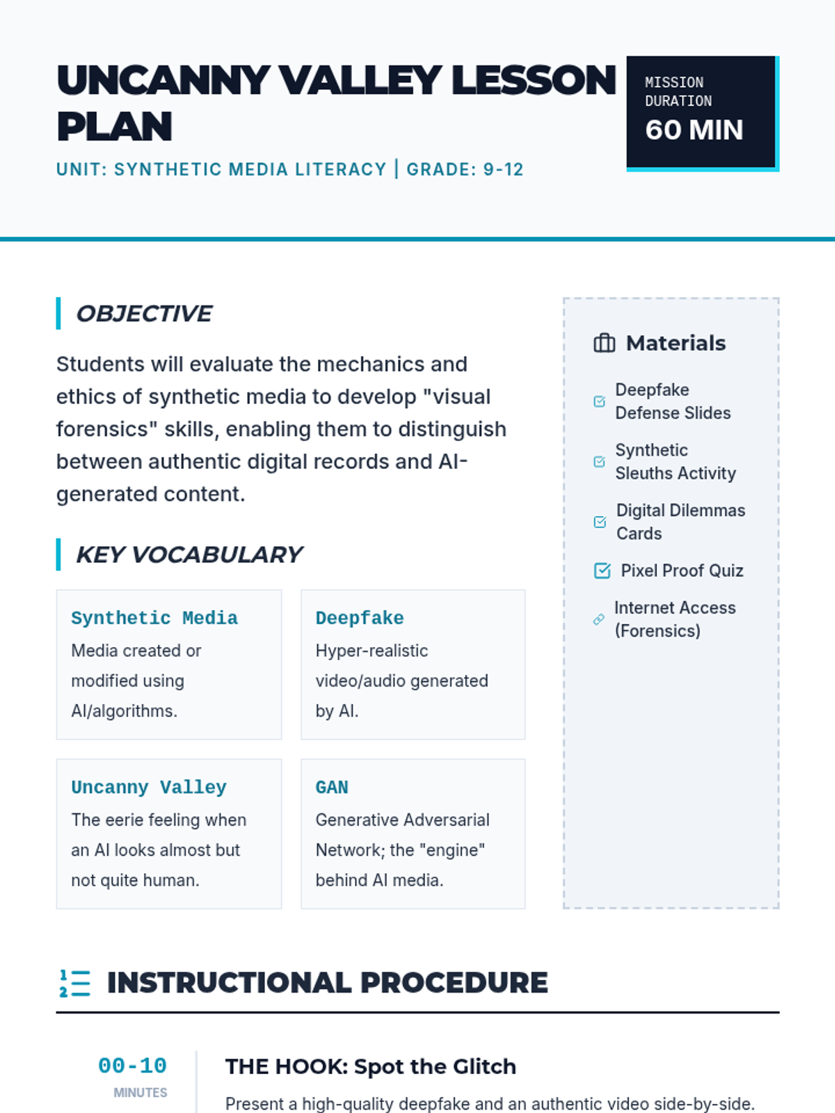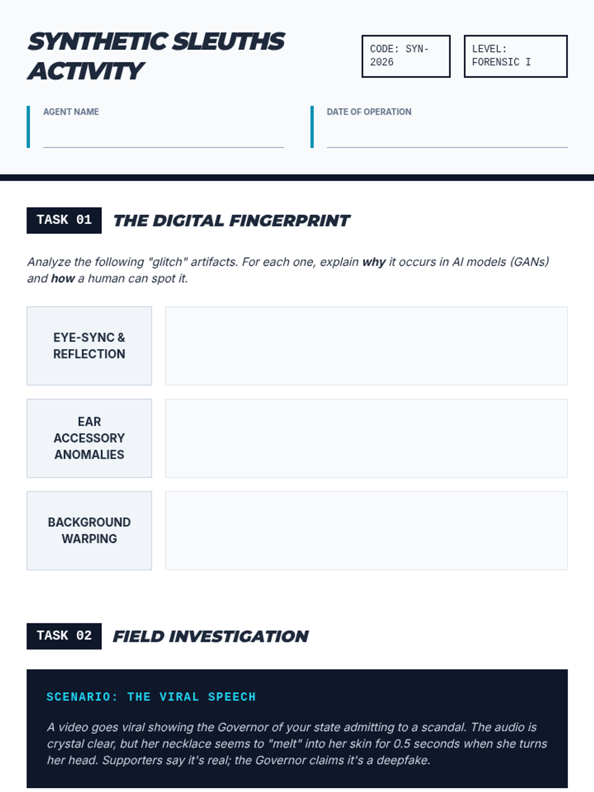 A high-school module focused on identifying synthetic media and understanding the ethical implications of deepfakes through visual forensics.