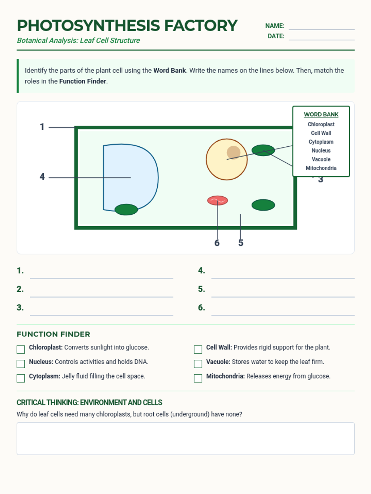 Students explore the structure of plant cells within a leaf to understand how specific organelles contribute to the process of photosynthesis. This lesson aligns with NGSS MS-LS1-2, focusing on cell parts and their functions.