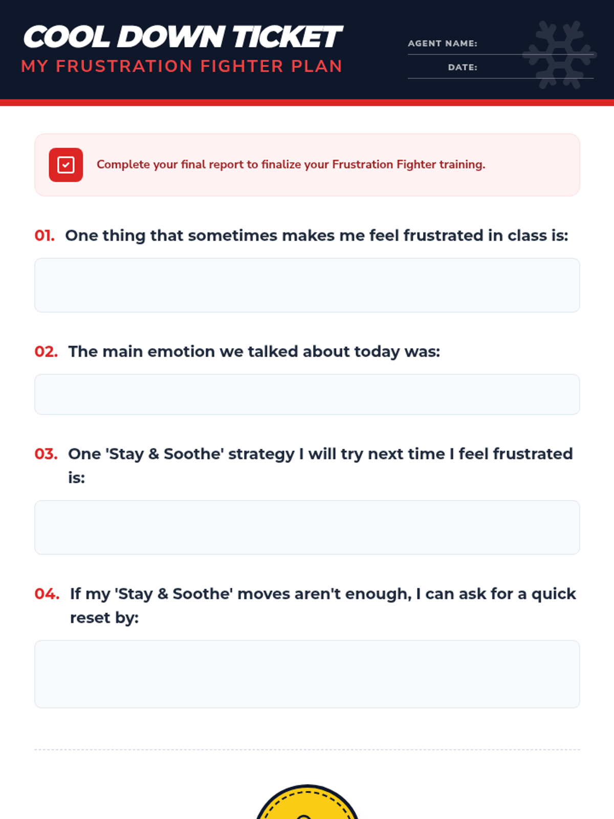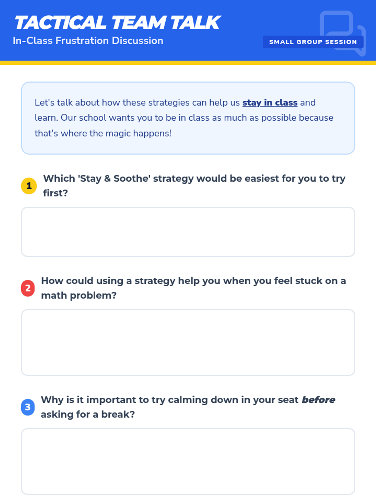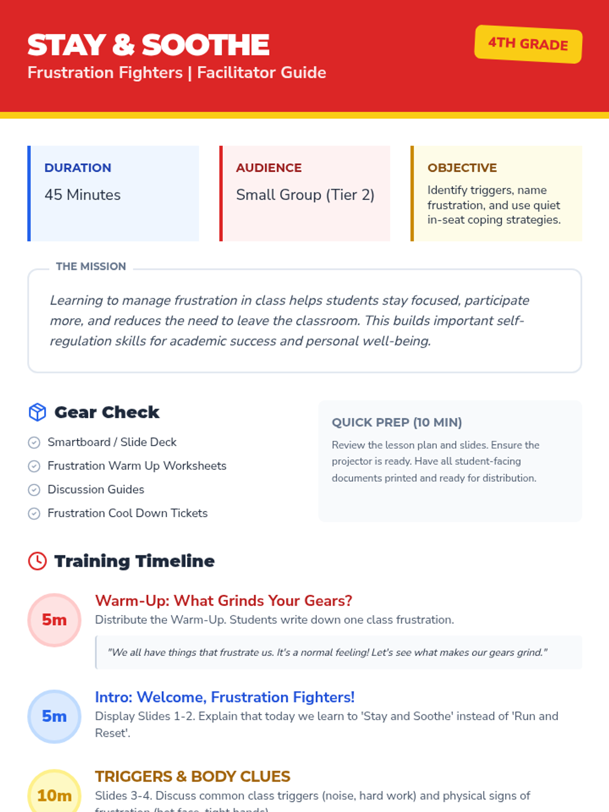 A 45-minute lesson for 4th-grade small groups teaching students to identify frustration triggers, name emotions, and use coping strategies to self-soothe in class.