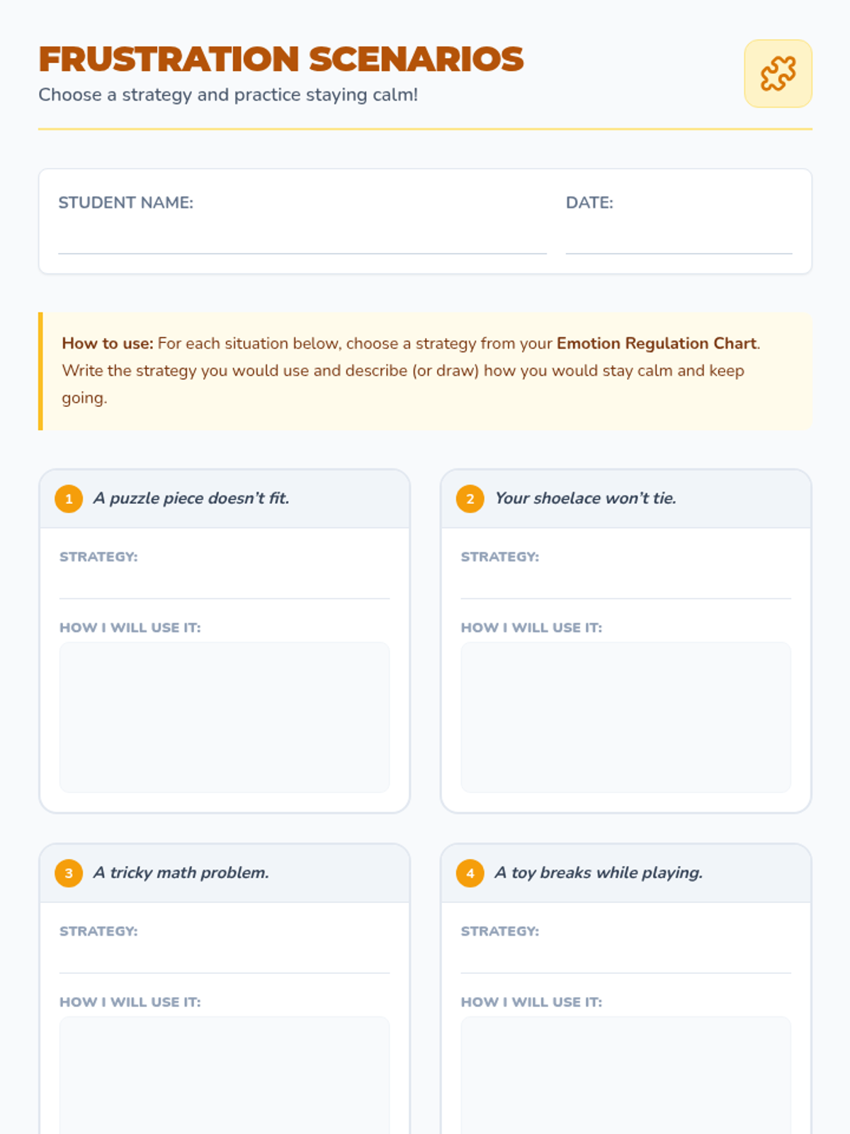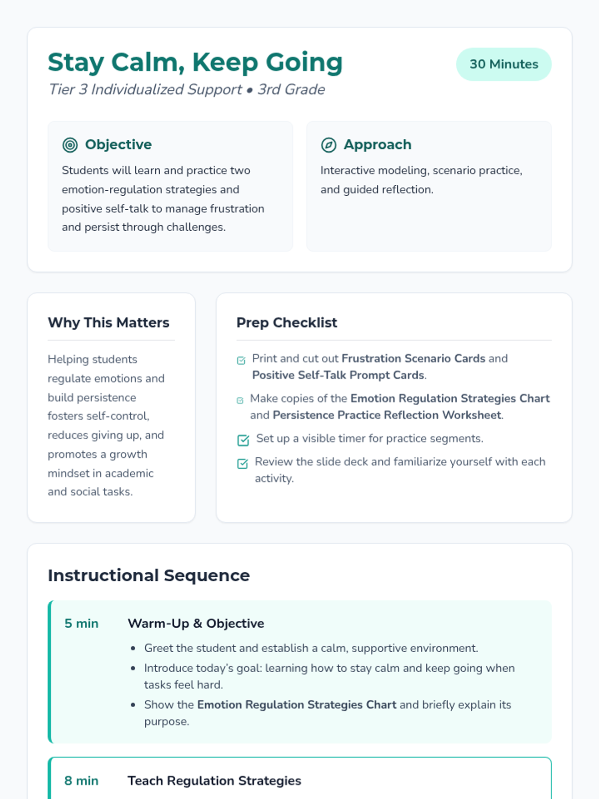 A 30-minute Tier 3 individualized lesson for 3rd graders focusing on emotion regulation and persistence through deep breathing, counting, and positive self-talk.
