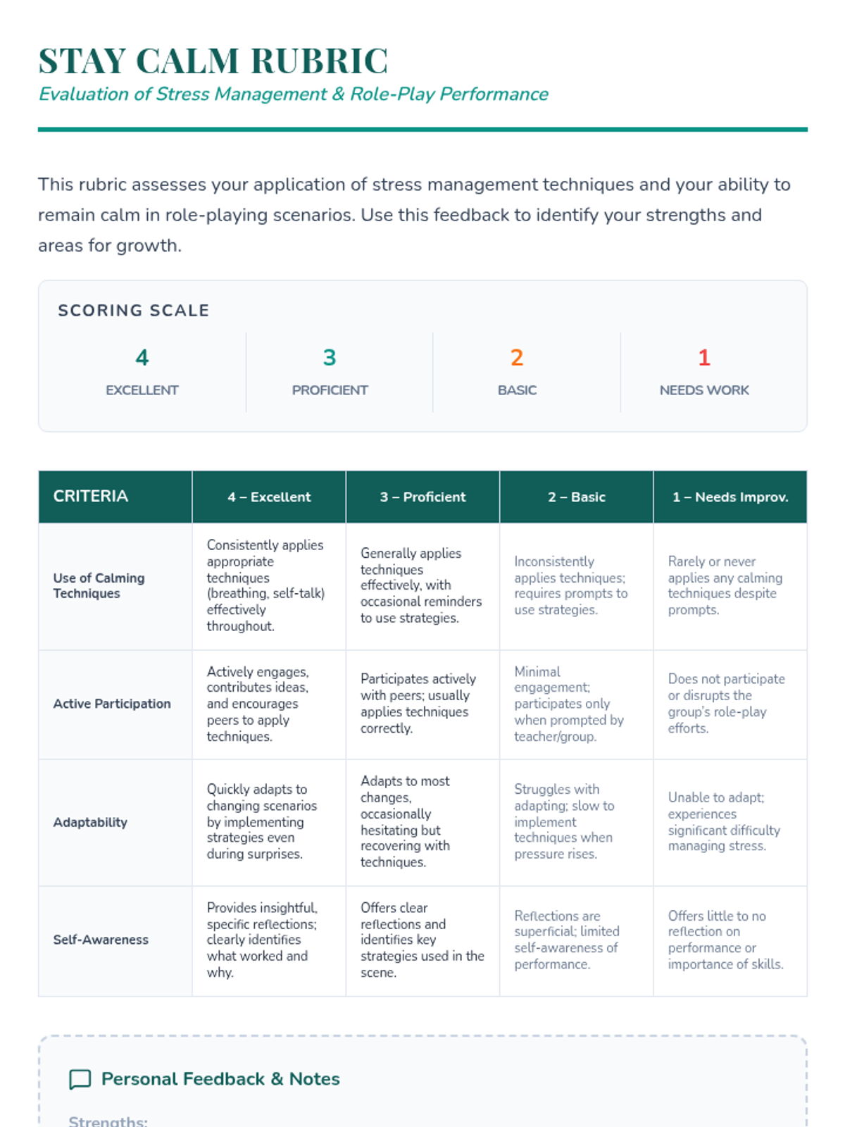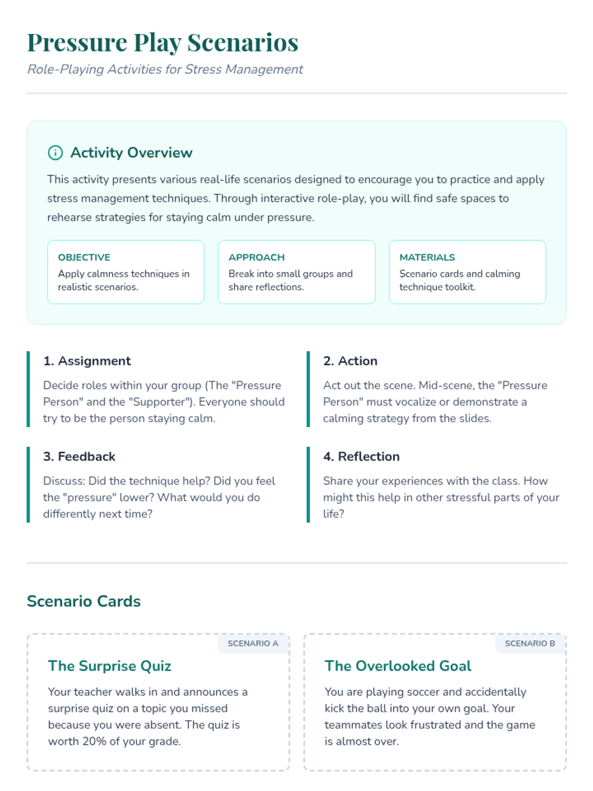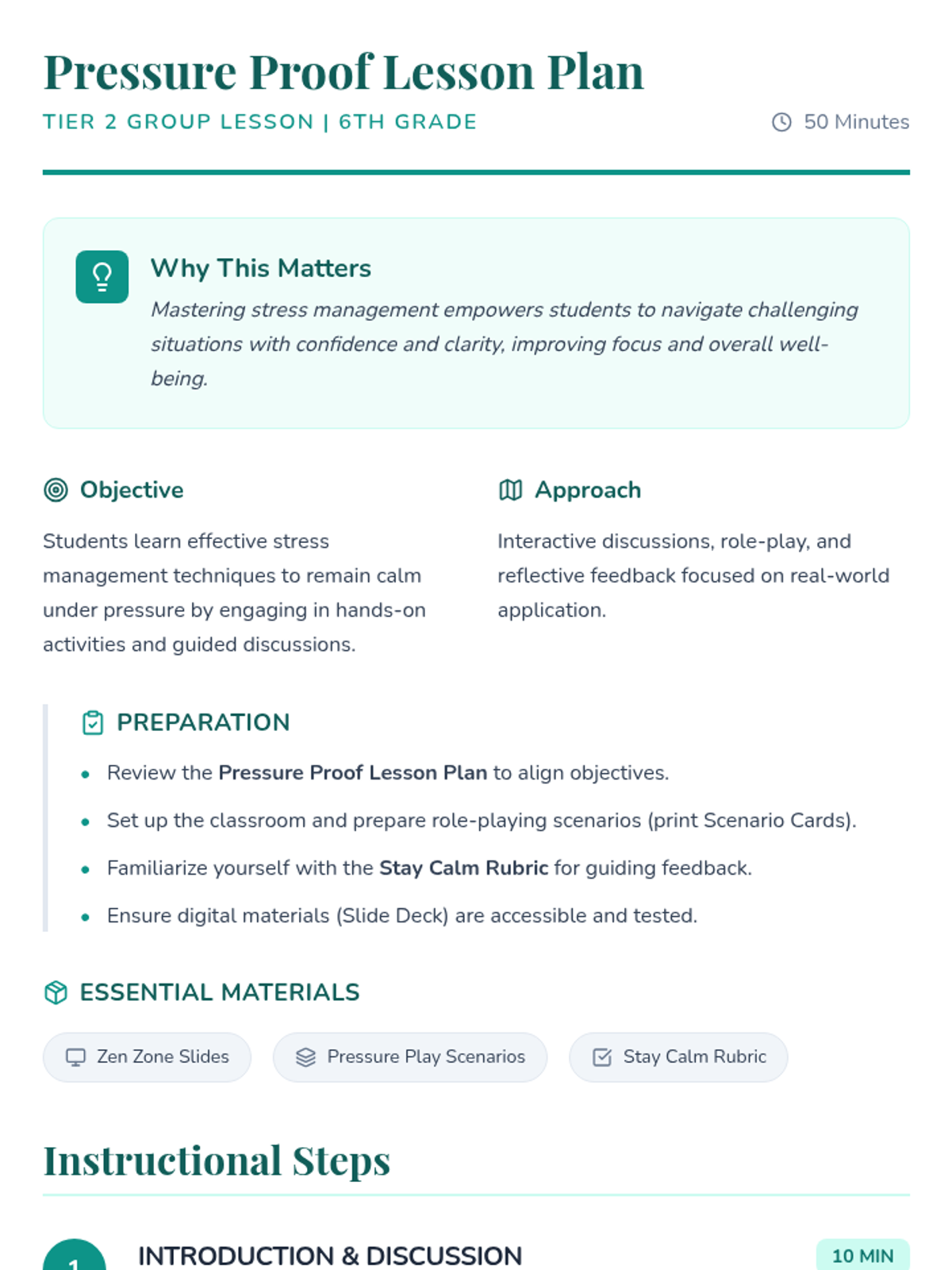 A 50-minute Tier 2 group lesson for 6th graders focused on learning and practicing stress management techniques to remain calm under pressure.