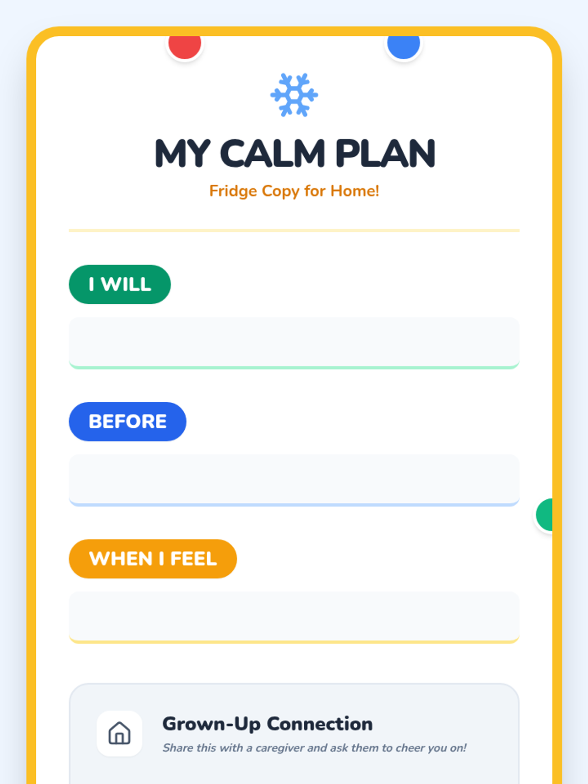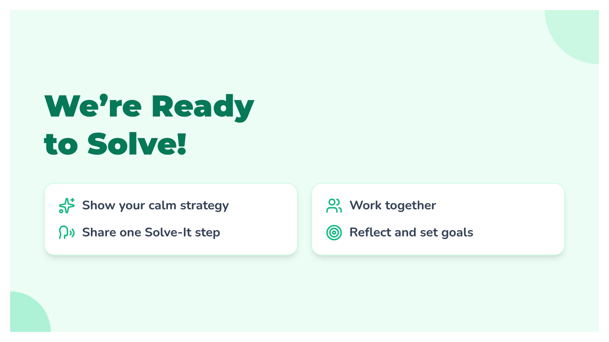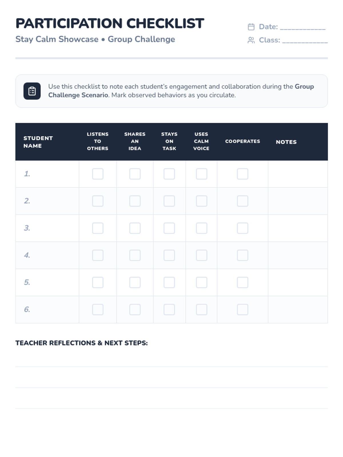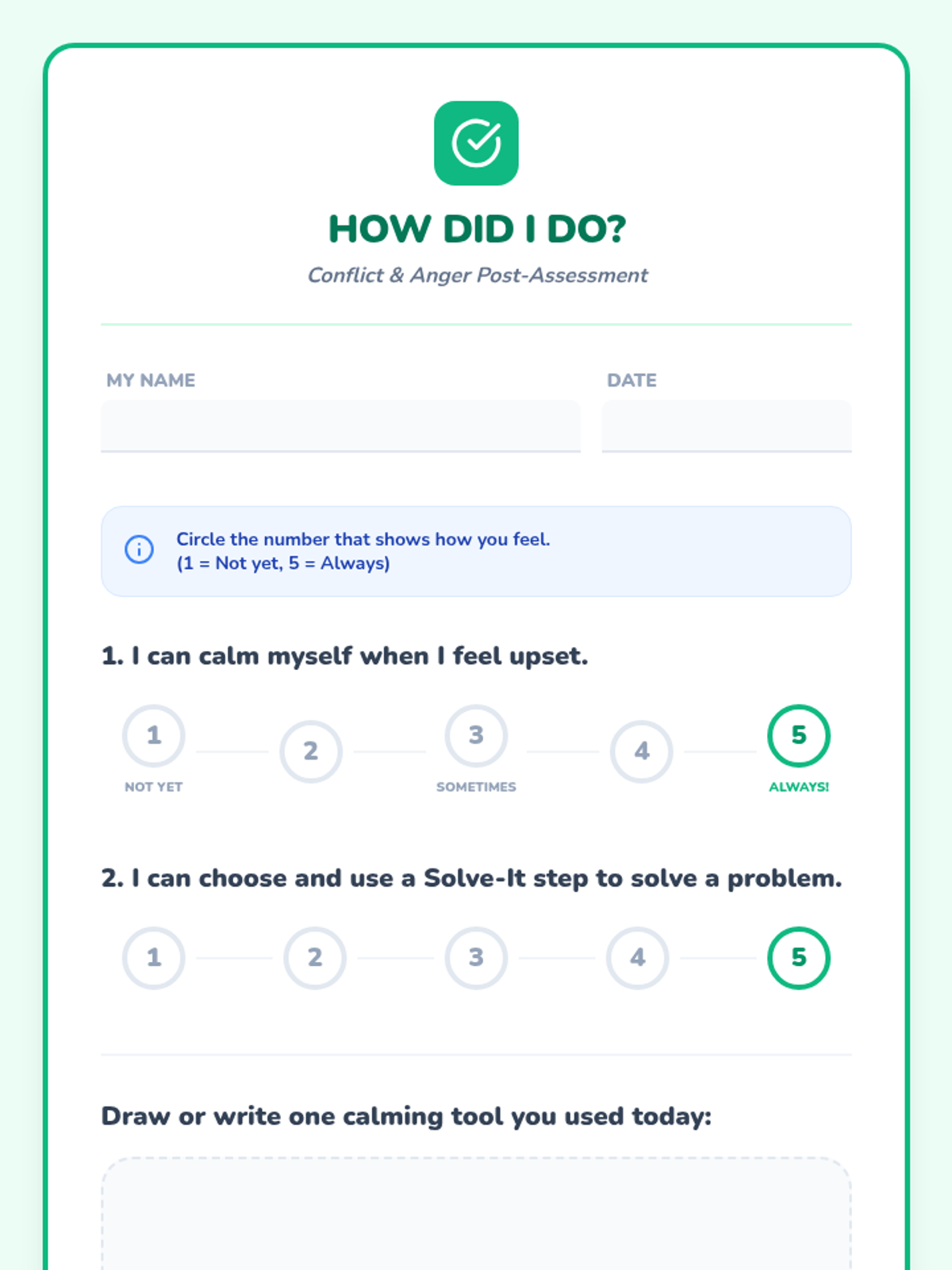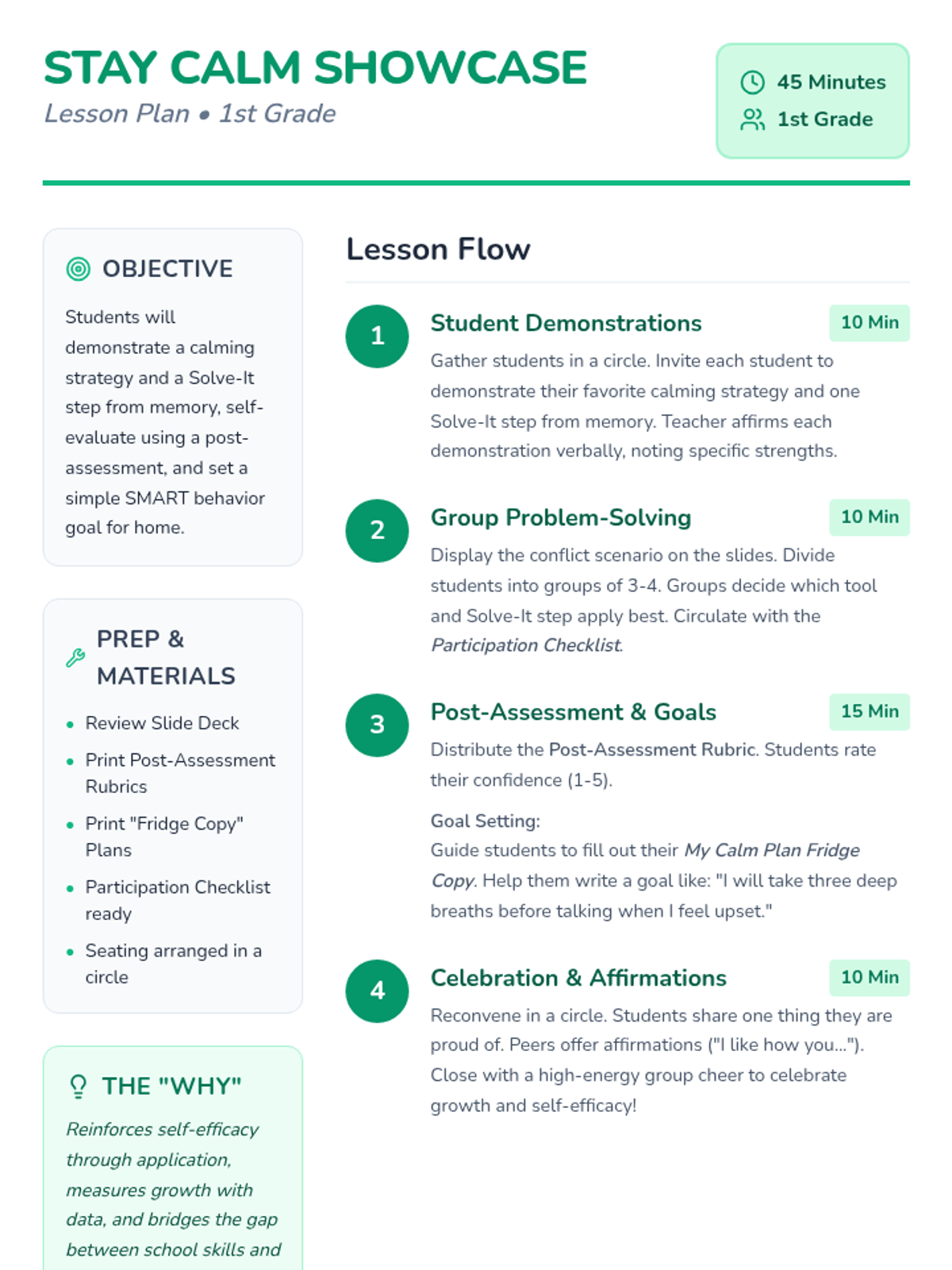 A 45-minute 1st-grade lesson where students demonstrate calming strategies, complete a self-assessment, and set behavior goals to share with caregivers.