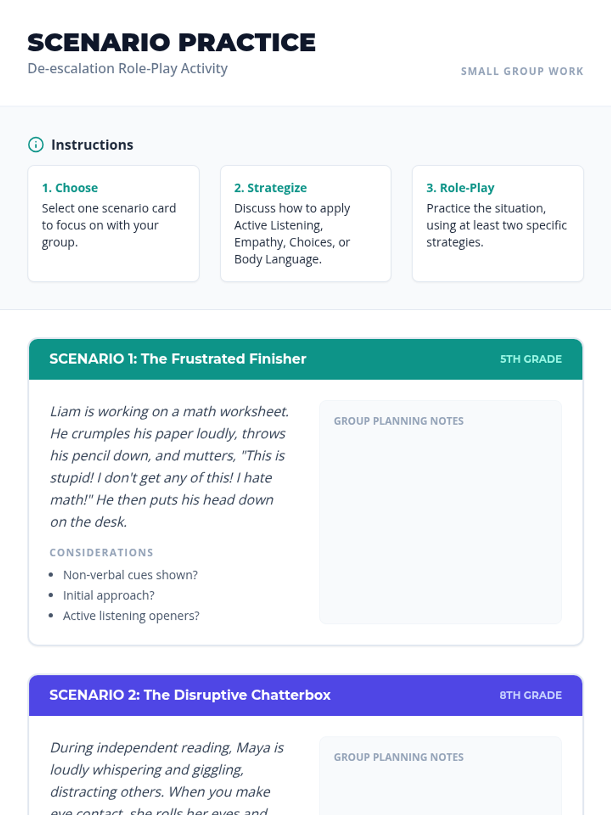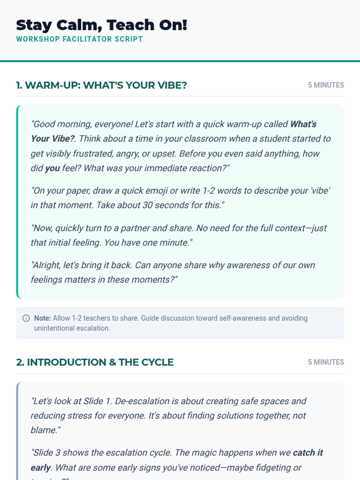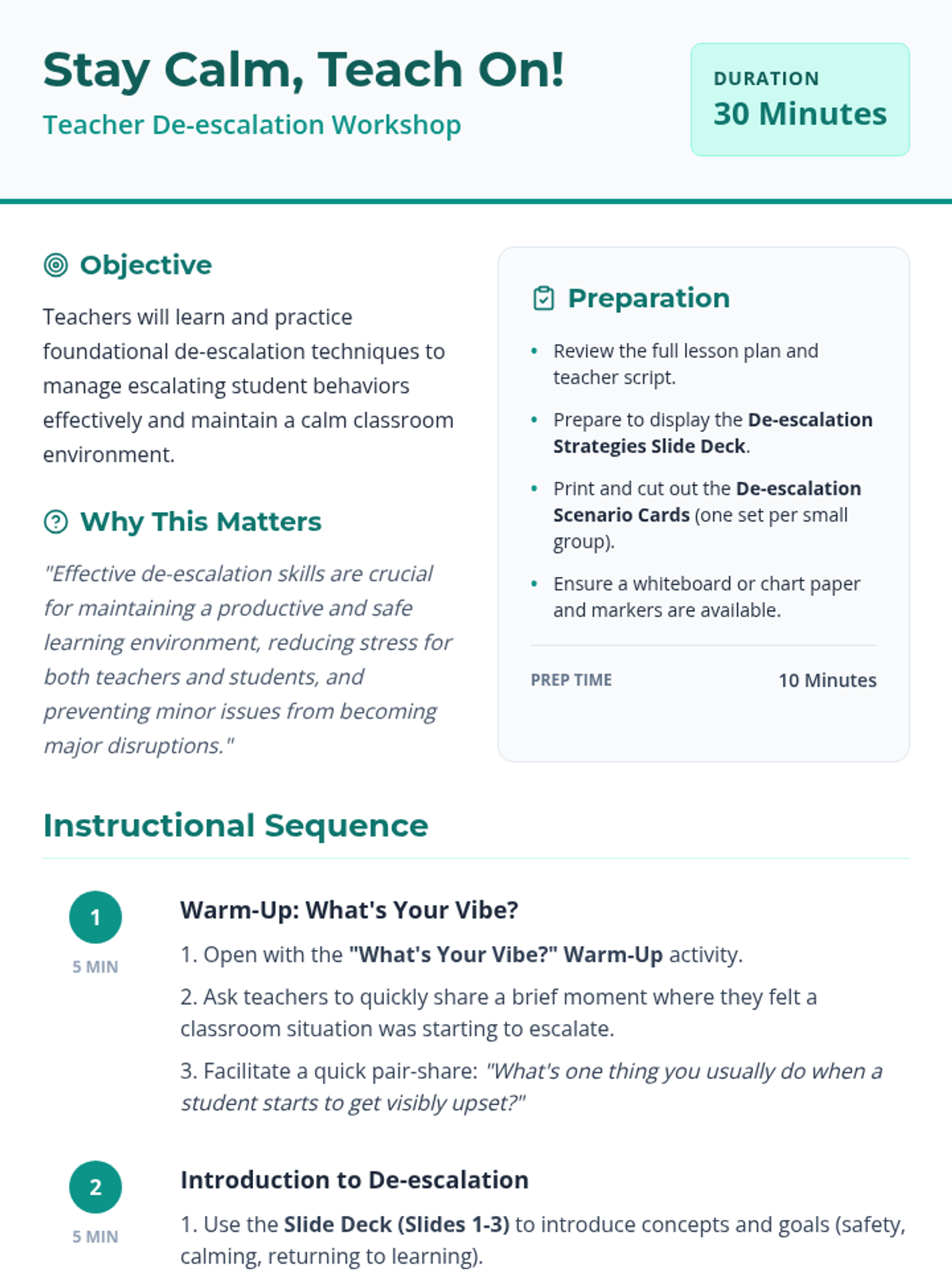 A 30-minute professional development session for teachers focused on practical de-escalation strategies to maintain a calm and productive classroom environment. Educators will learn to recognize signs of escalation and practice active listening, empathy, and providing choices.