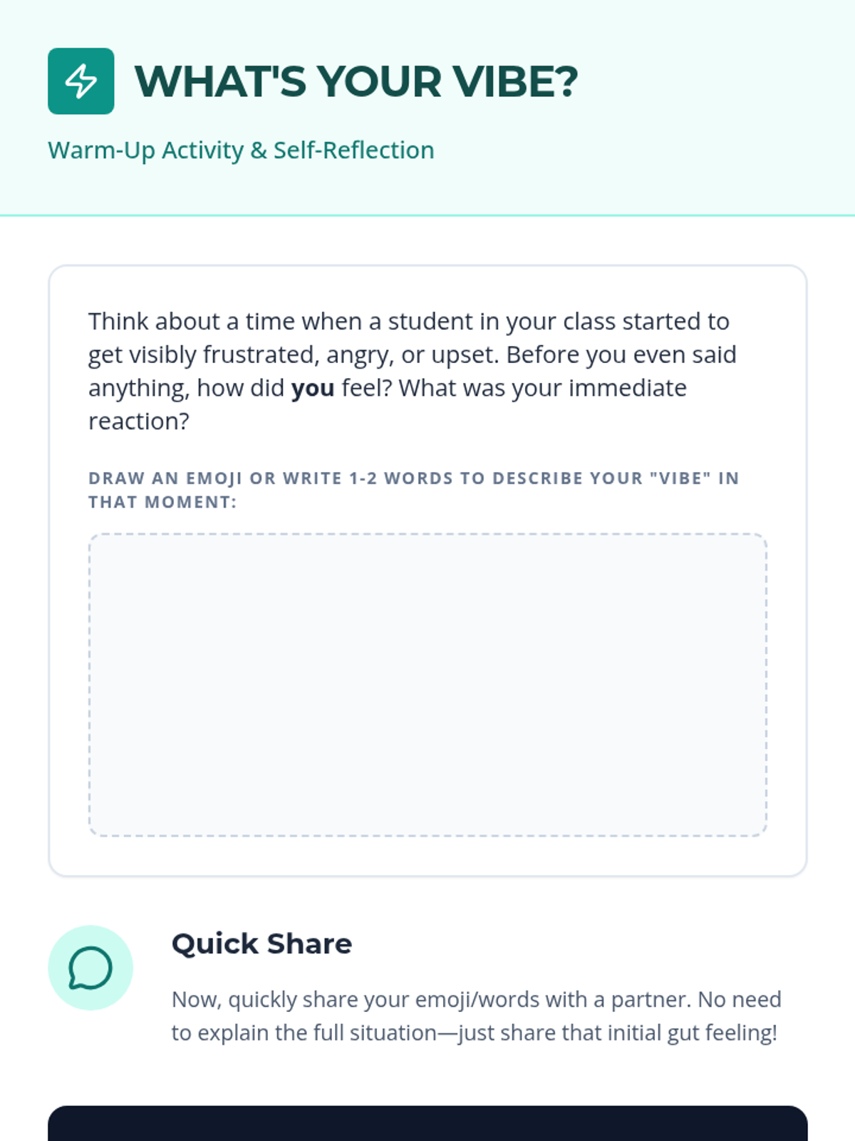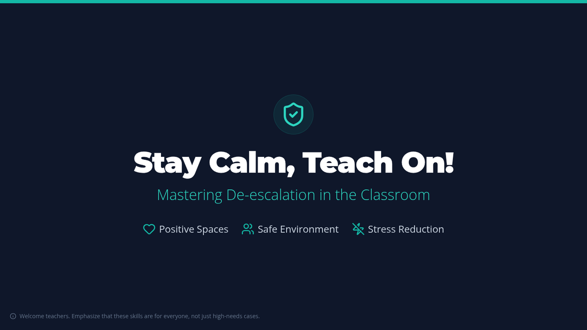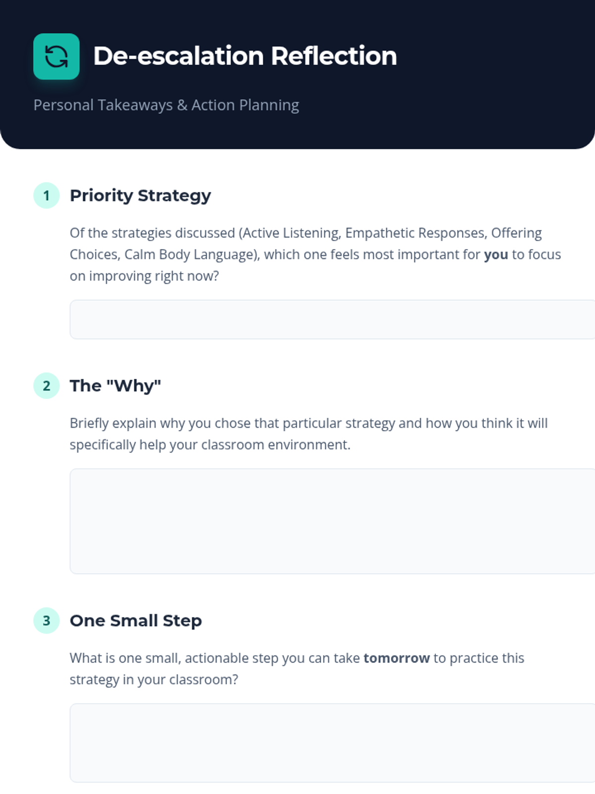 A 30-minute professional development session for teachers focused on practical de-escalation strategies to maintain a calm and productive classroom environment. Educators will learn to recognize signs of escalation and practice active listening, empathy, and providing choices.