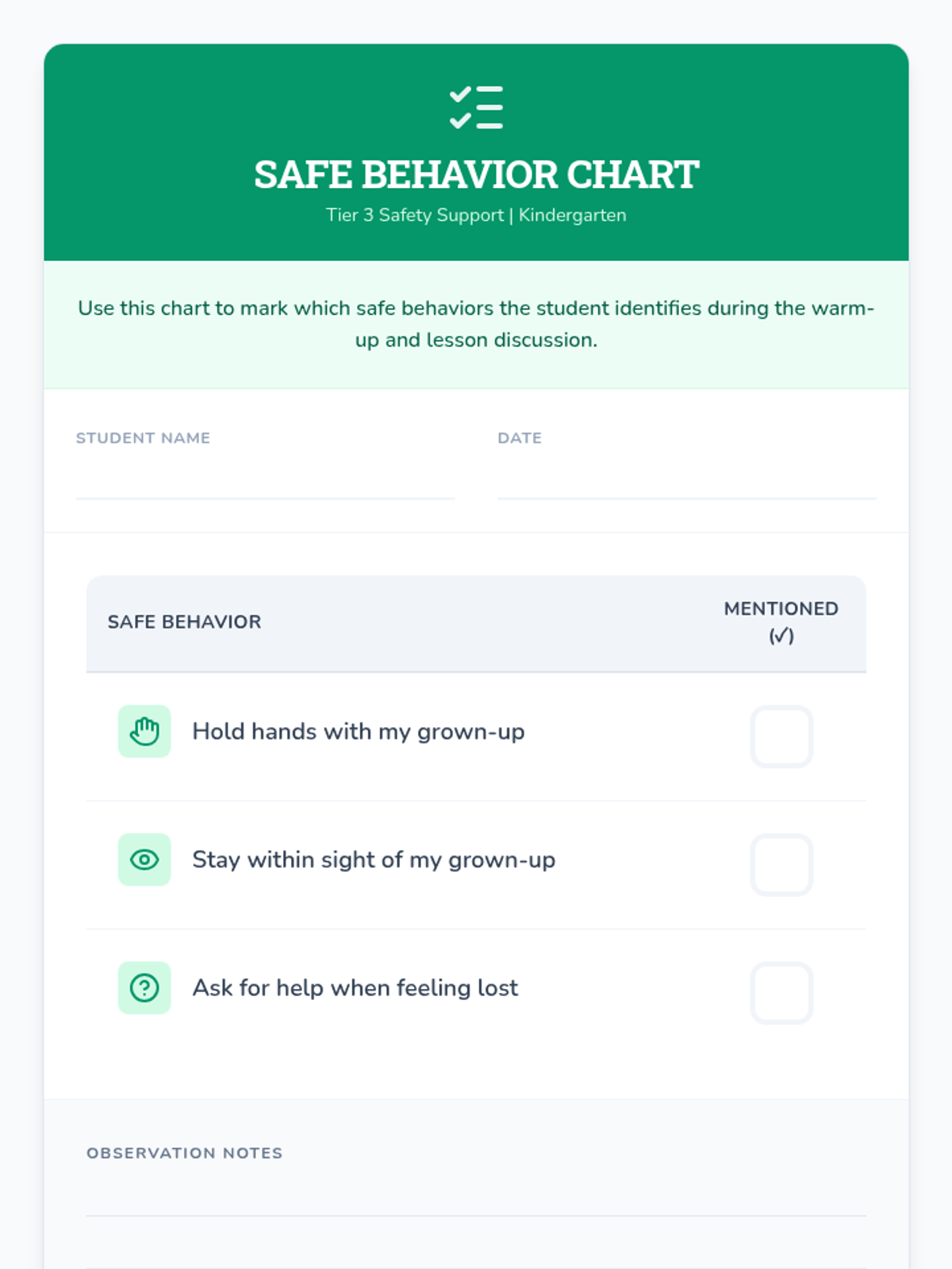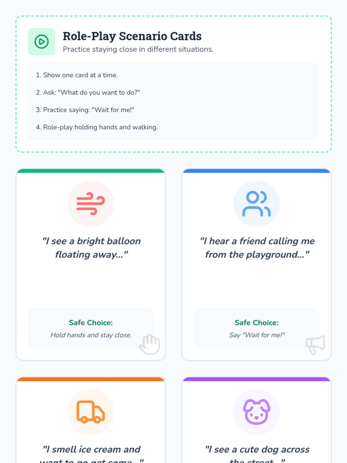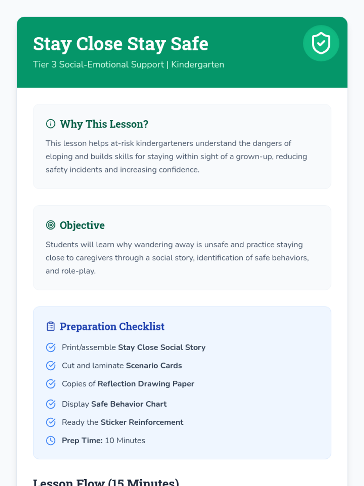 An individualized 15-minute Tier 3 session for kindergarteners to learn about the dangers of eloping and the importance of staying close to caregivers.