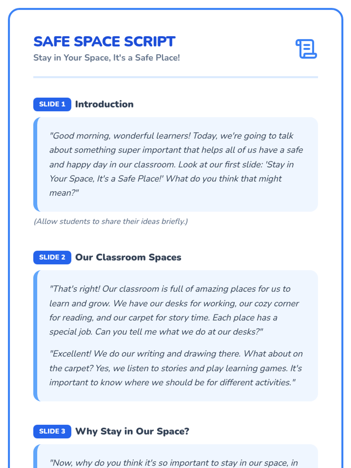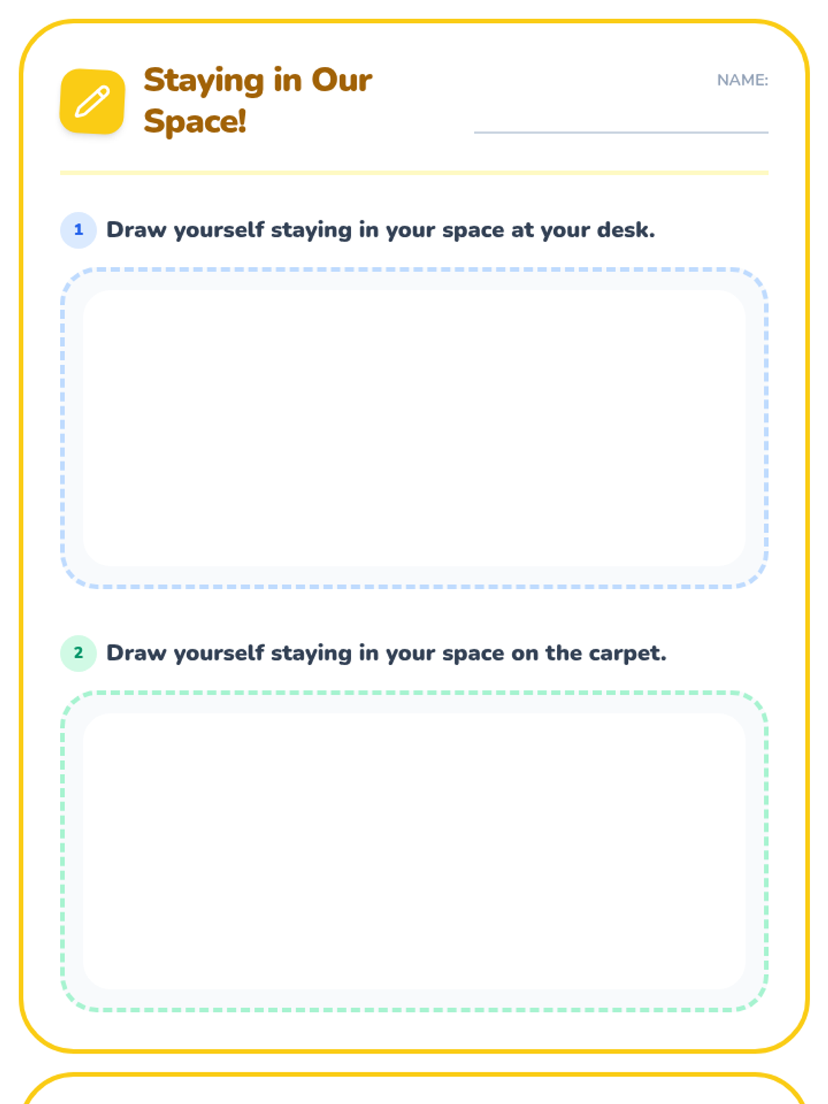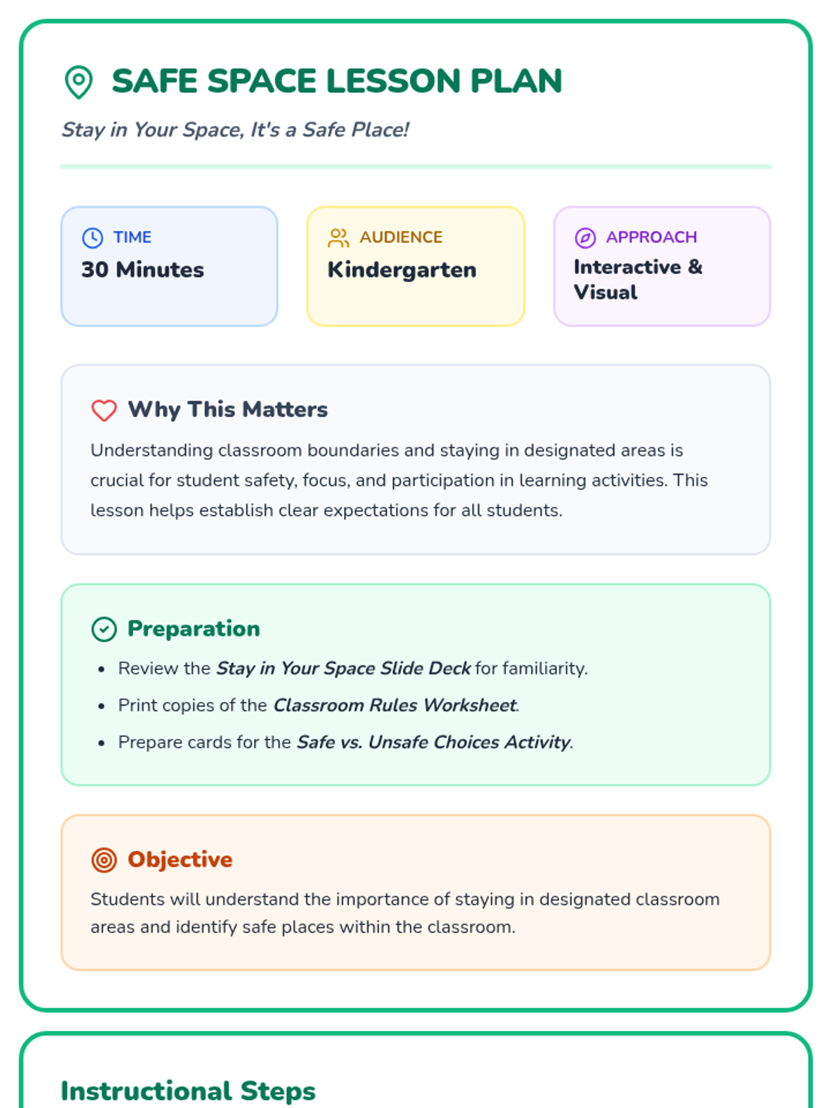 This lesson teaches Kindergarten students the importance of staying in designated classroom areas for safety and learning through interactive slides, a sorting activity, and a drawing worksheet.