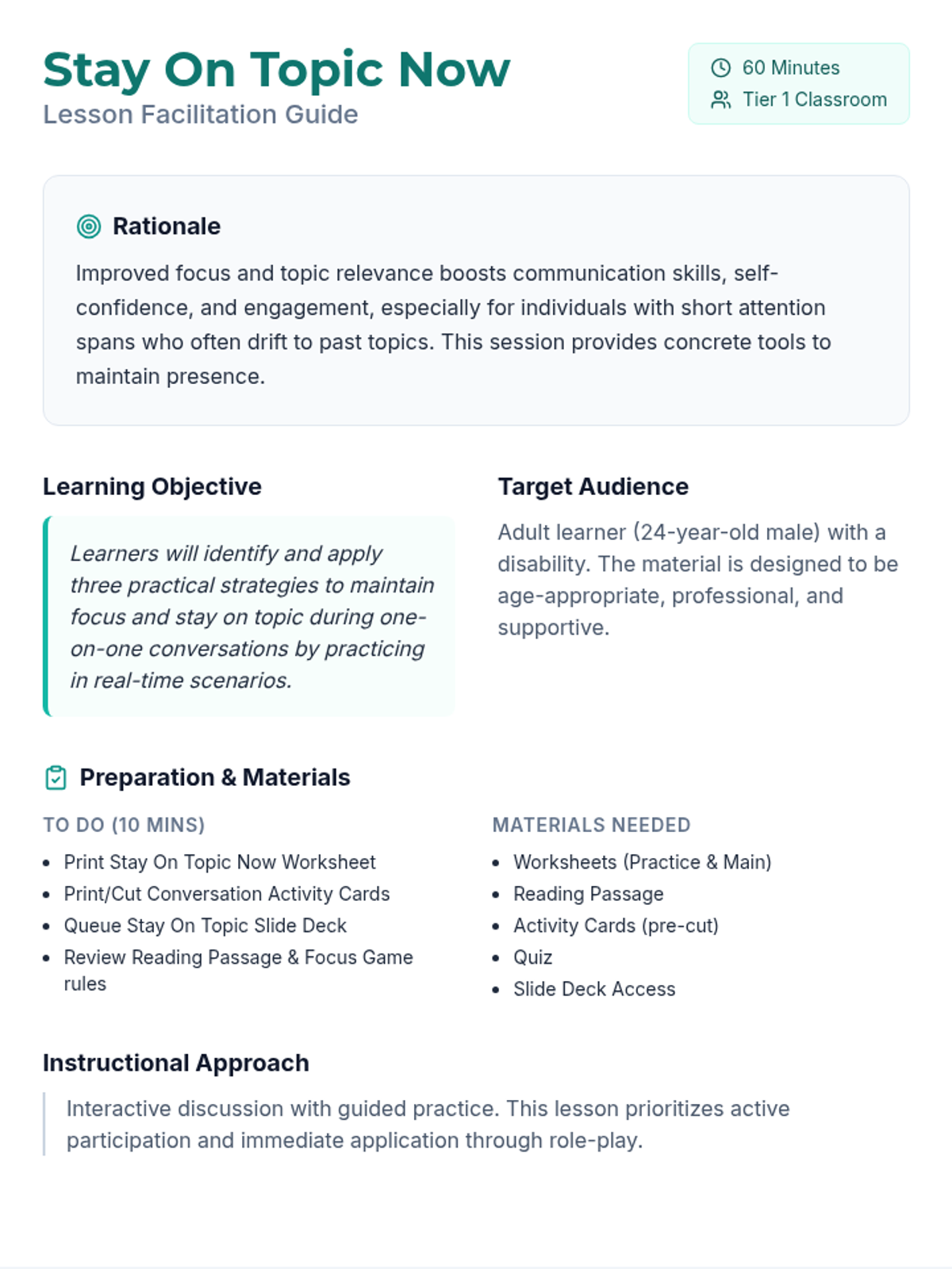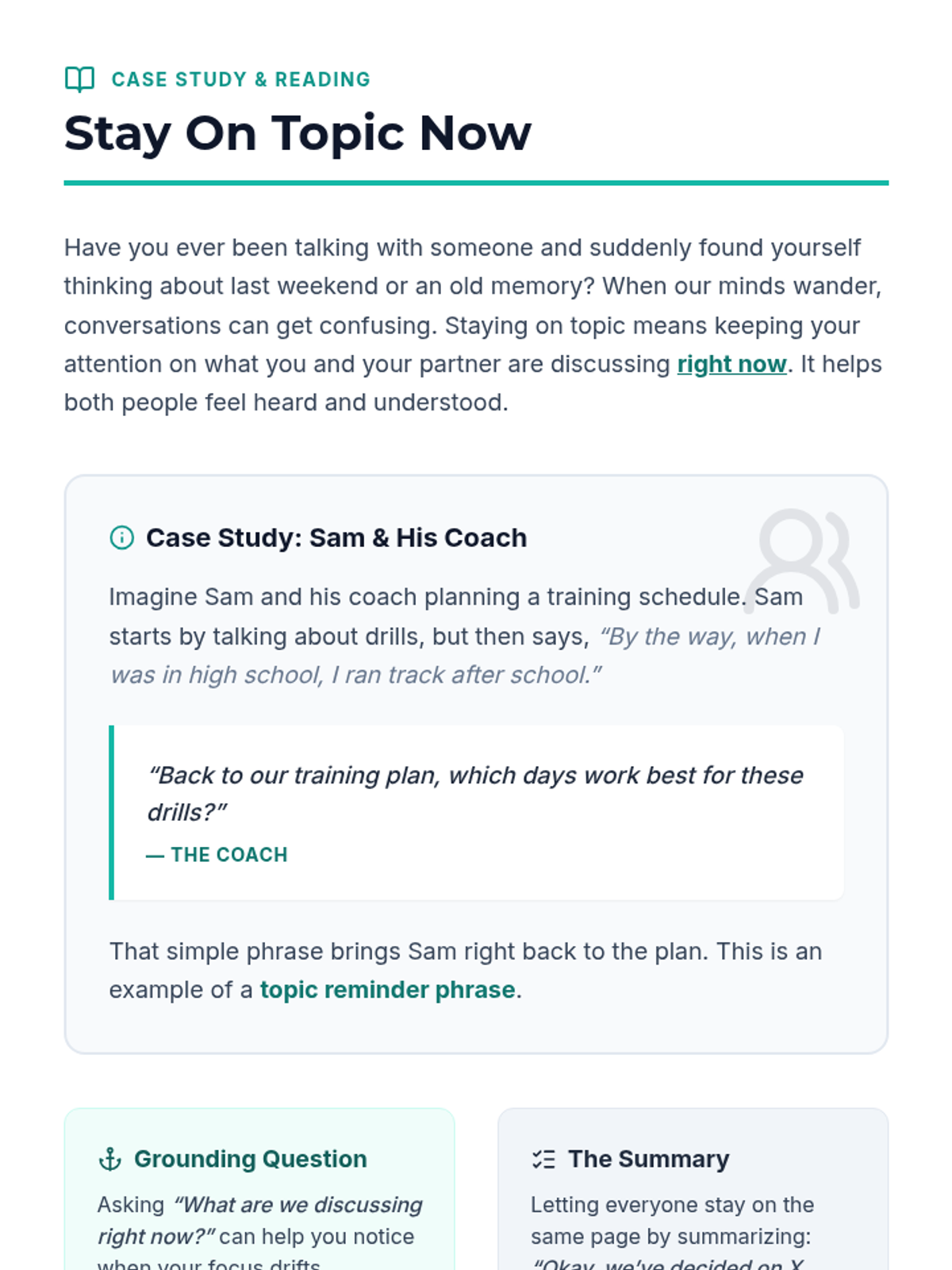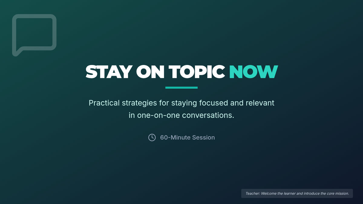 A 60-minute session for adult learners to master staying focused and relevant during one-on-one conversations using three practical strategies.