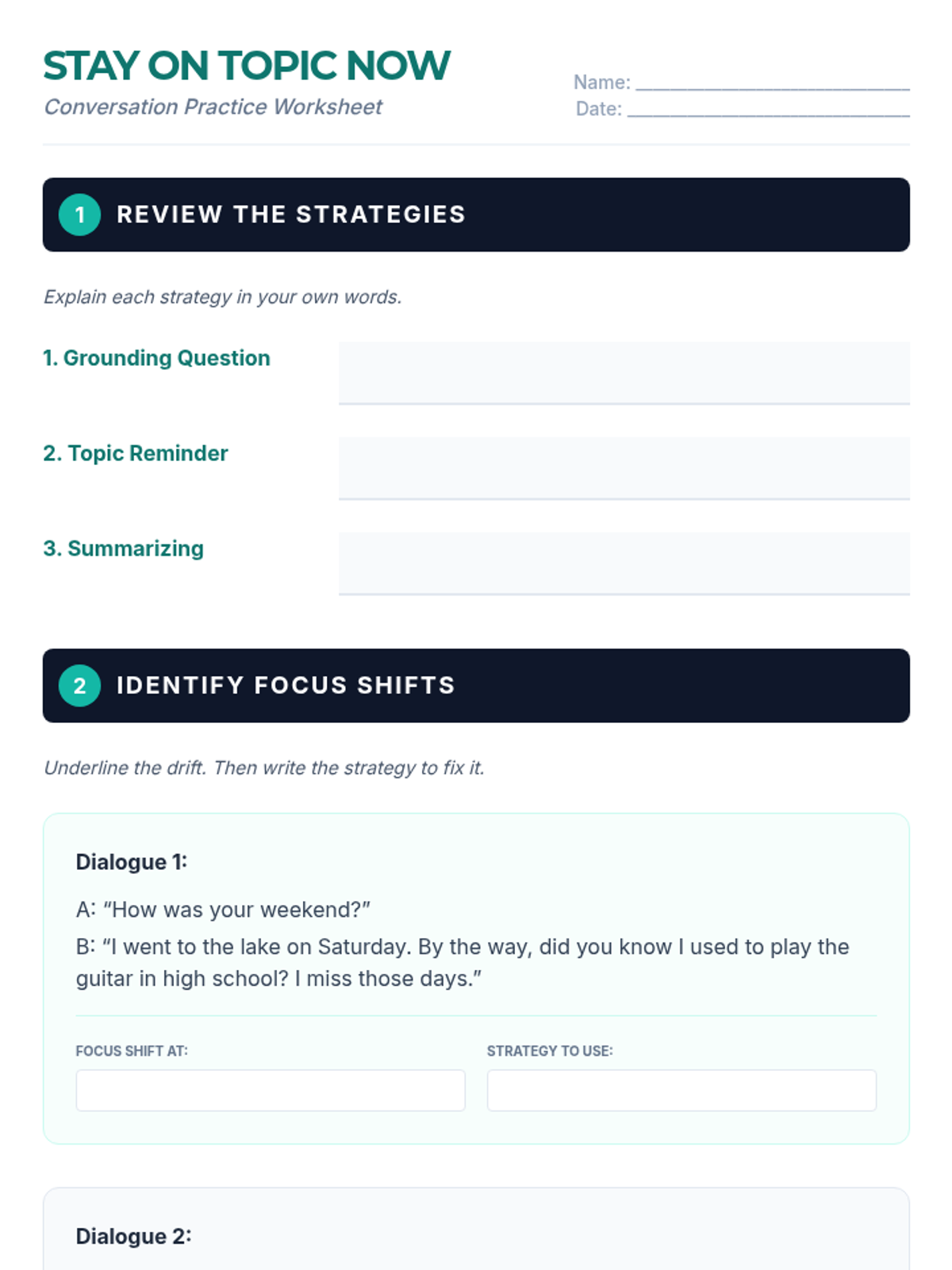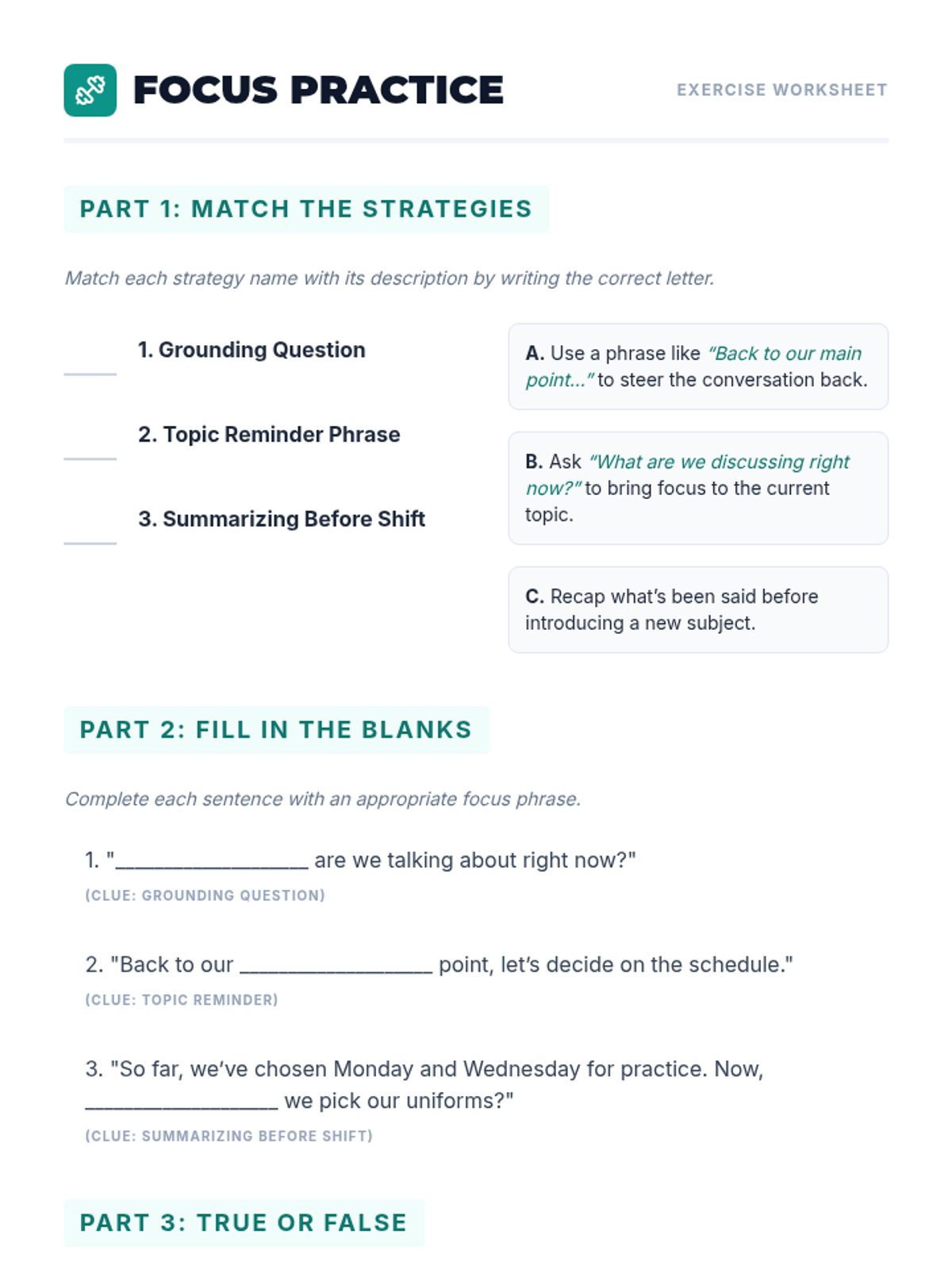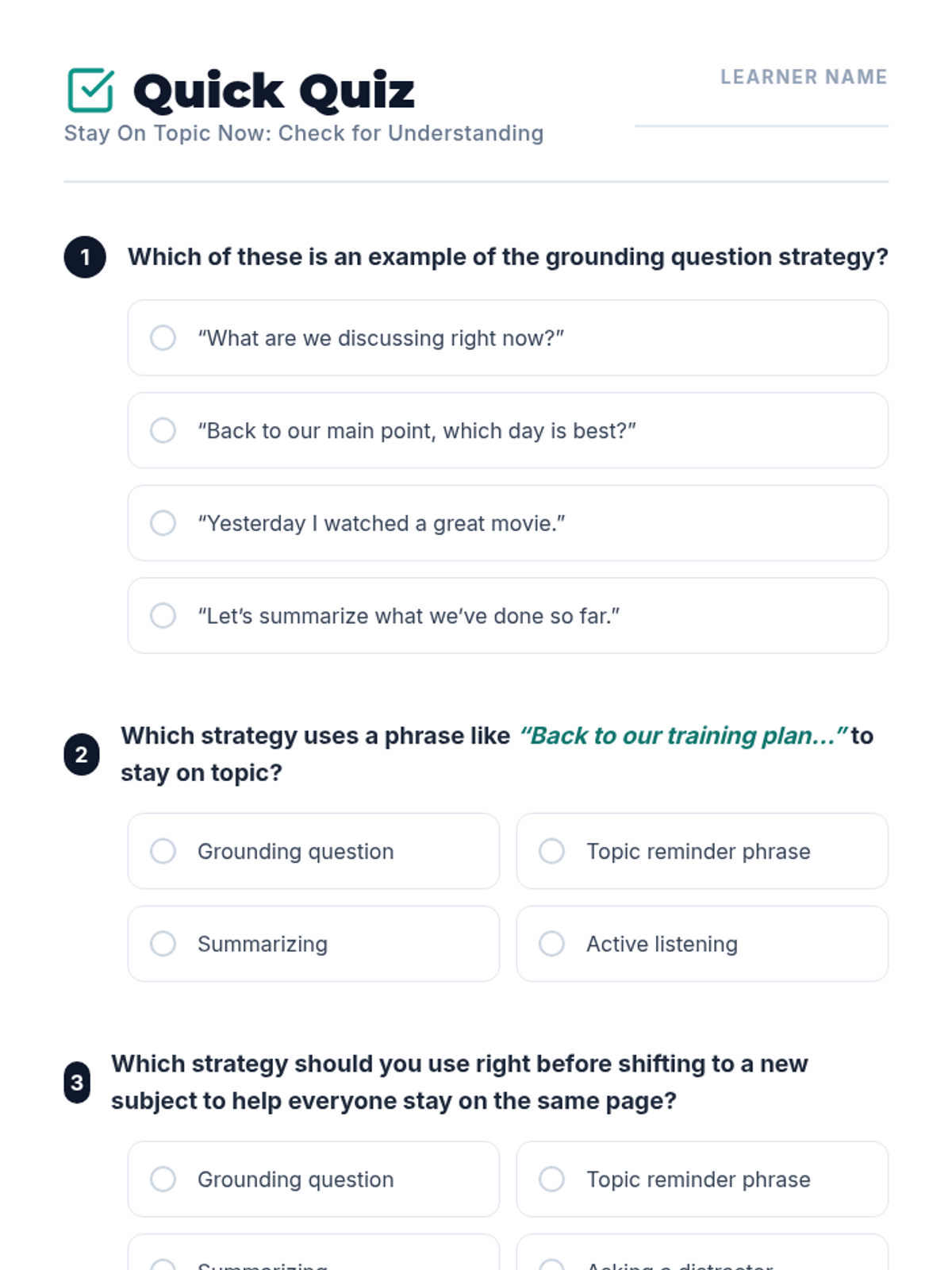 A 60-minute session for adult learners to master staying focused and relevant during one-on-one conversations using three practical strategies.