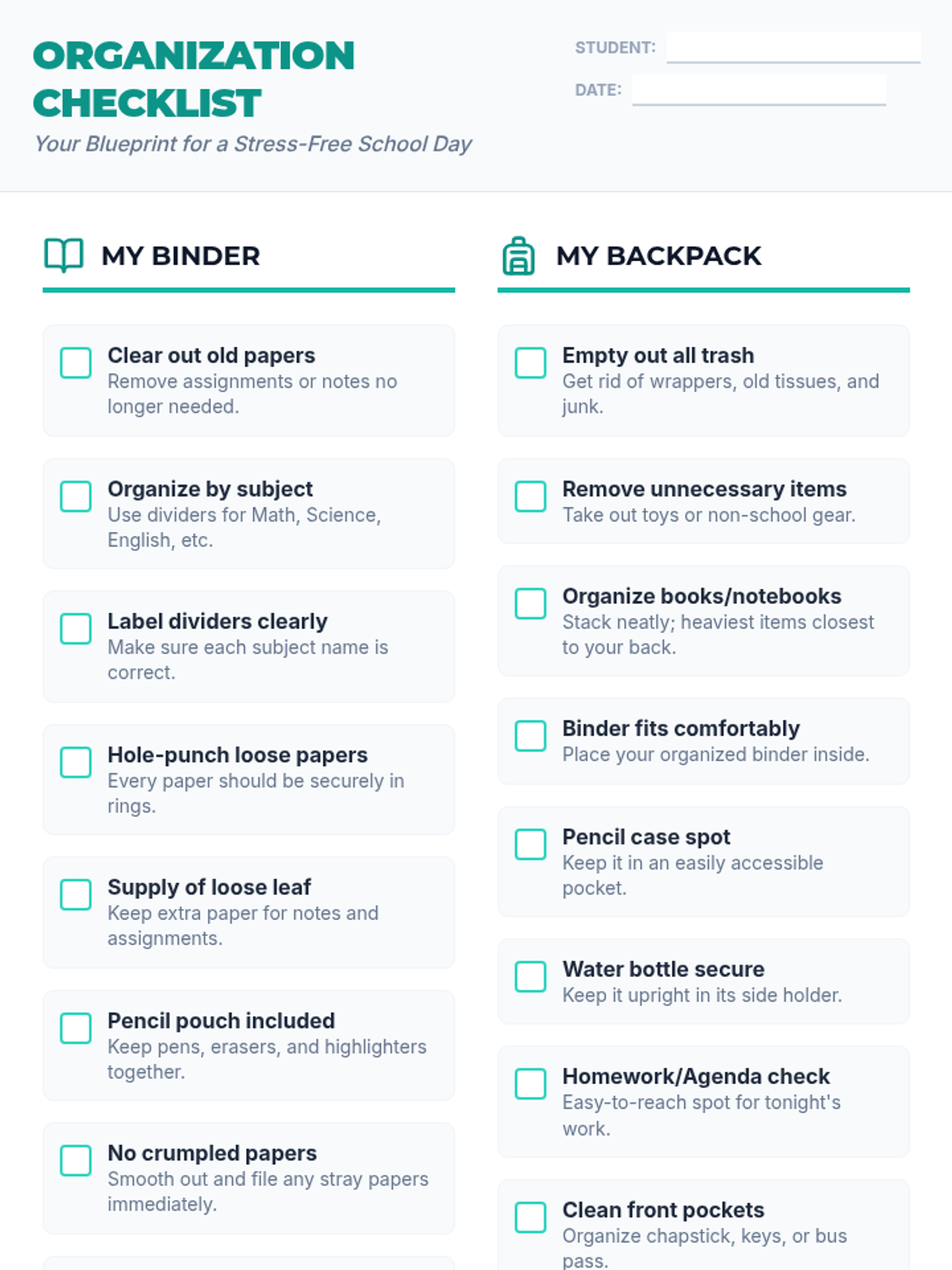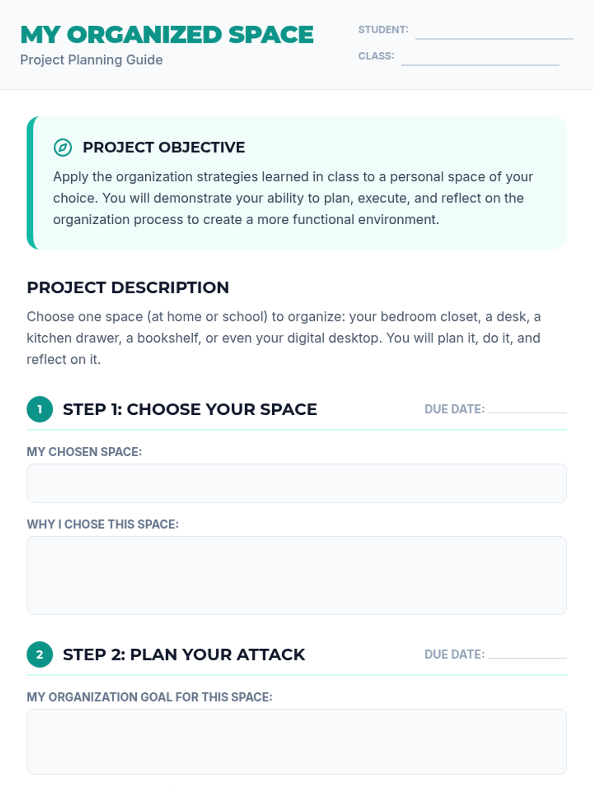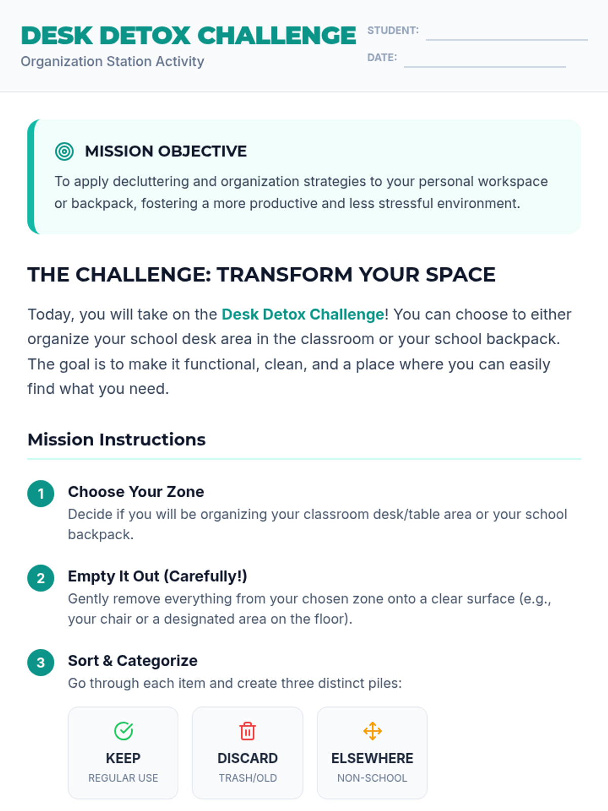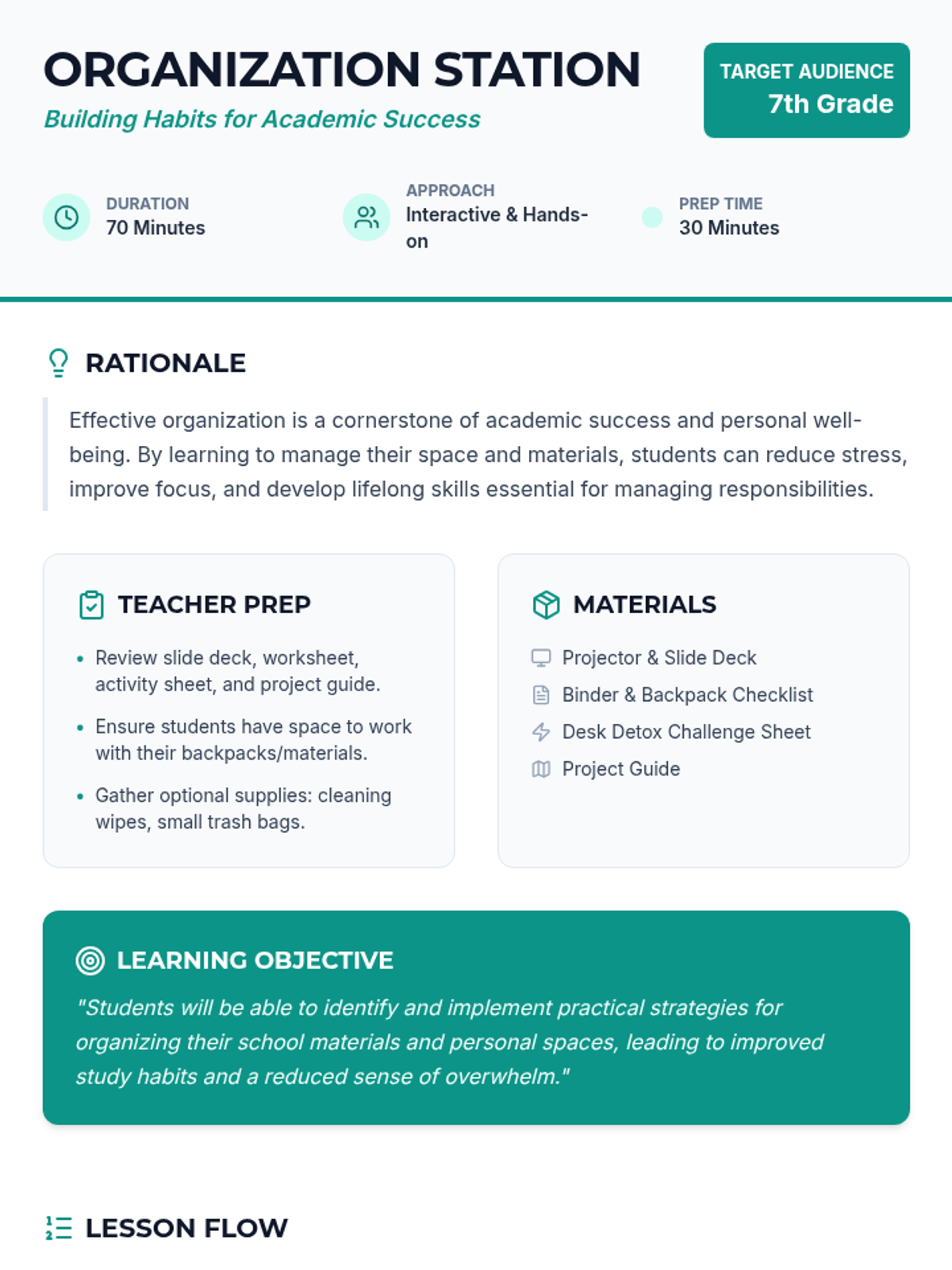 A 70-minute lesson for 7th graders focused on practical organization strategies for schoolwork and personal spaces to reduce stress and improve focus.