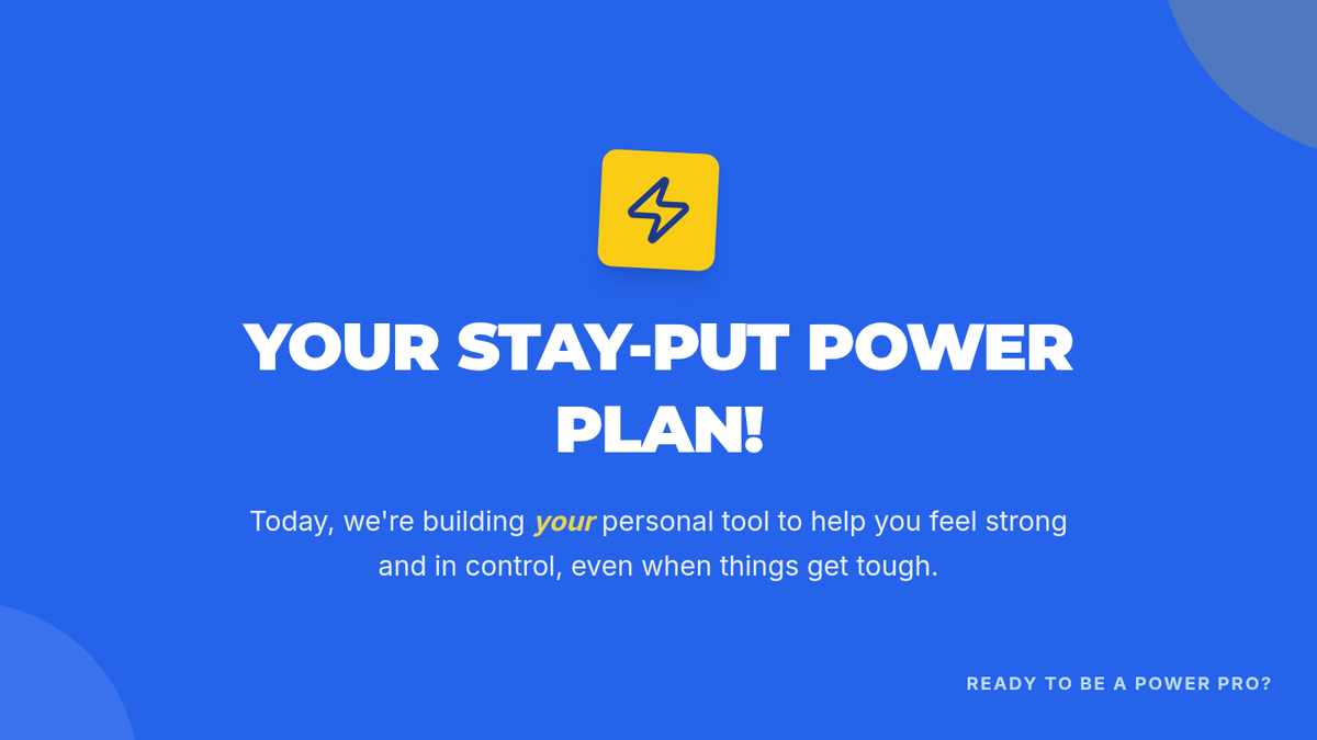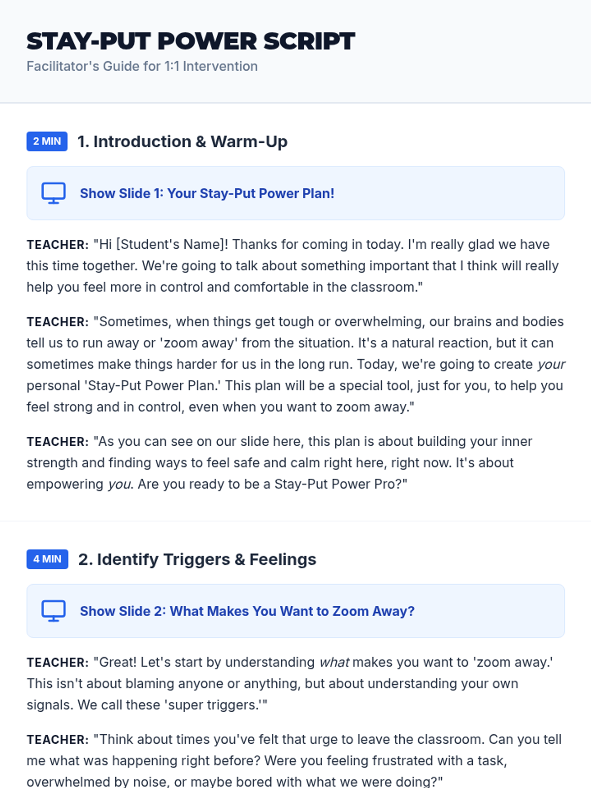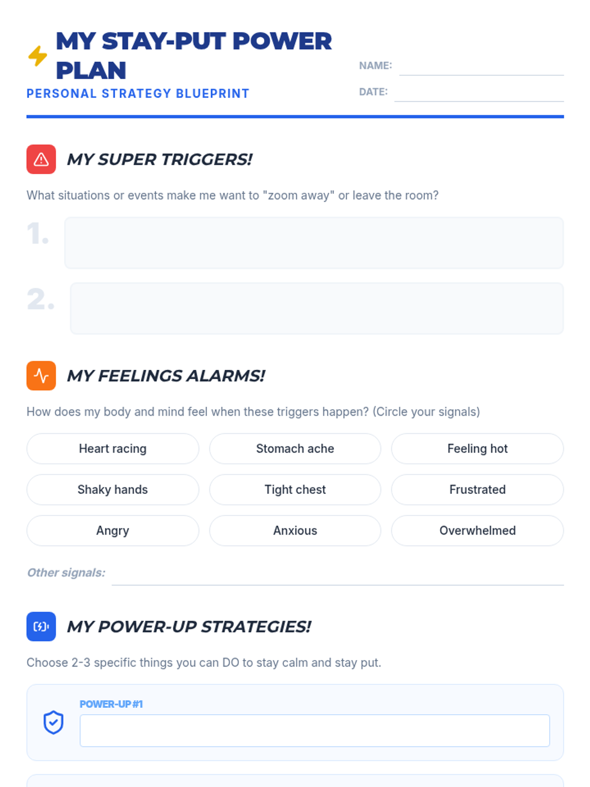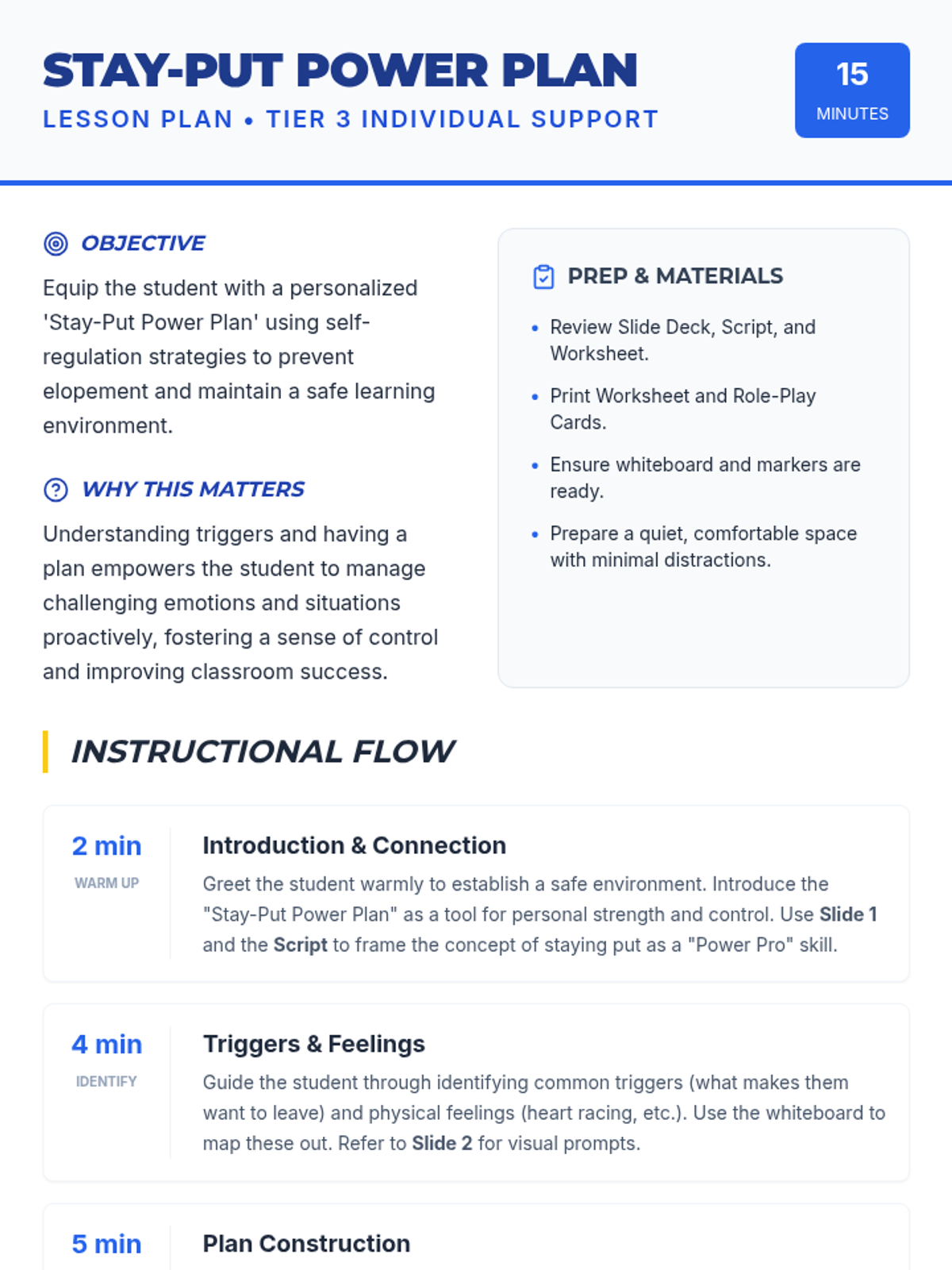 An individual, 15-minute Tier 3 lesson for 6th-grade students to develop personalized self-regulation strategies and a 'Stay-Put Power Plan' to address and prevent elopement behaviors.
