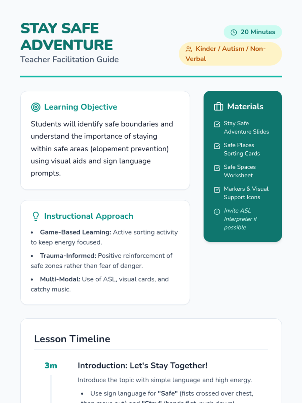A safety-focused lesson for Kindergarten students, specifically designed for those on the autism spectrum or who are non-verbal, teaching boundaries and elopement prevention through game-based learning.