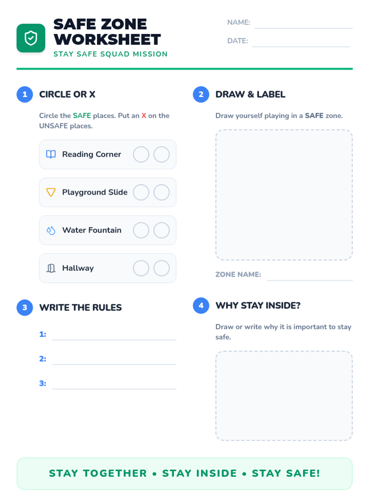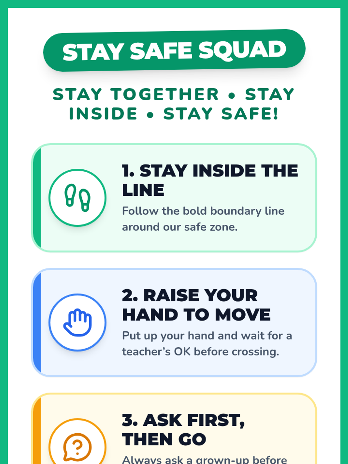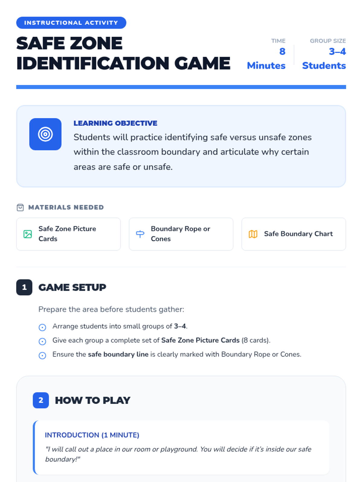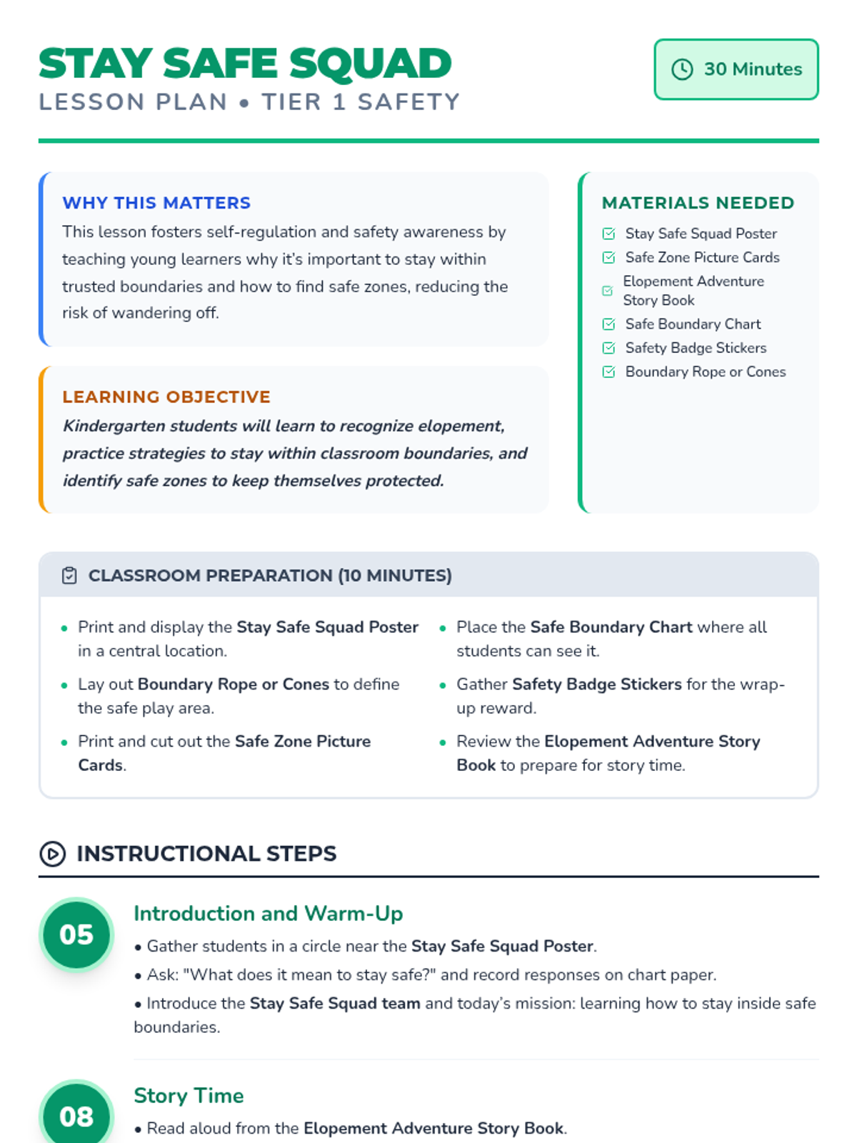 In this 30-minute Tier 1 lesson, kindergarteners will learn about elopement and strategies to stay safe, understand why it's important to stay within boundaries, and practice identifying safe zones. This helps them develop self-regulation and safety awareness.