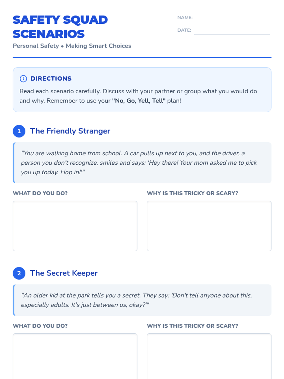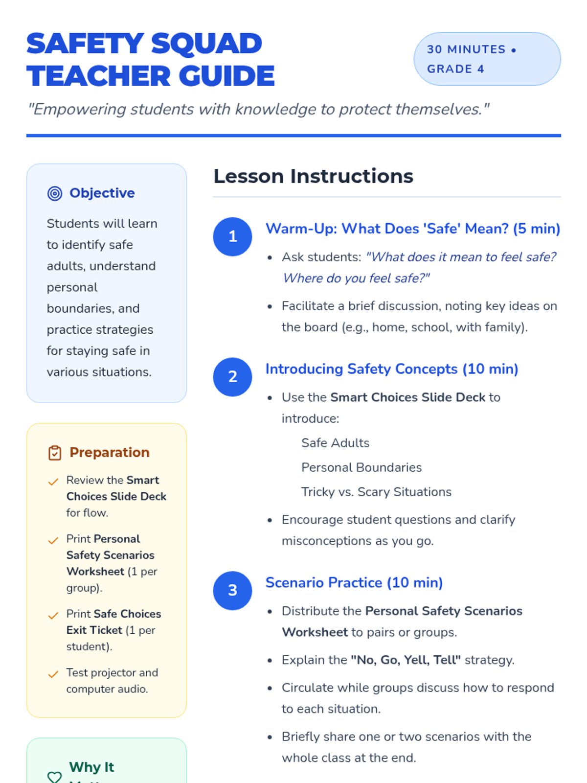 This 30-minute lesson empowers 4th-grade students with essential personal safety skills, including identifying safe adults, understanding boundaries, and practicing the 'No, Go, Yell, Tell' strategy.