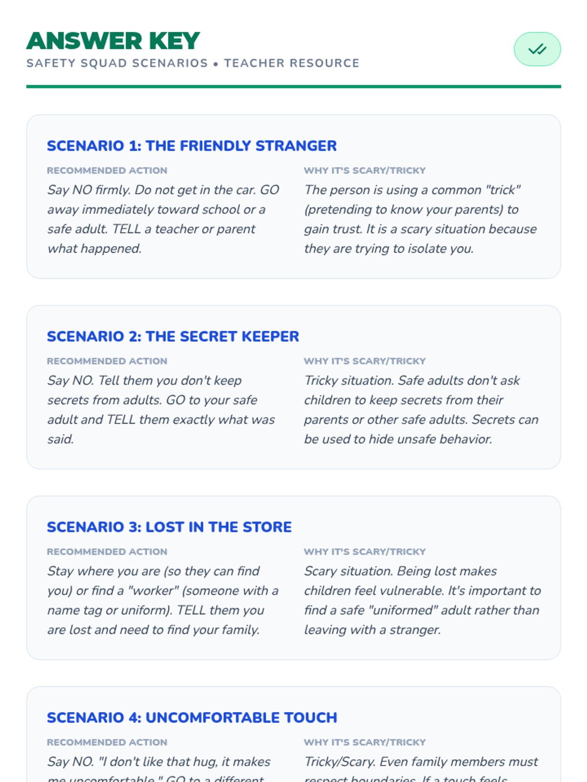 A lesson designed to teach children how to recognize common tricks used by strangers and how to respond safely.