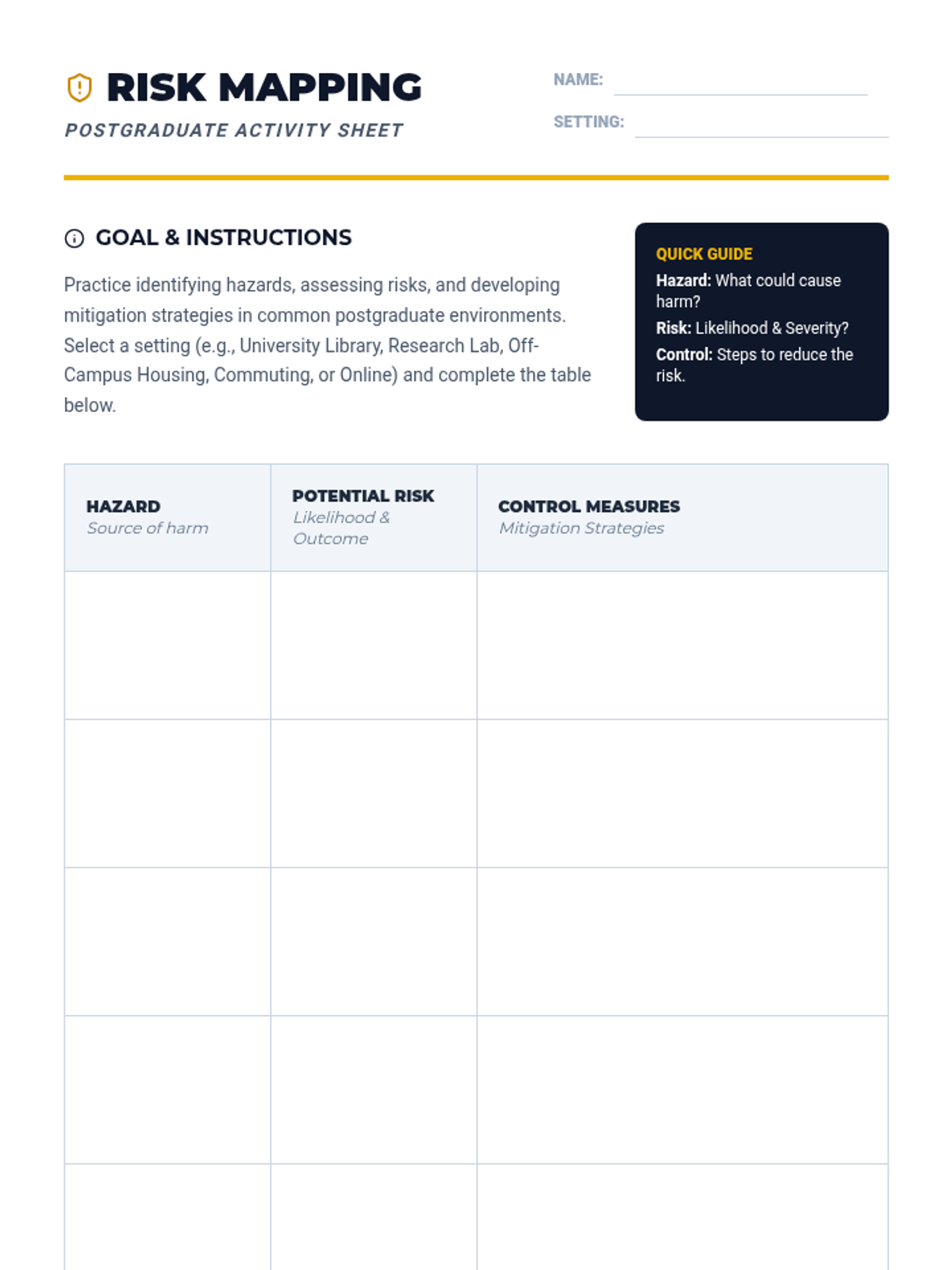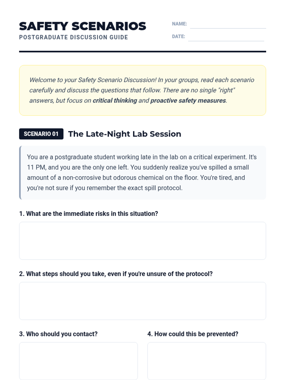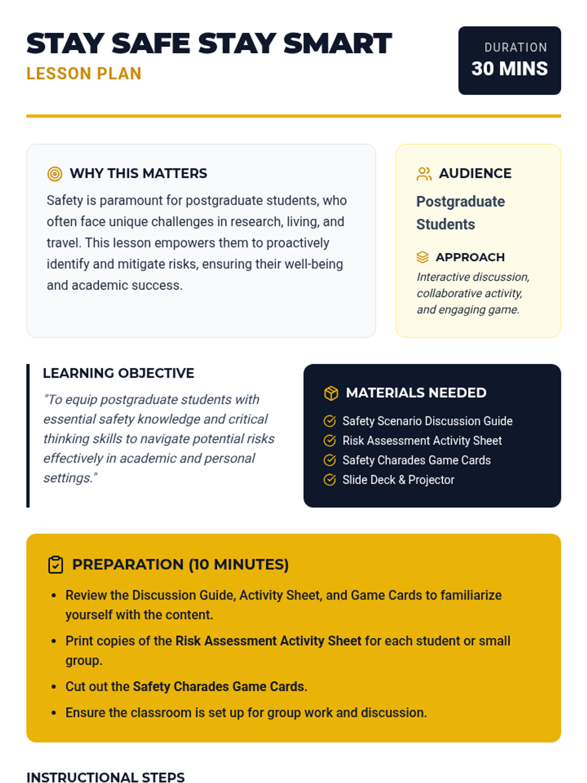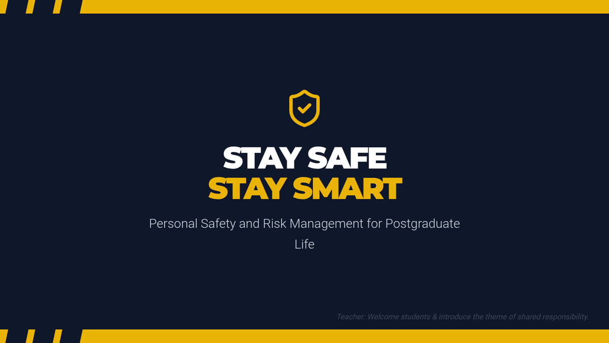 A 30-minute interactive lesson for postgraduate students focusing on proactive safety measures and risk assessment in academic and personal life.