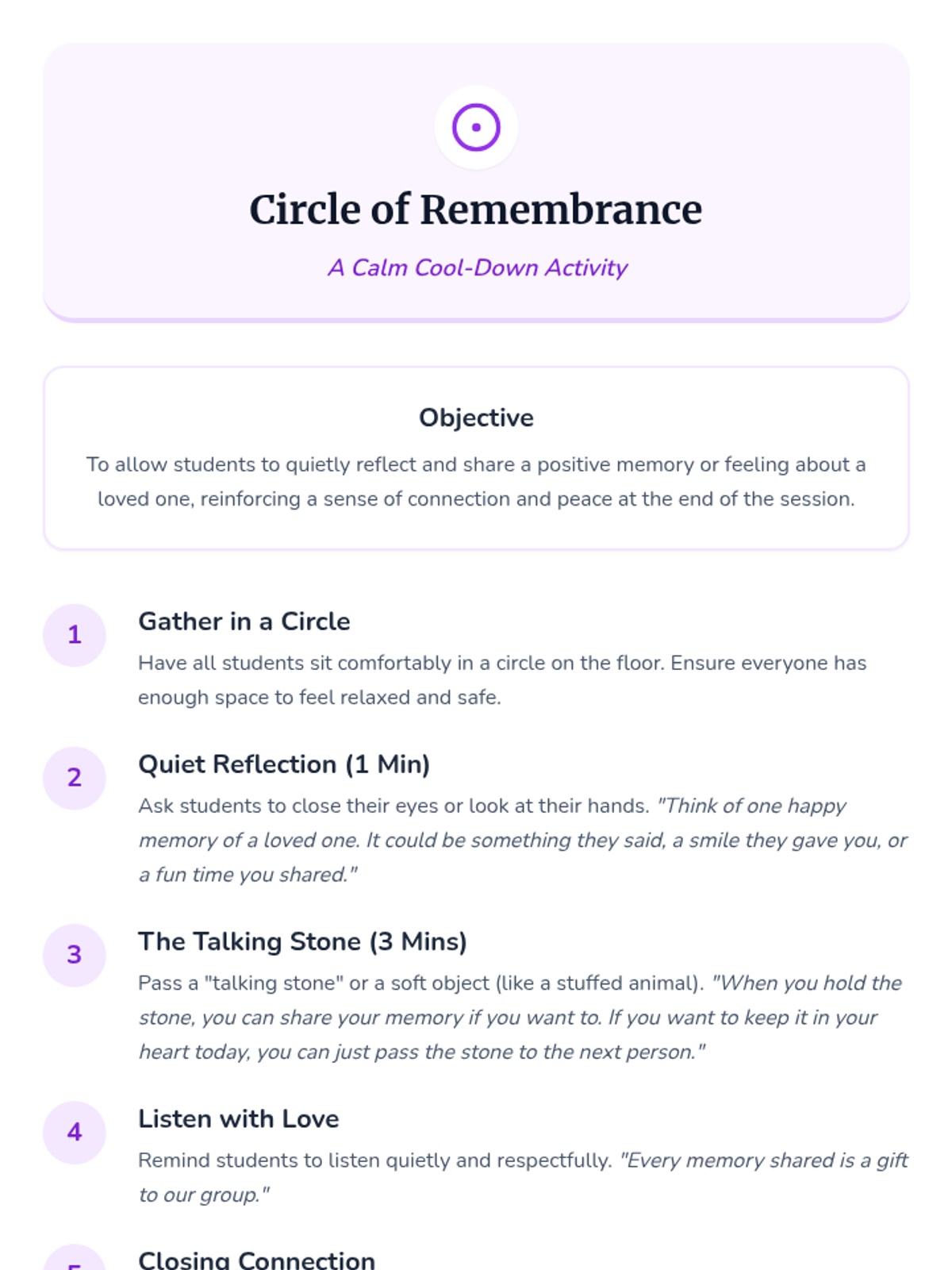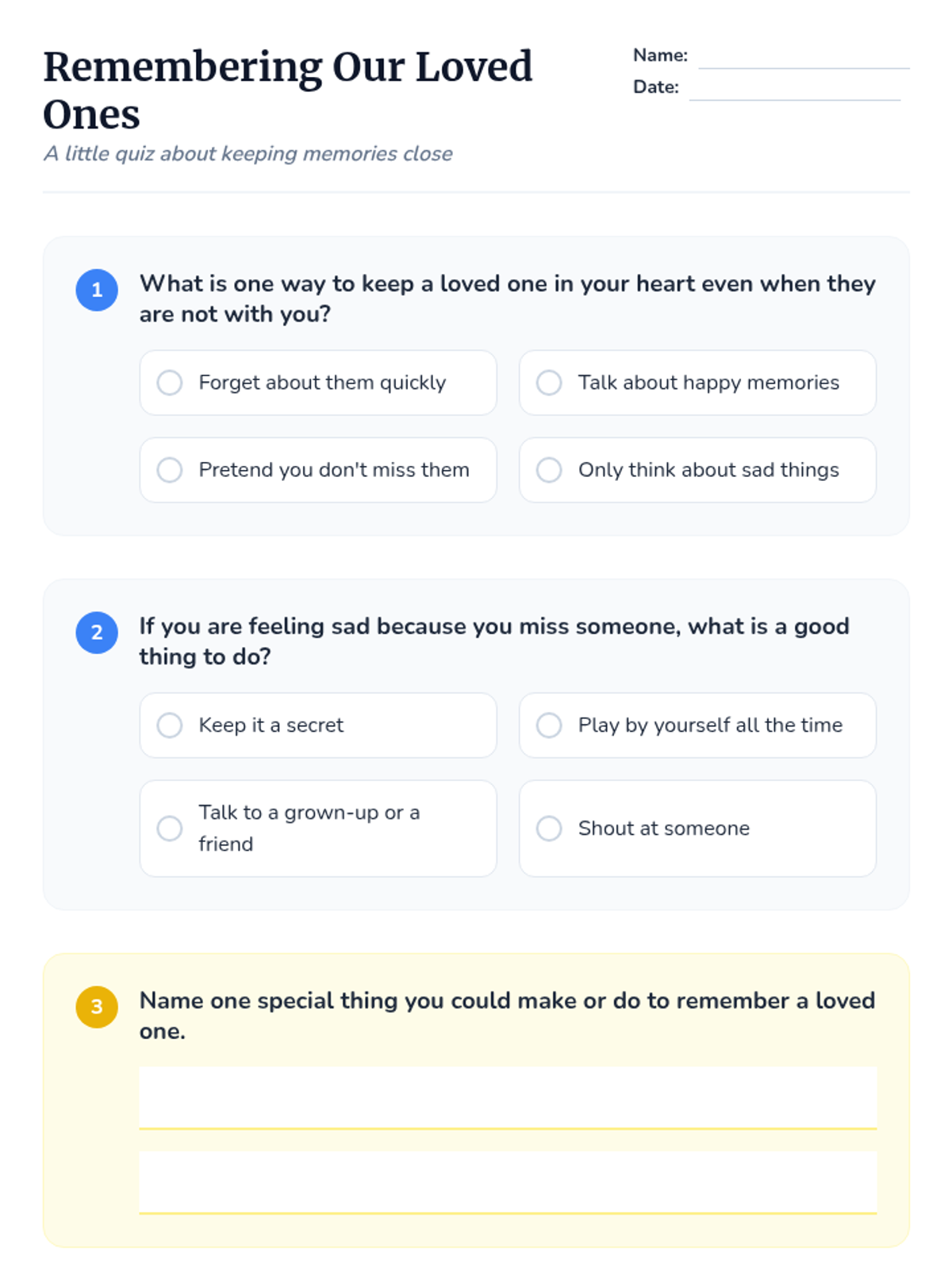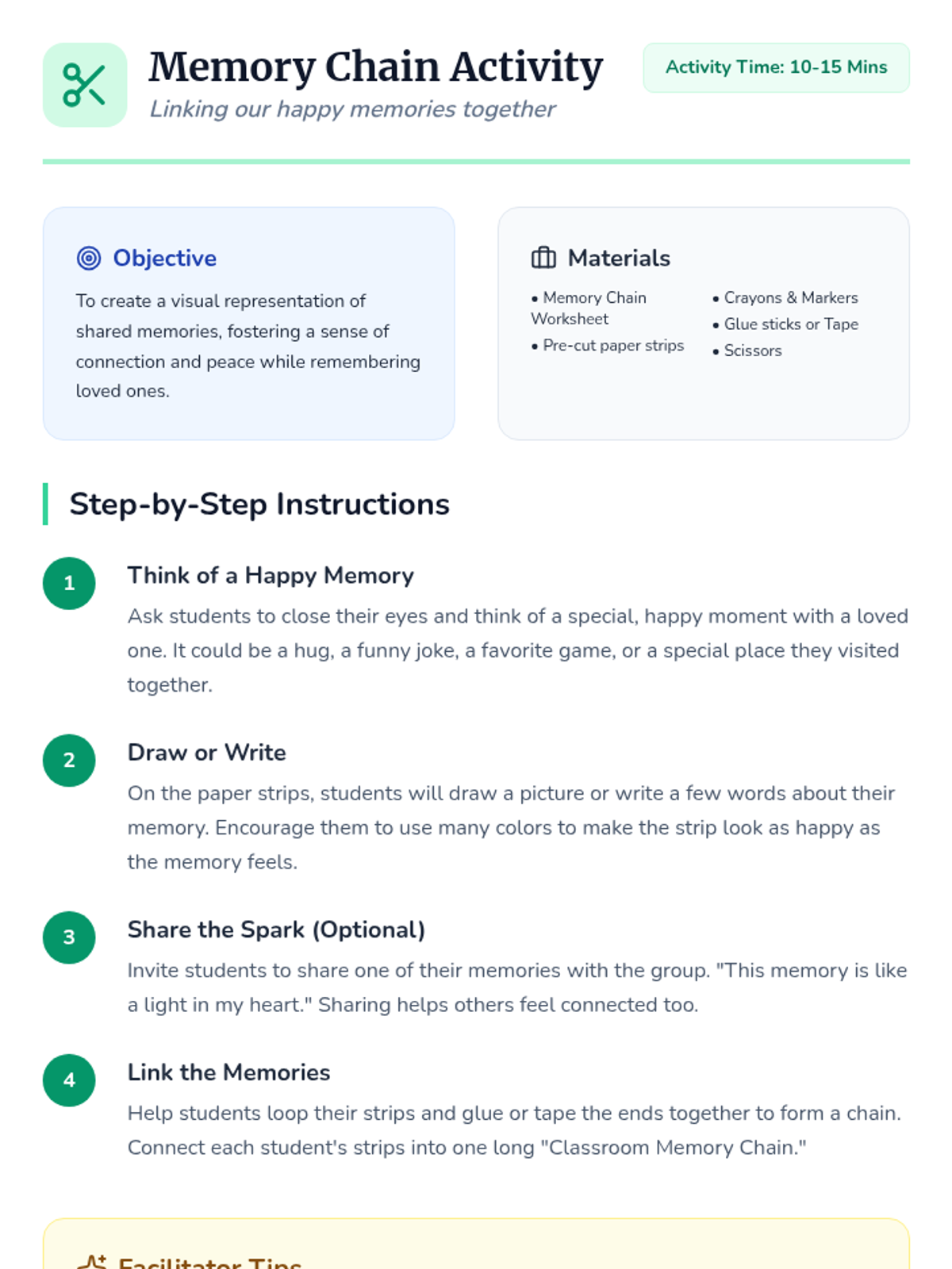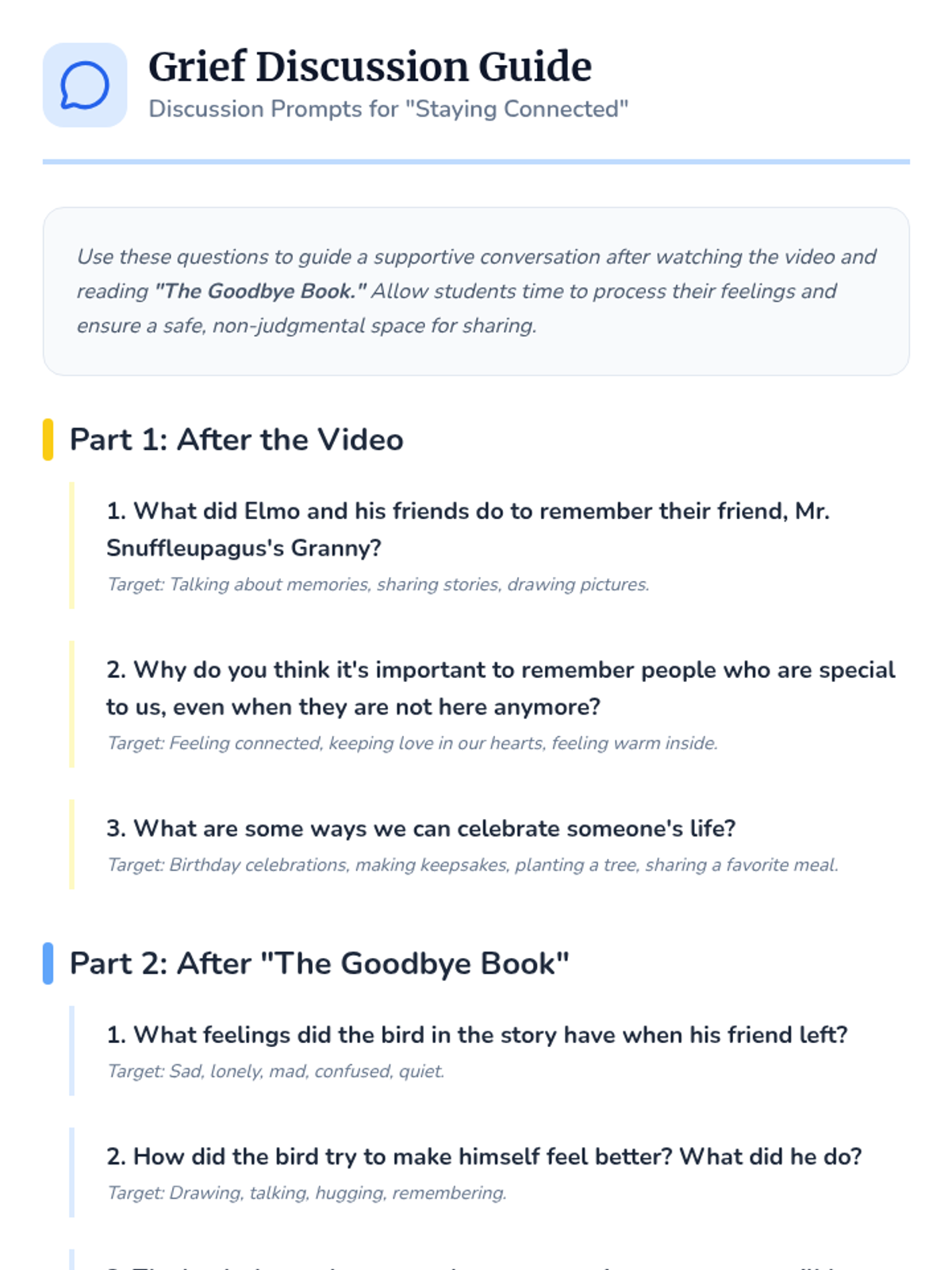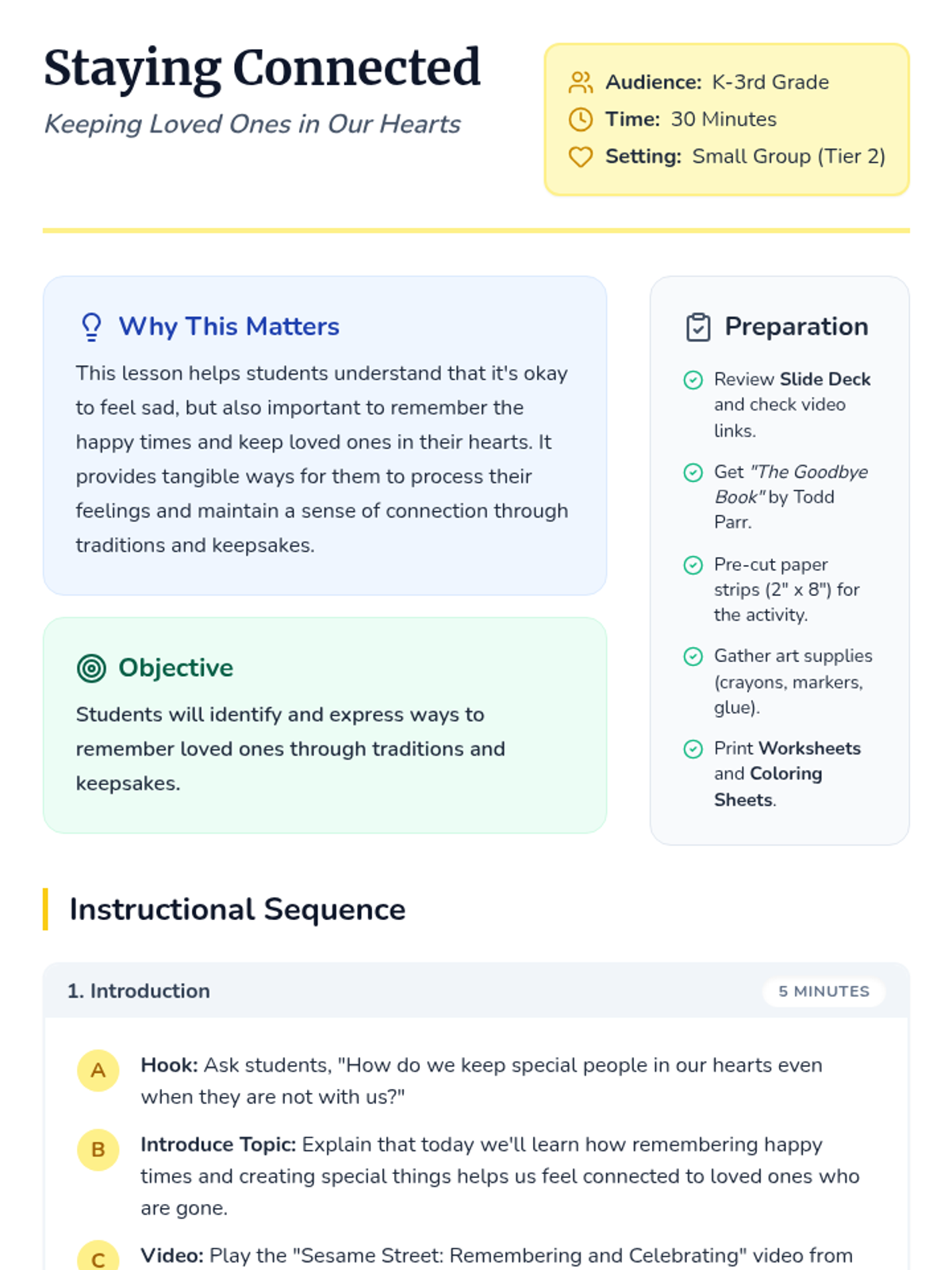 A 30-minute Tier 2 small group lesson for K-3 students focusing on healthy ways to remember loved ones through traditions, keepsakes, and positive memories.