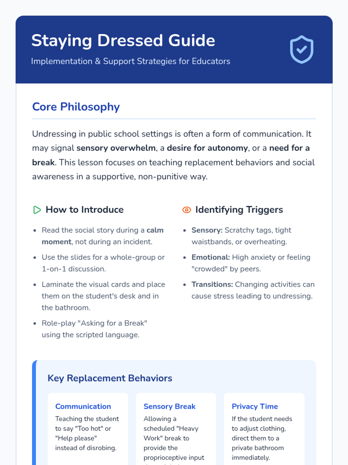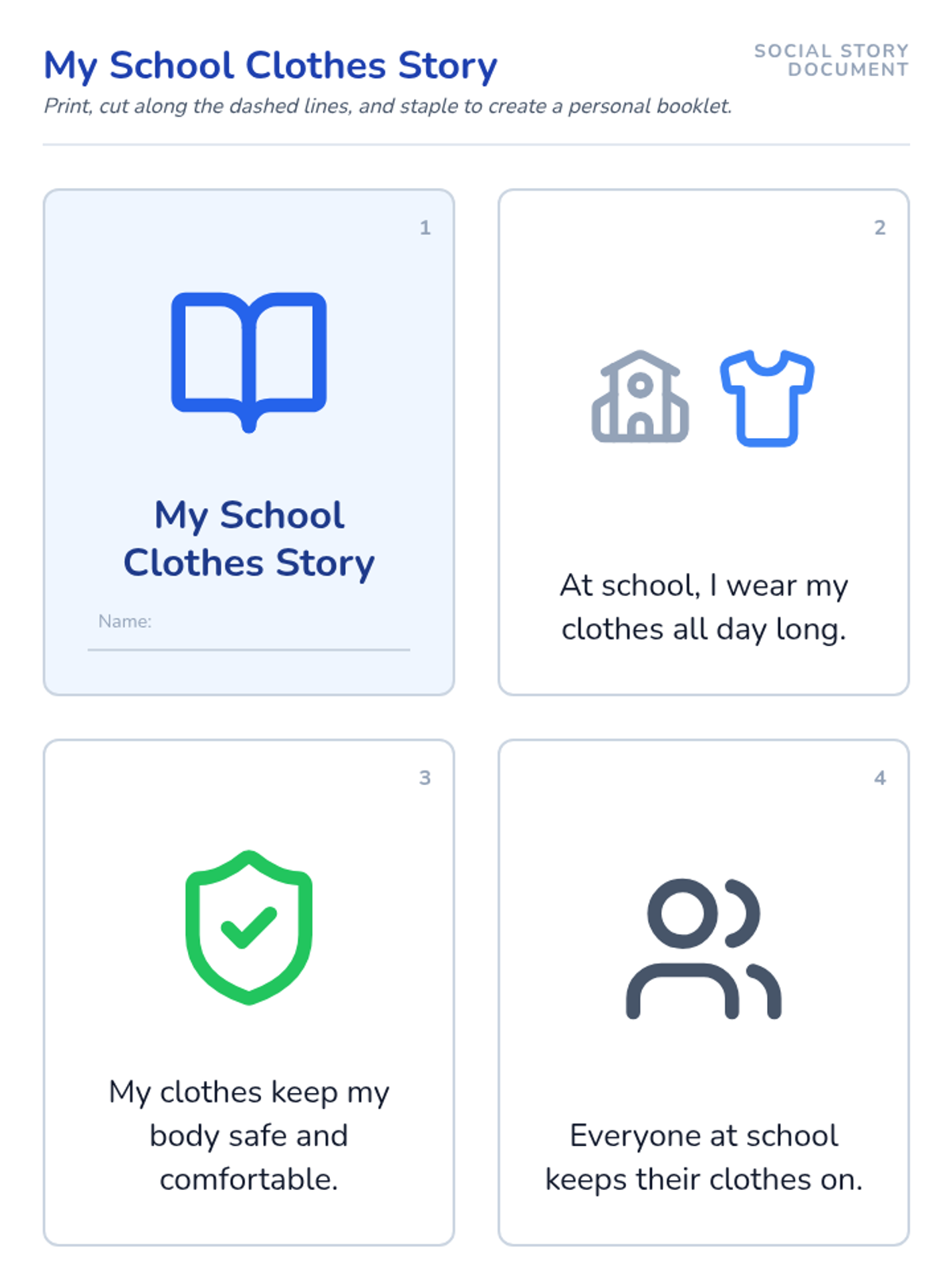 A supportive instructional lesson teaching students the social expectations and personal reasons for keeping clothes on at school. Includes a social story, visual reminders, and teacher implementation strategies.