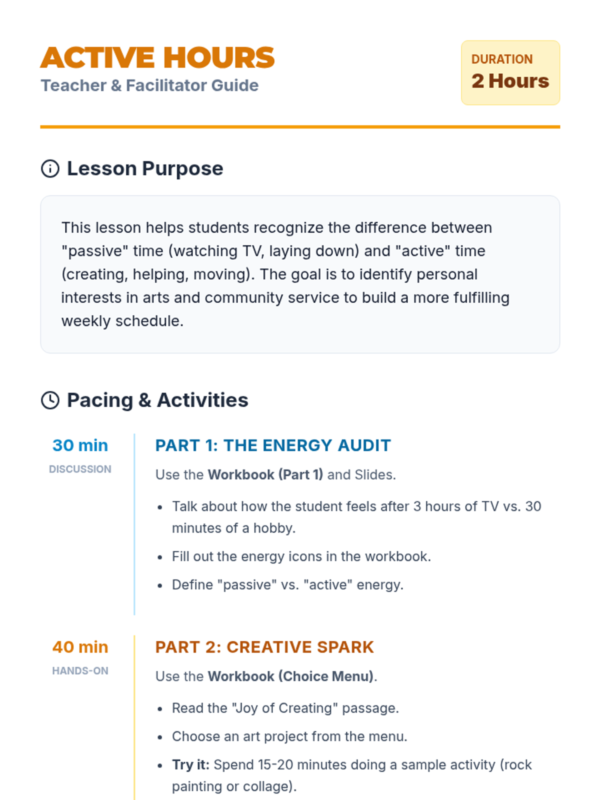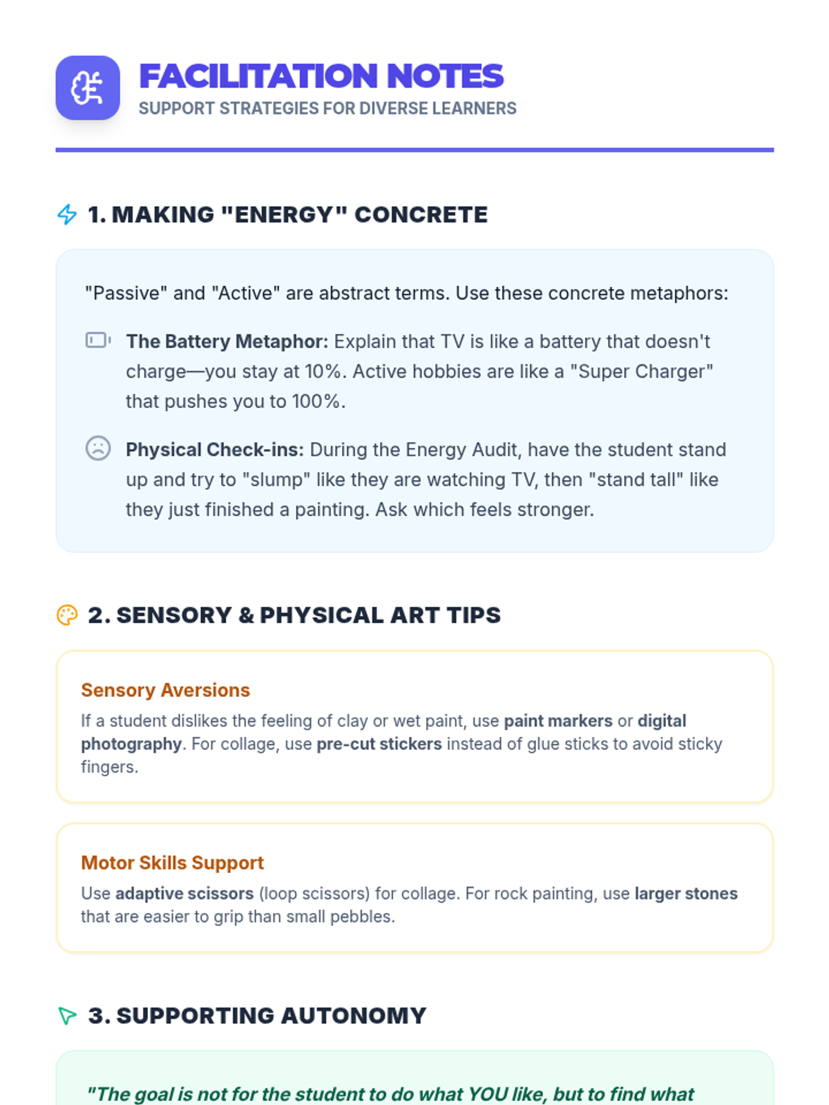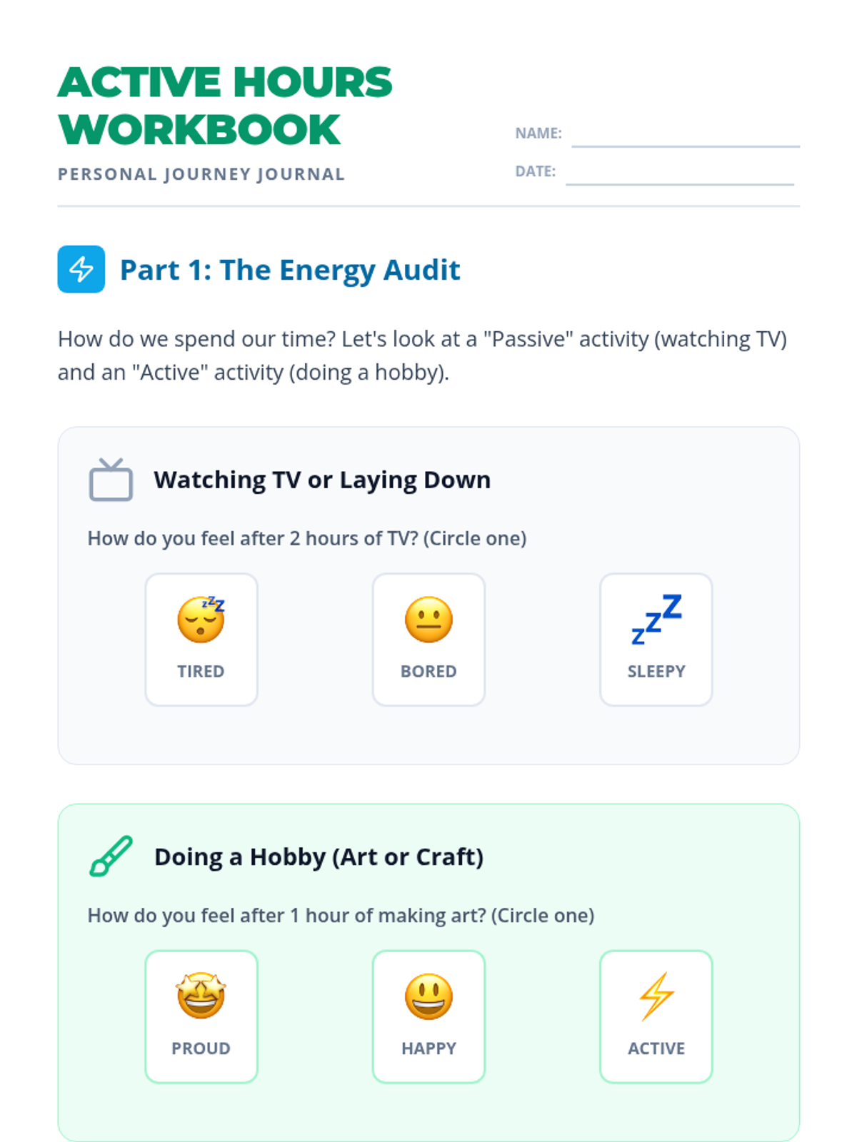 A comprehensive one-on-one lesson designed for adults with disabilities to transition from passive screen time to active, fulfilling hobbies and community involvement.