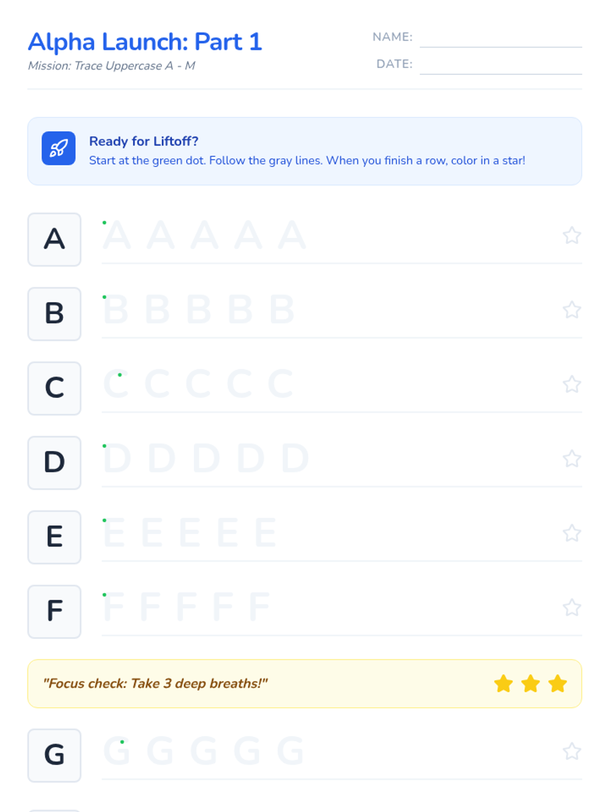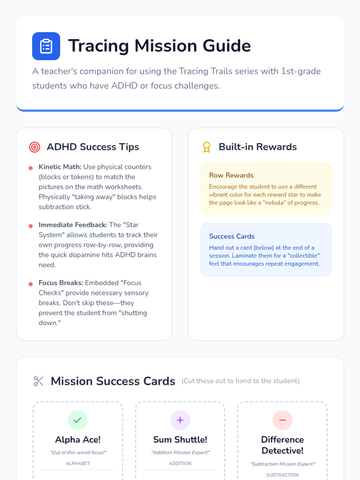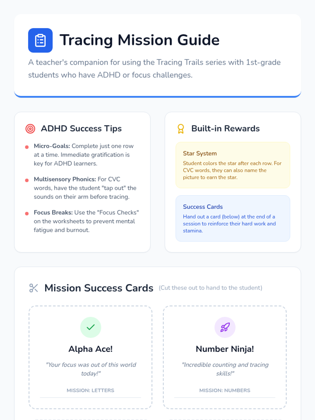 A series of focused tracing worksheets for 1st grade students with ADHD, featuring high-contrast paths, minimal distractions, and integrated reward stars.