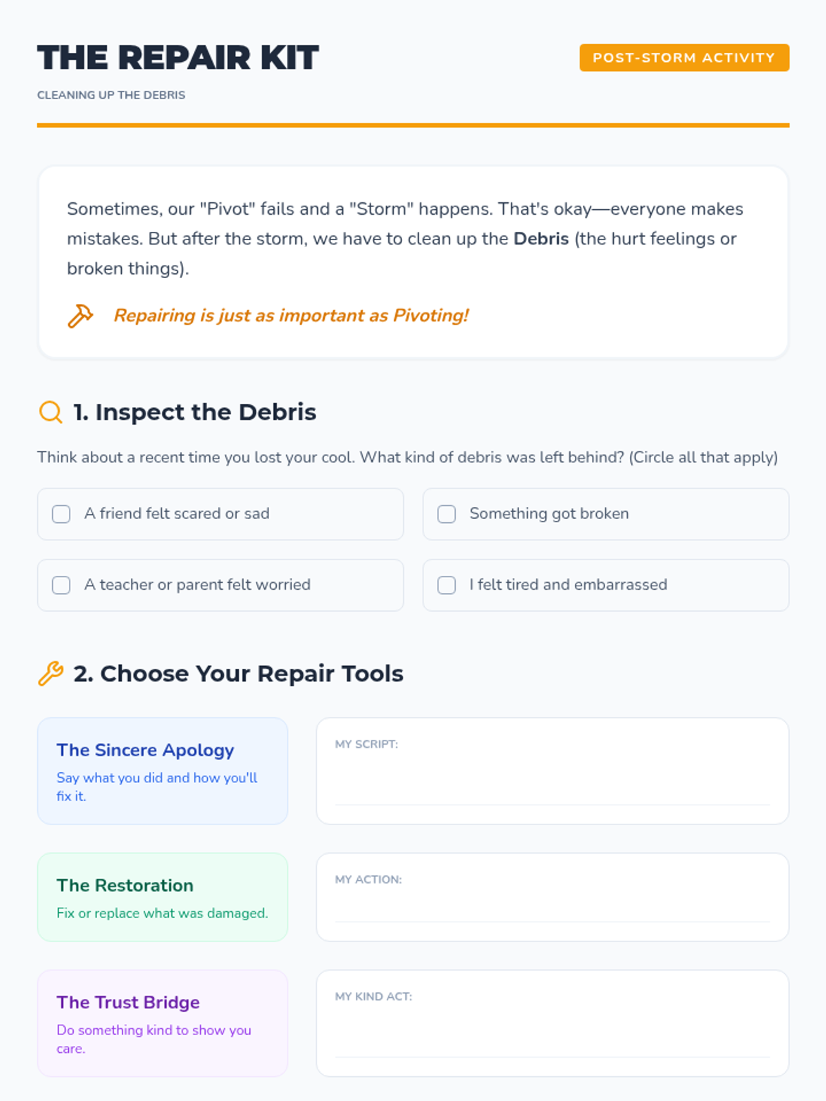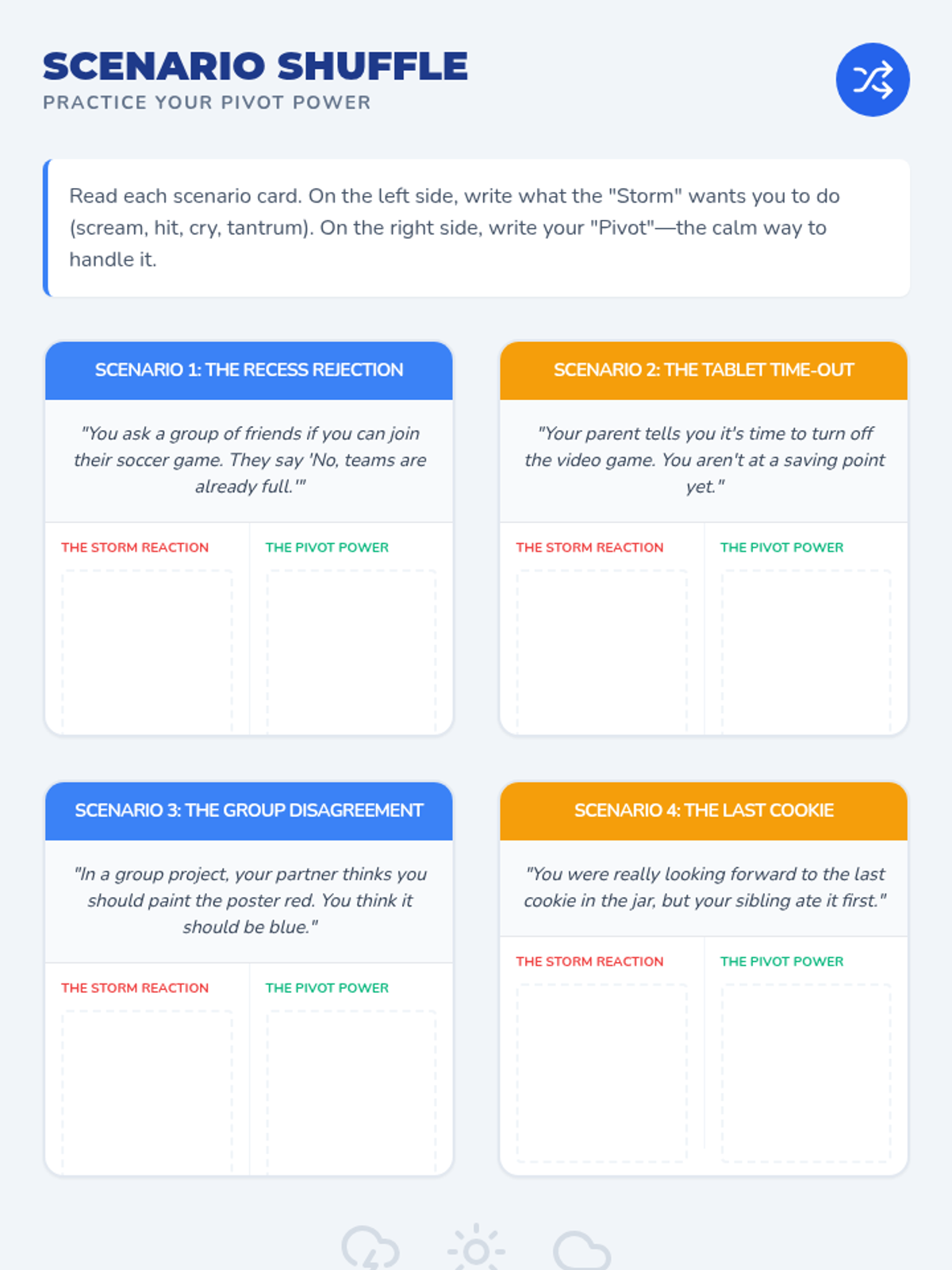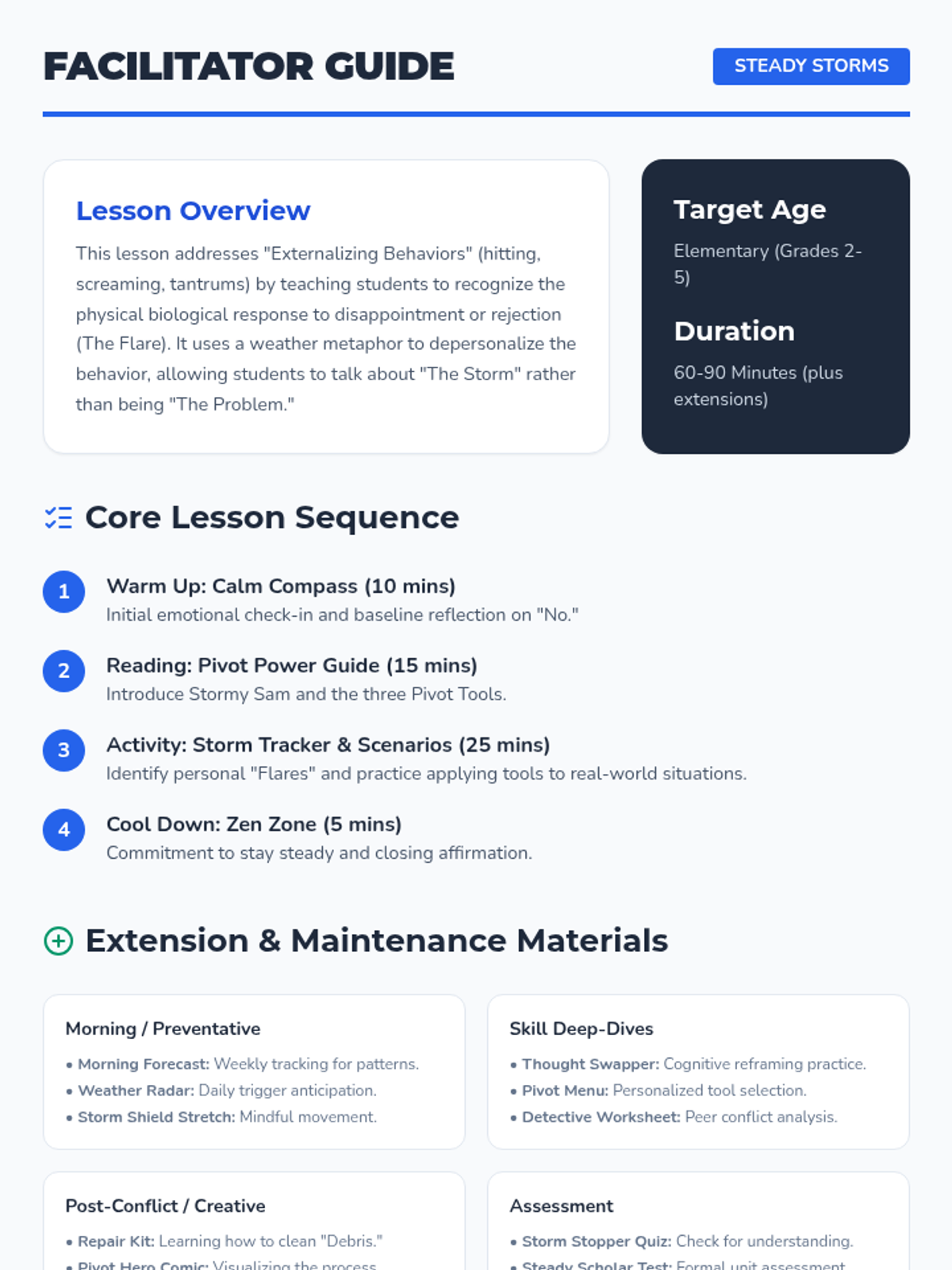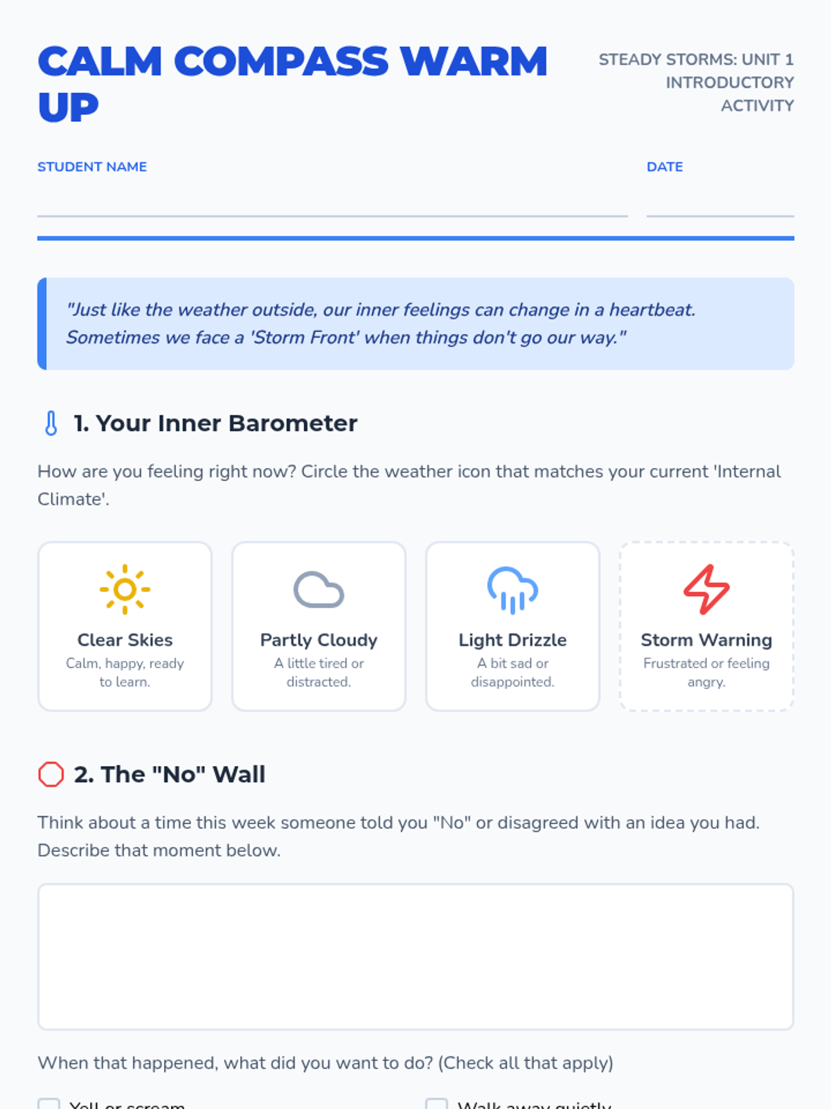 A comprehensive Social-Emotional Learning lesson focused on managing big emotions like anger and sadness when faced with disappointment, rejection, or disagreement. Students learn to identify their 'inner weather' and use 'pivoting' strategies to stay calm.