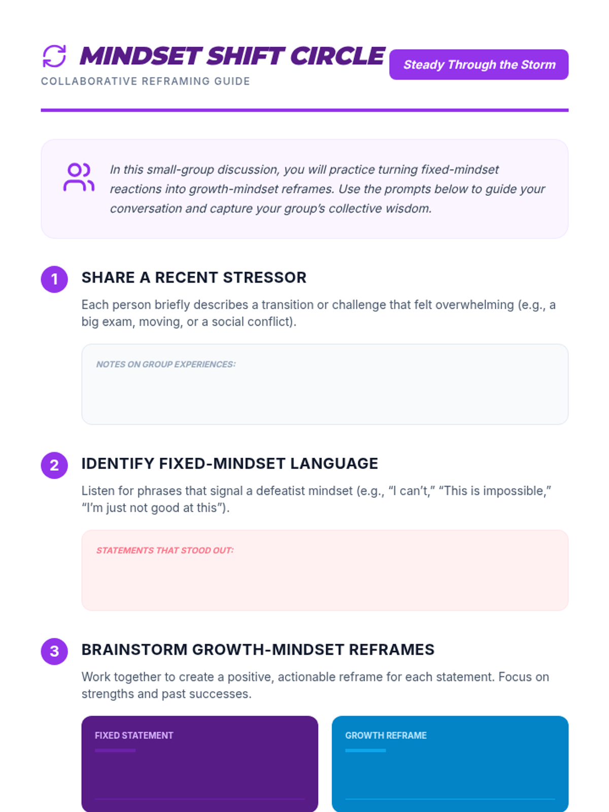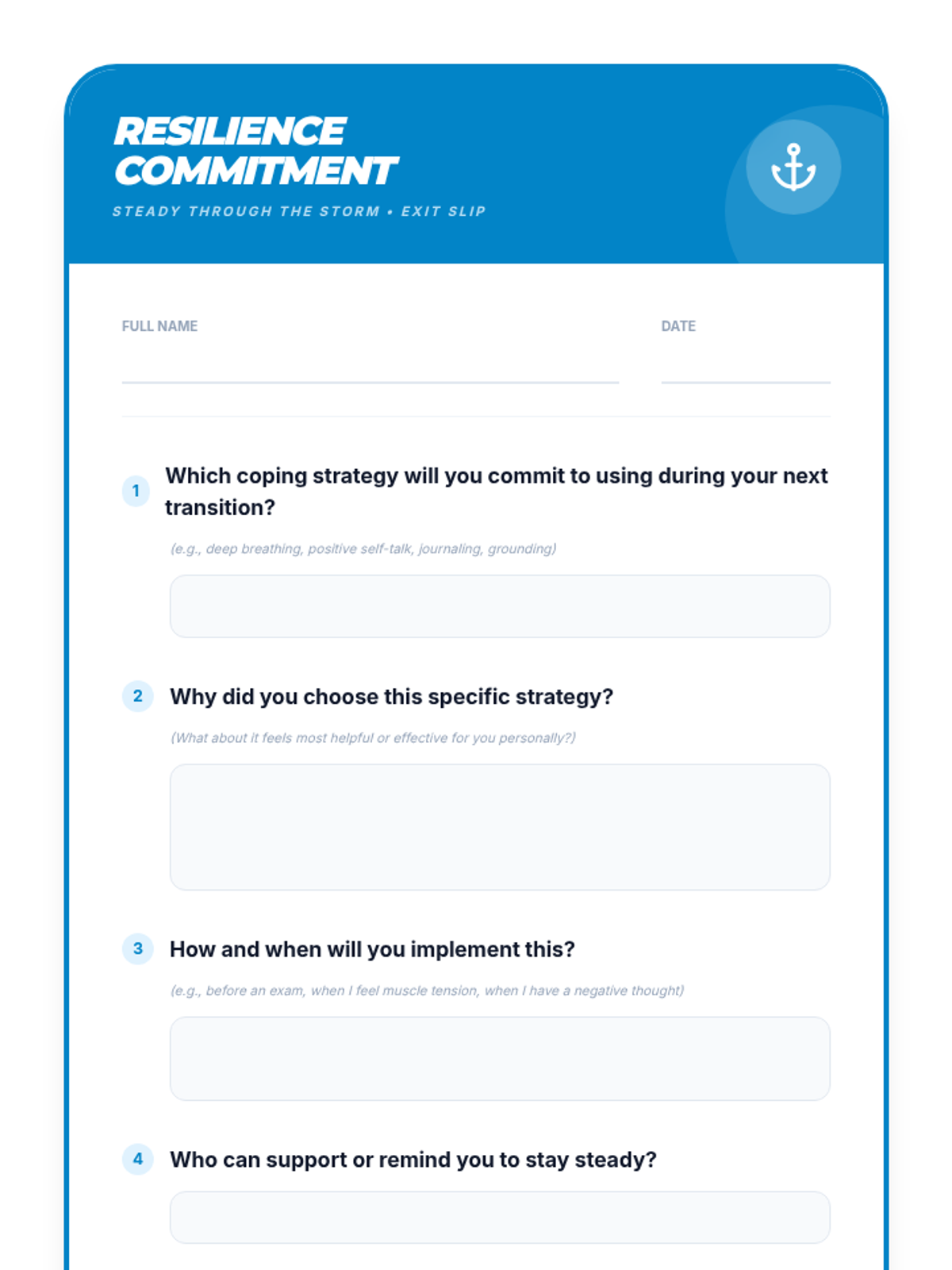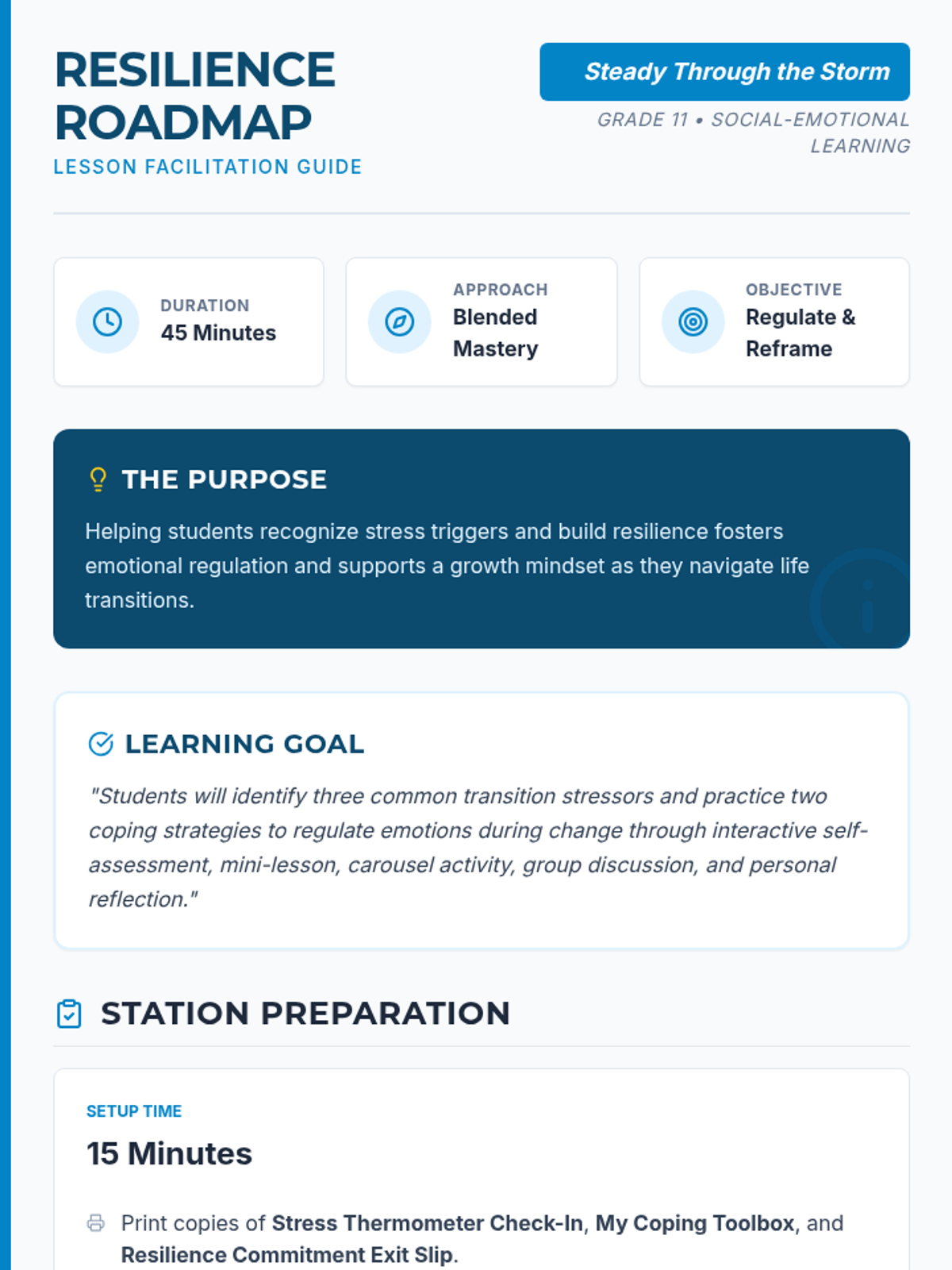 In this 45-minute 11th Grade lesson, students explore common transition stressors and build resilience by learning the brain science behind stress and practicing coping strategies. By identifying stressors and applying practical techniques, they gain emotional regulation tools to navigate change with a growth mindset.